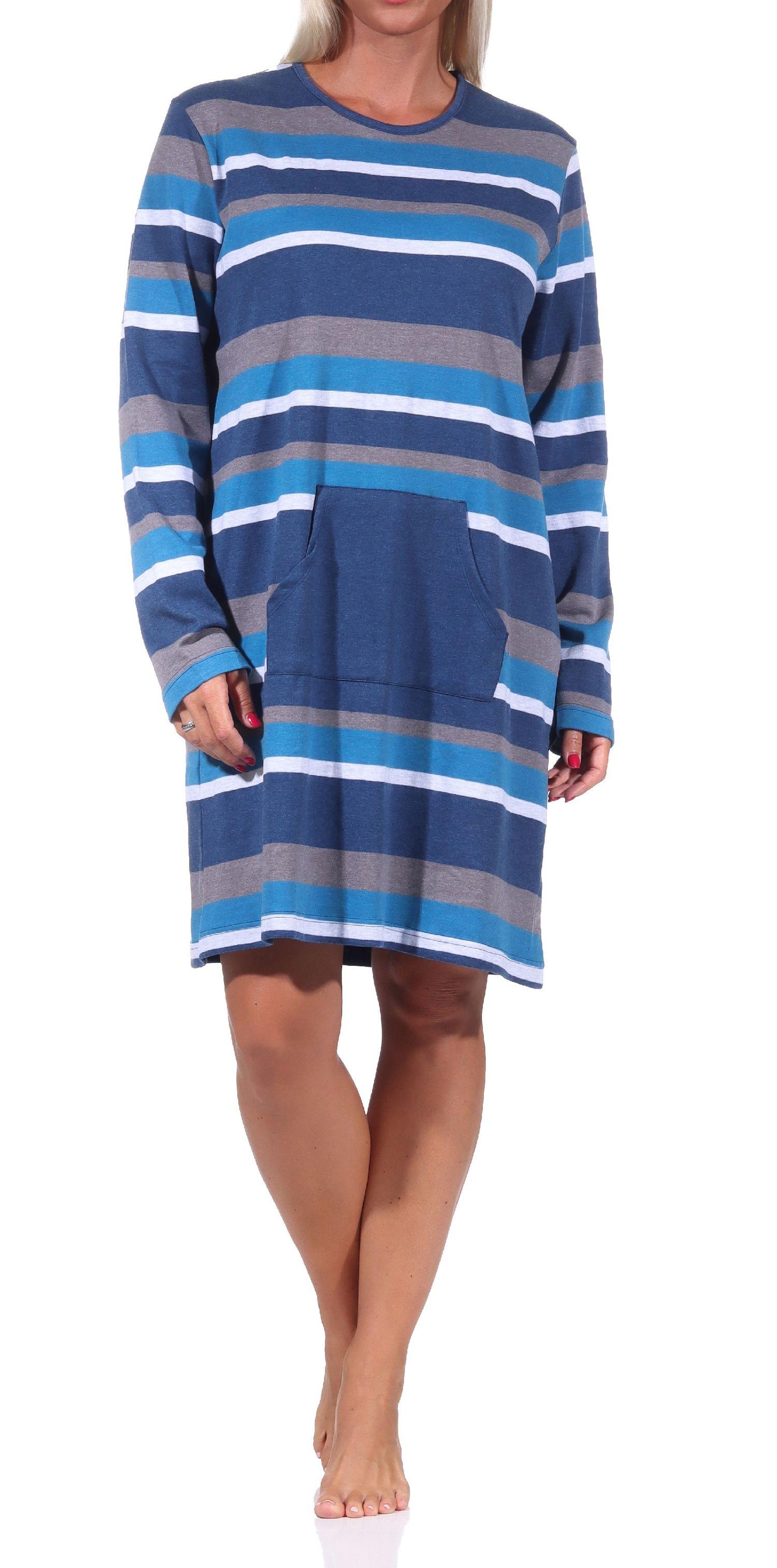 Cooles Damen Kuschel Interlock Nachthemd in Streifenoptik und mit aufgesetzter Tasche