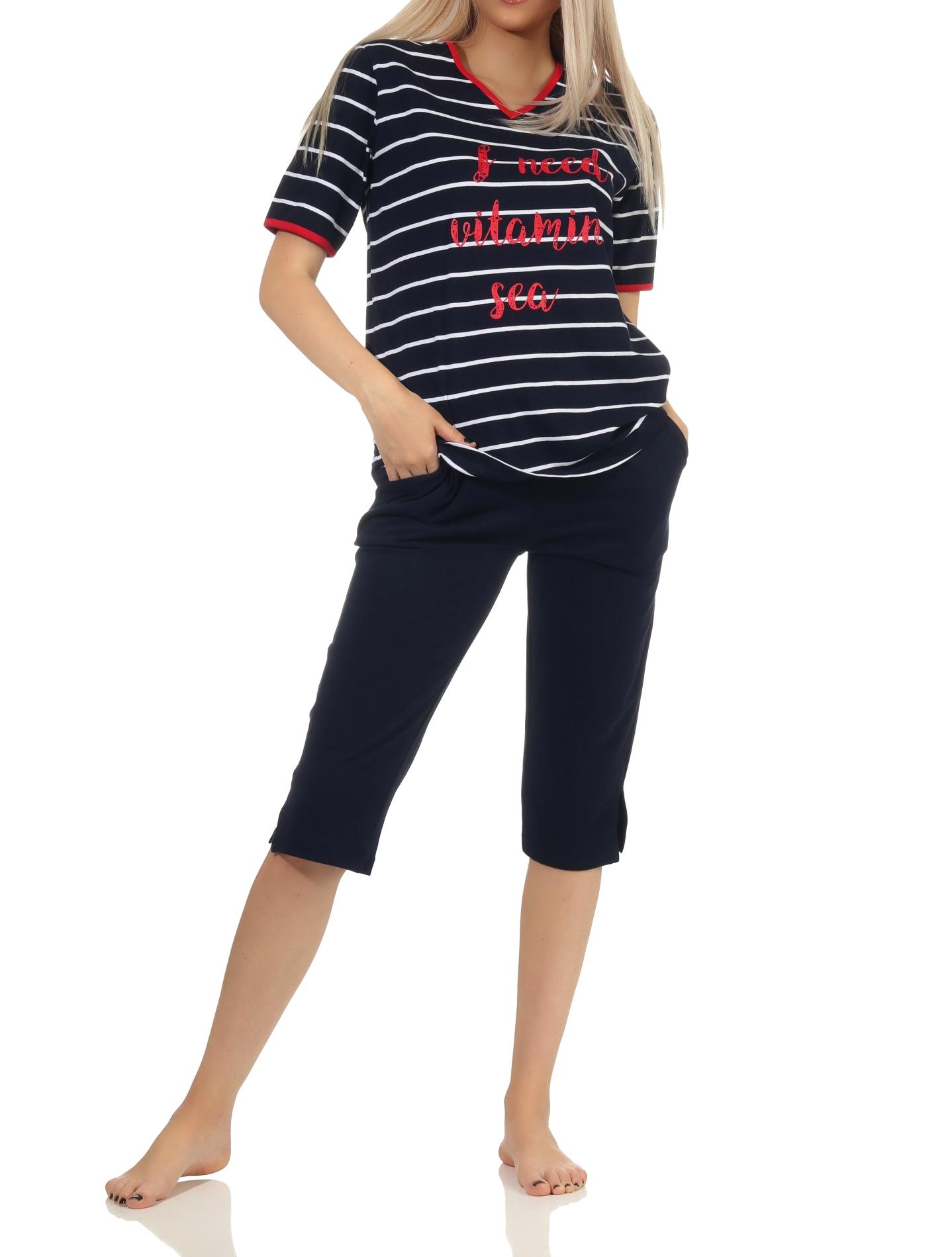 - Damen kurzarm Capri Pyjama in wunderschöner maritimer Streifen Optik und mit Zierspruch als Motiv