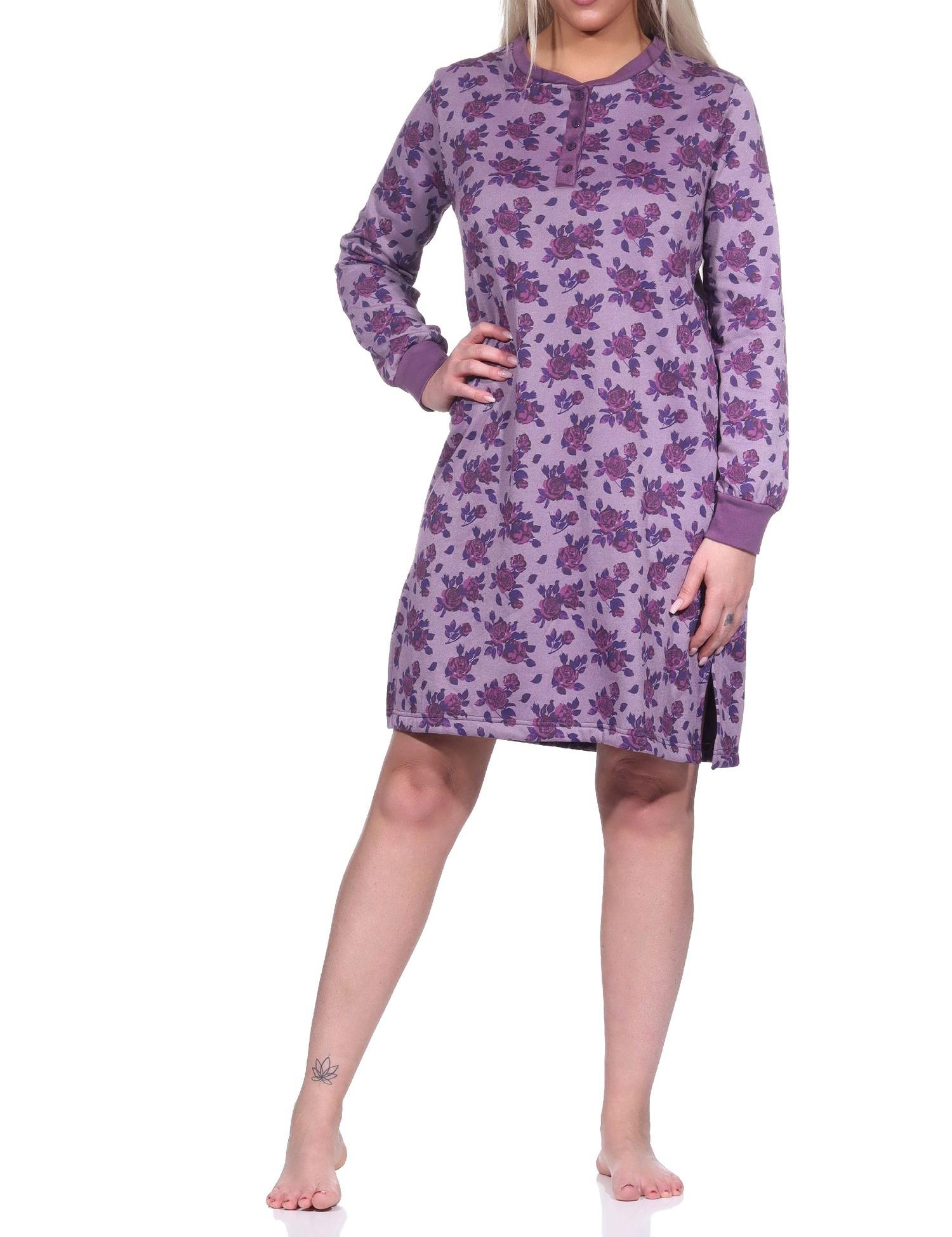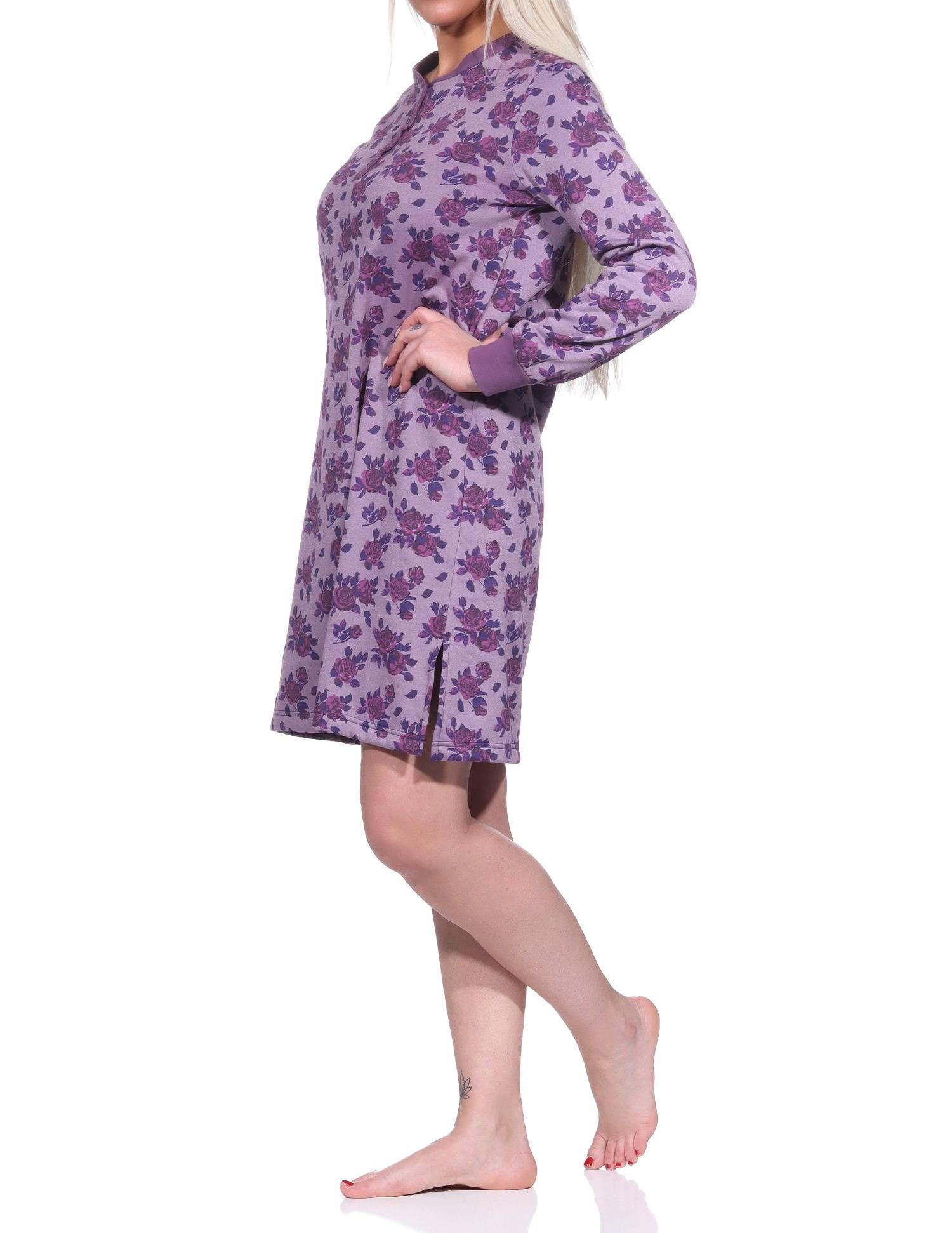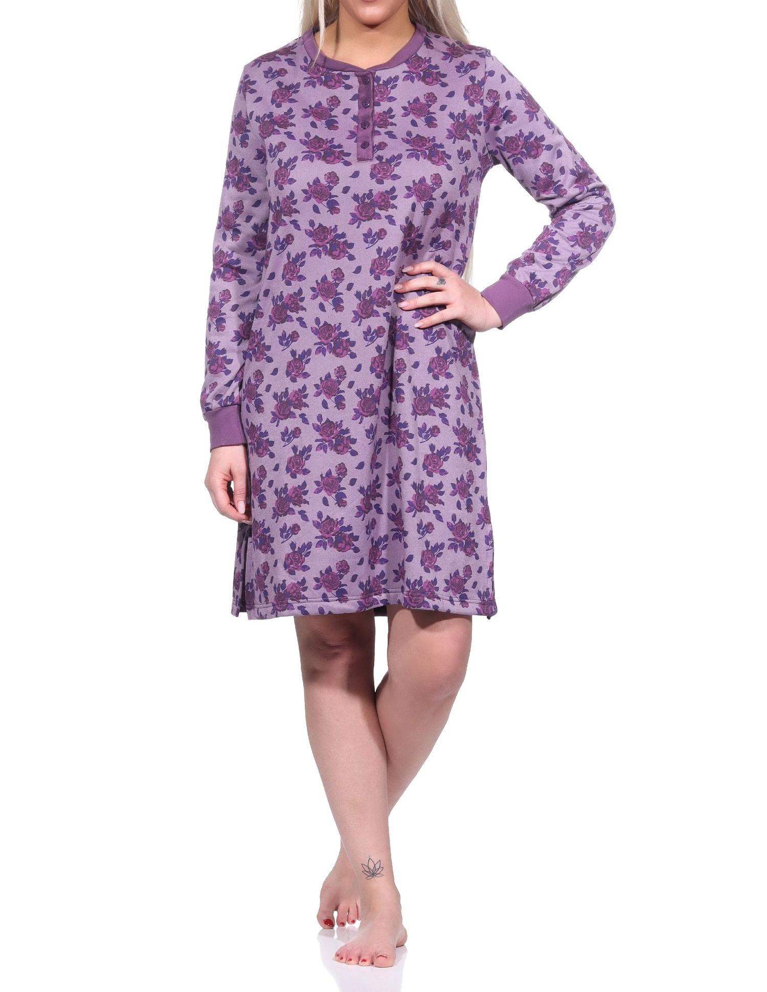 Dieses Damen Frottee Nachthemd langarm mit Bündchen im floralen Design ist etwas ganz Besonderes: so ist der schön flauschig weiche Frottee Stoff auf der Innenseite, die Außenseite des Sleepshirts ist mit einer floralen Blumen Optik allover bedruckt.