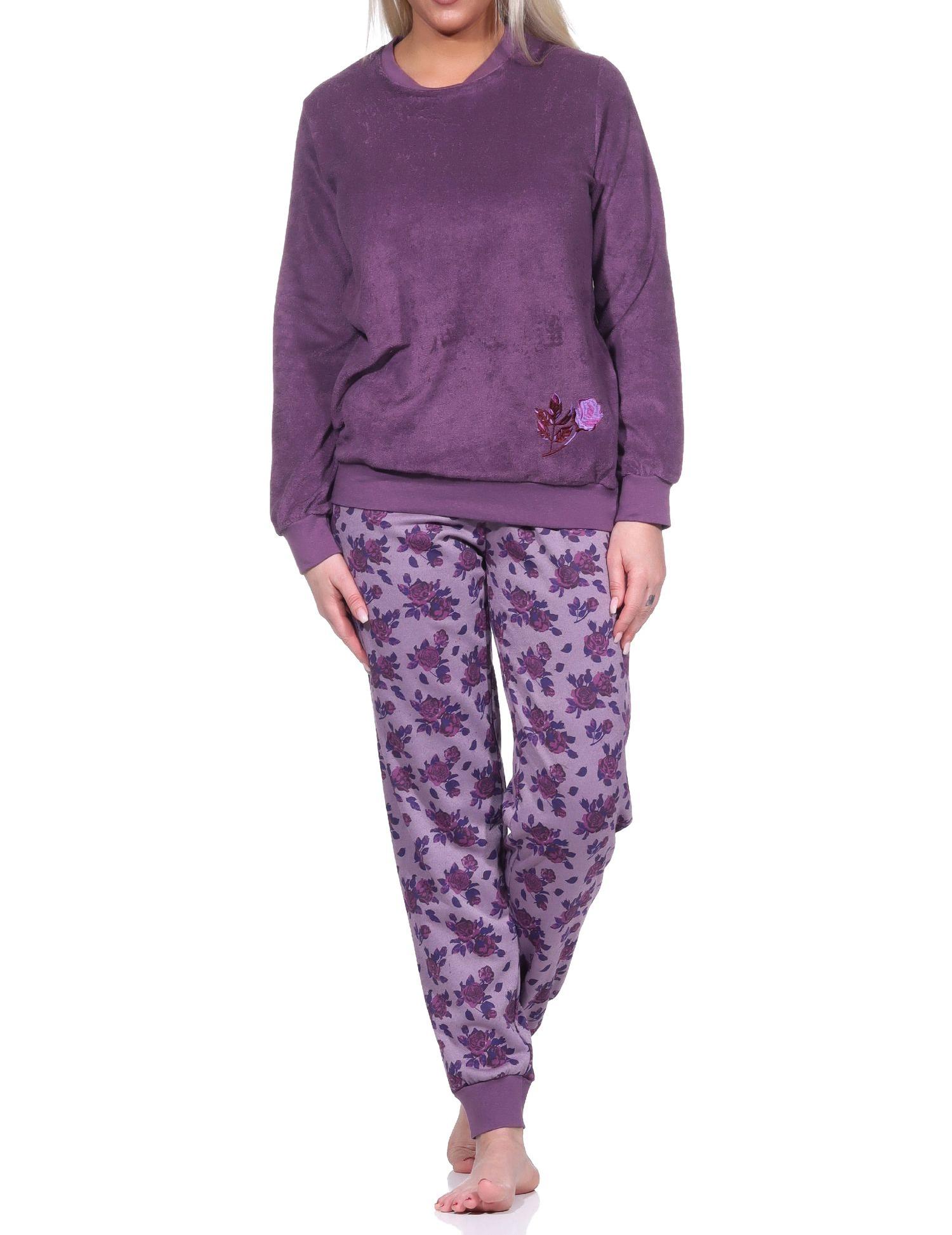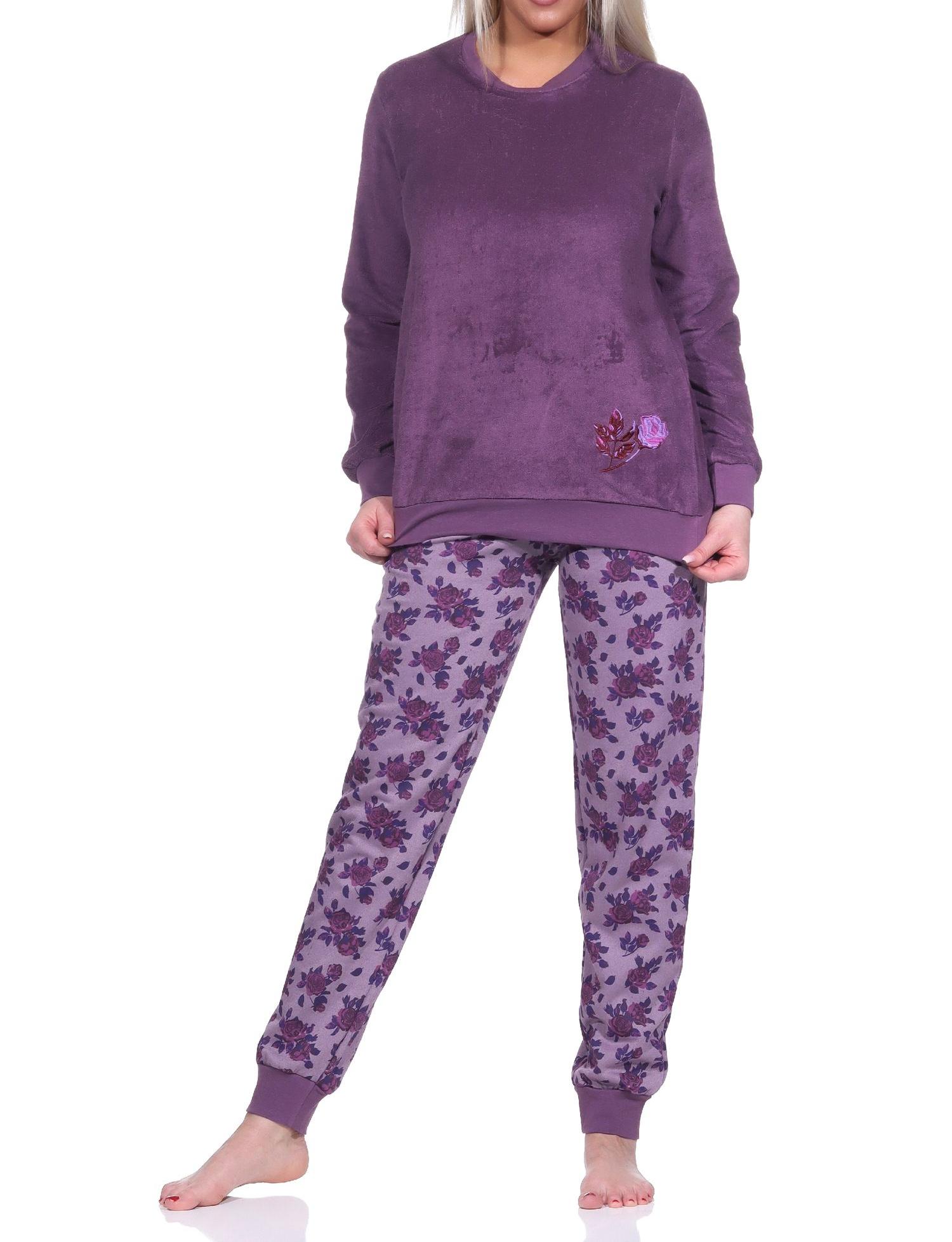 Dieser Damen Frottee Pyjama langarm mit Bündchen im floralen Design ist etwas ganz Besonderes: so ist der schön flauschig weiche Frottee Stoff bei der Hose auf der Innenseite, die Außenseite der Hose ist mit einer floralen Blumen Optik allover bedruckt. Am Oberteil des Damen Frottee Schlafanzugs ist eine Rose als Applikation, die die tolle Optik dieses Pyjamas unterstreicht.