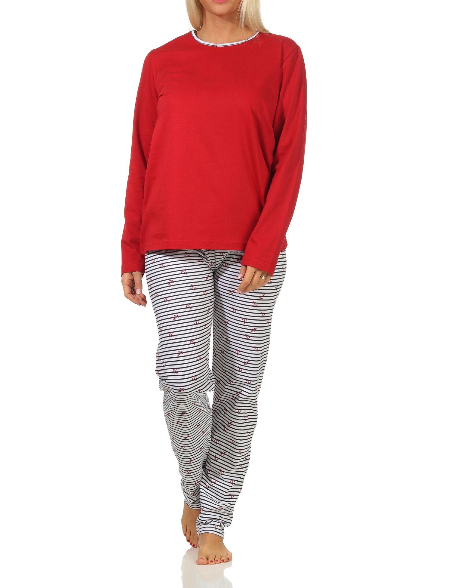 Lust auf Meer? Dann ist dieser wunderschöne maritime Damen Pyjama langarm für Sie die ideale Wahl! So ist die Schlafanzughose in einer tollen maritimen Streifenoptik und hat Anker als Motiv, das Oberteil des Pyjama ist unifarben.