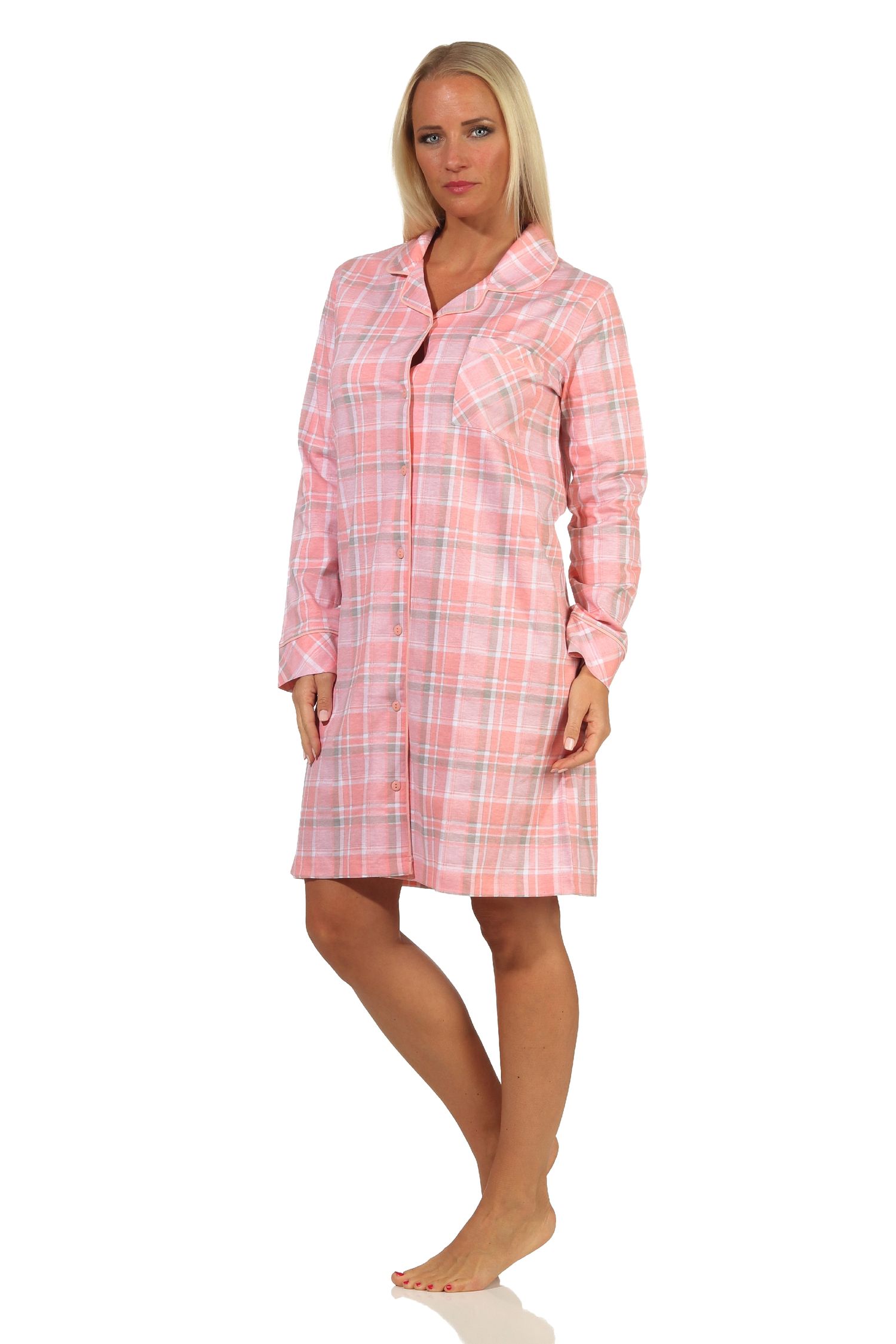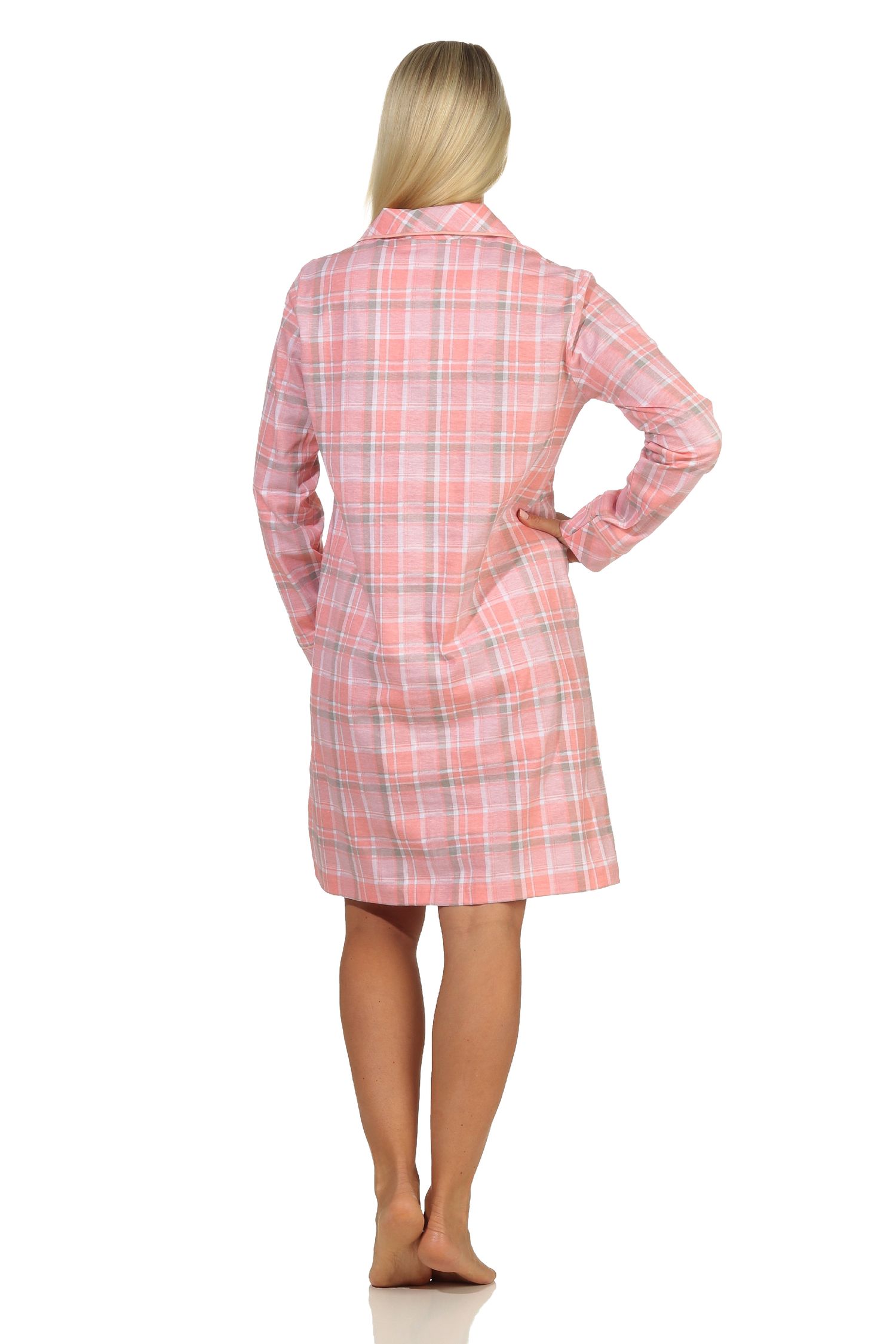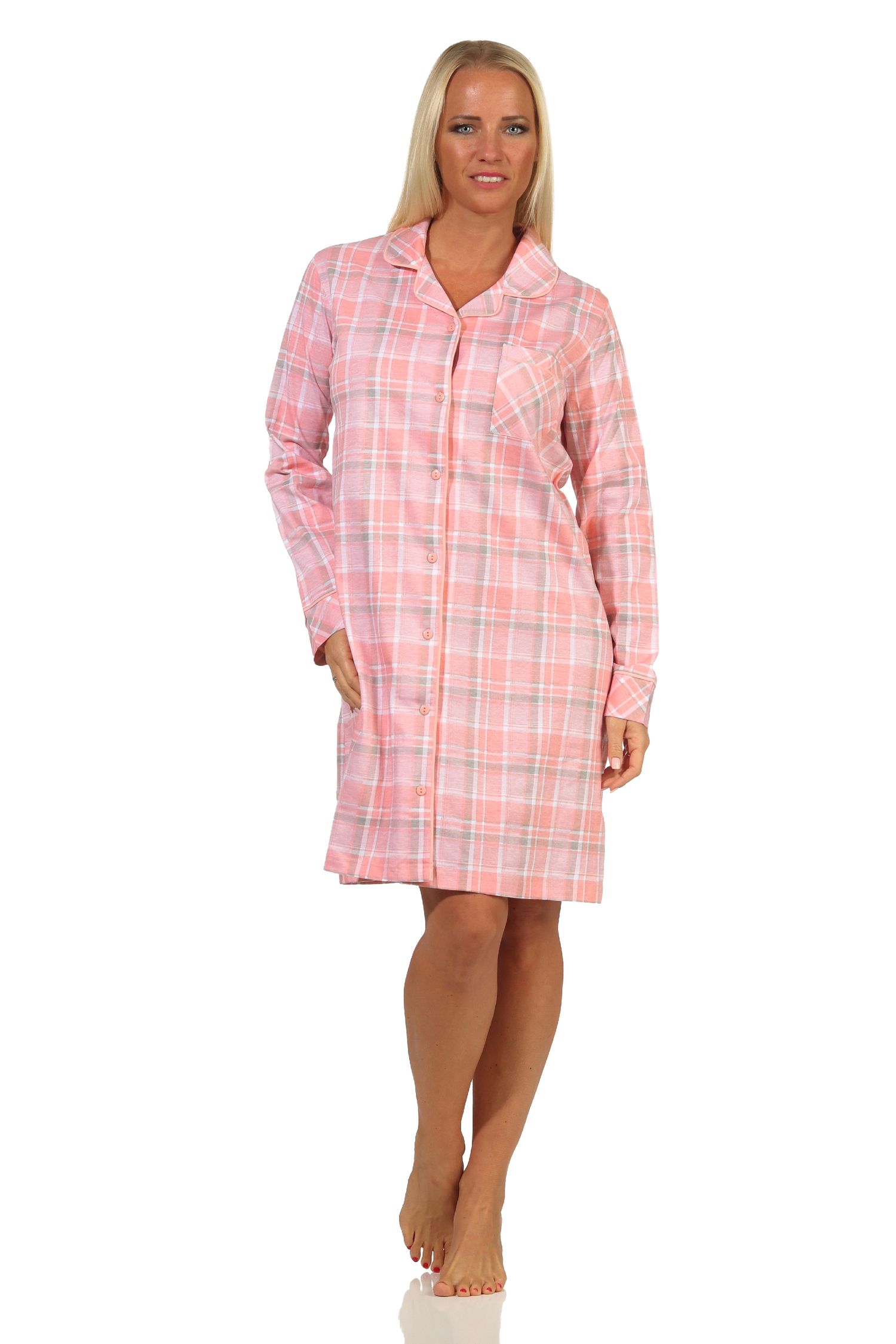 - langarm Damen Nachthemd zum durchknöpfen in karierter Optik, mit Reverskragen und mit Brusttasche