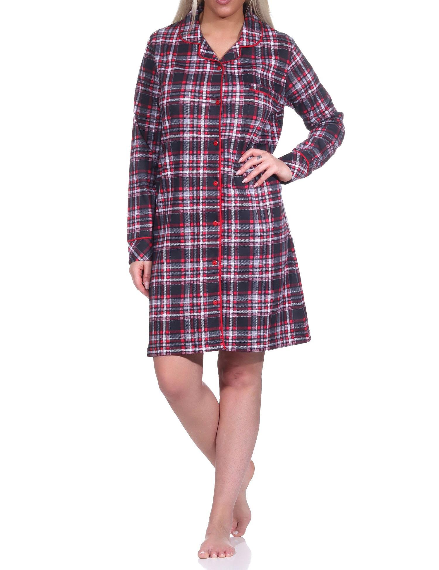 - Langarm Damen Nachthemd mit 95 cm Länge zum durchknöpfen in karierter Optik, mit Reverskragen und mit Brusttasche