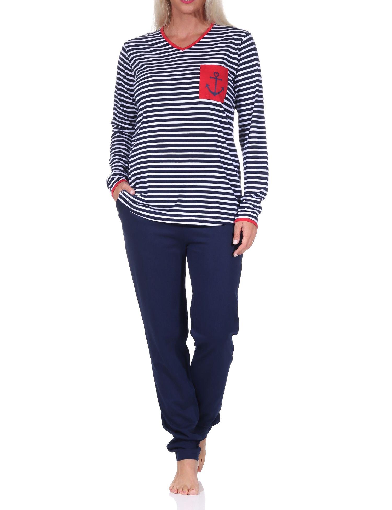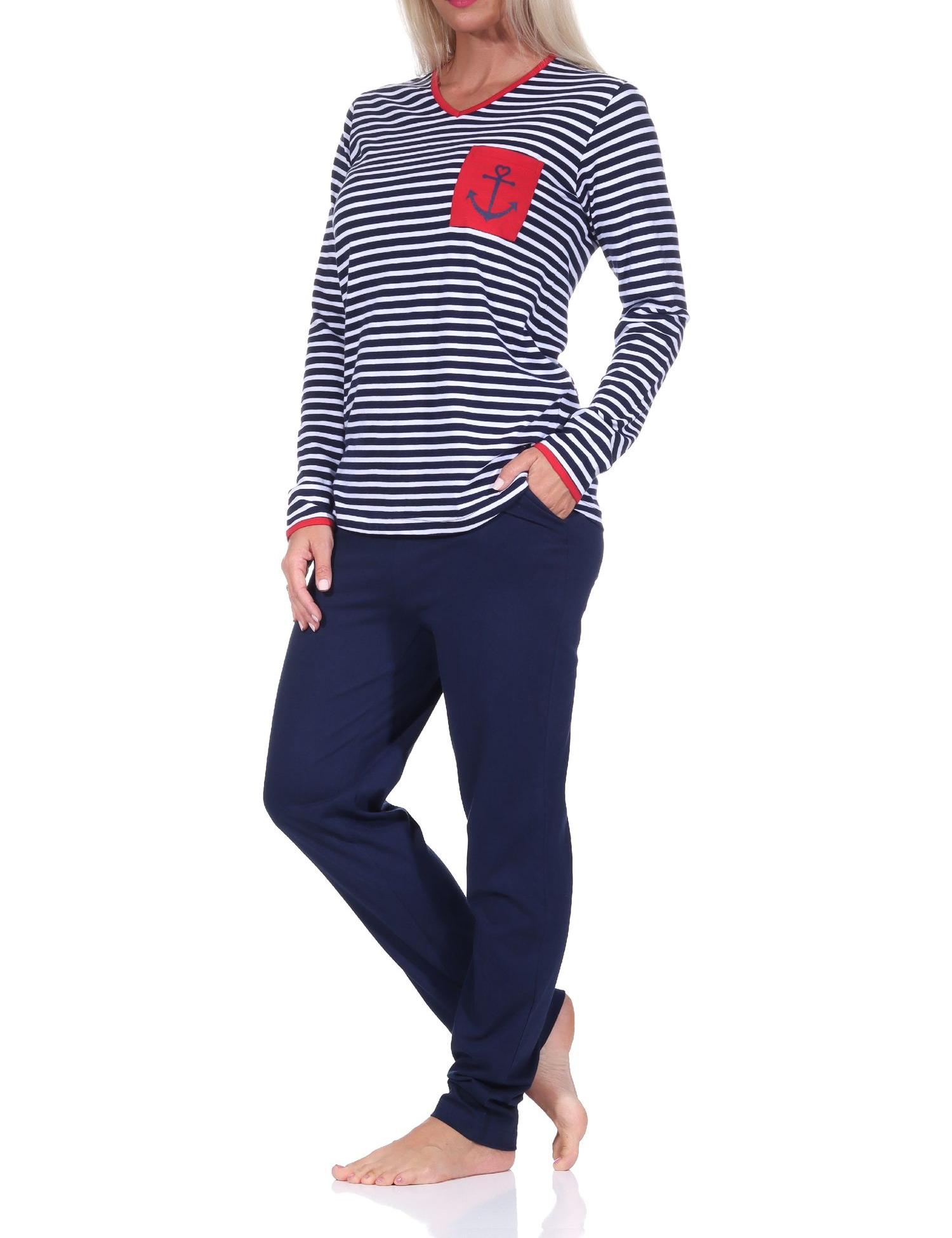 - langärmliger Damen Pyjama in wunderschöner maritimer Streifen Optik und mit Anker als Motiv