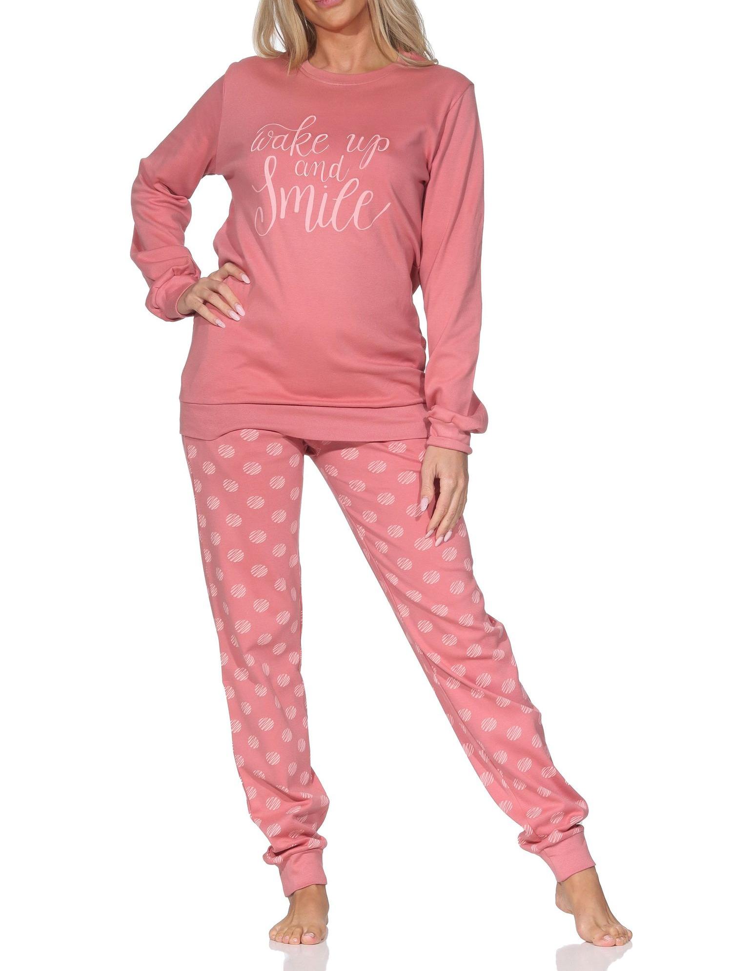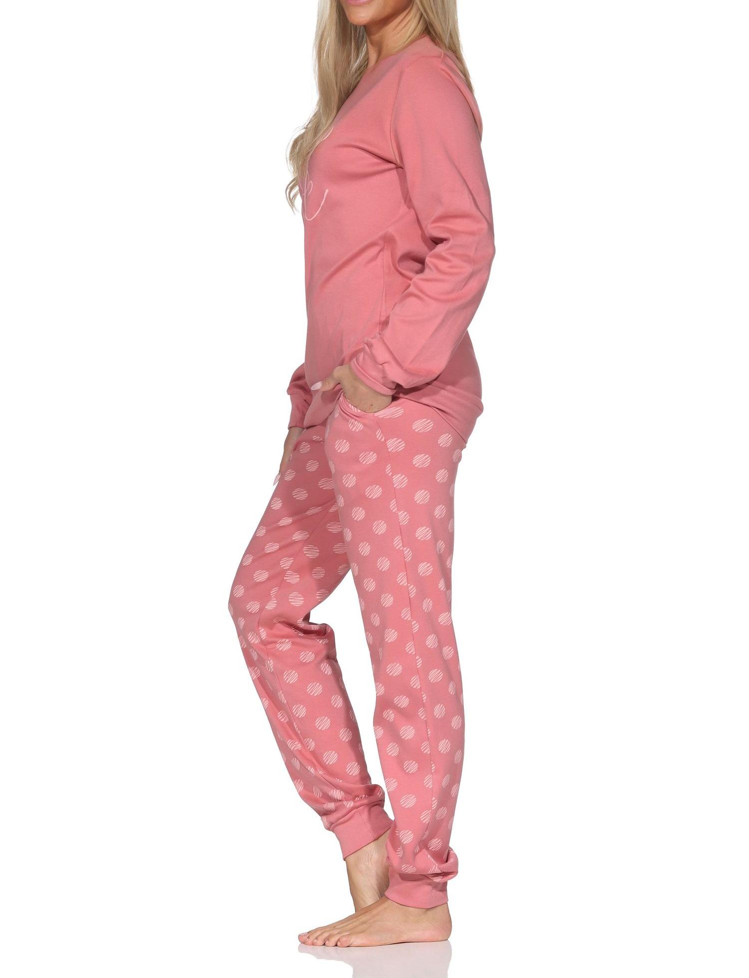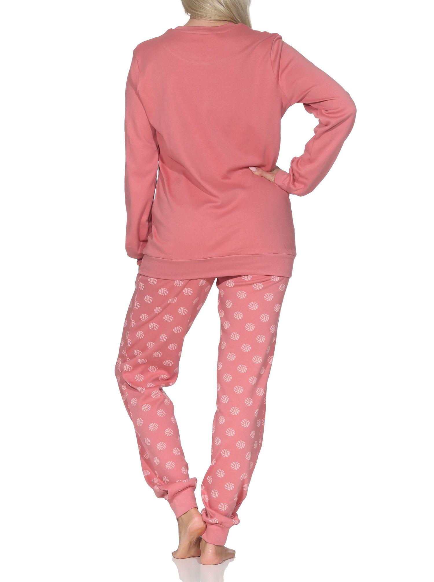 Normann Damen Schlafanzug lang mit Bündchen in Kuschel Interlock Qualität in Tupfen – Punkte Optik