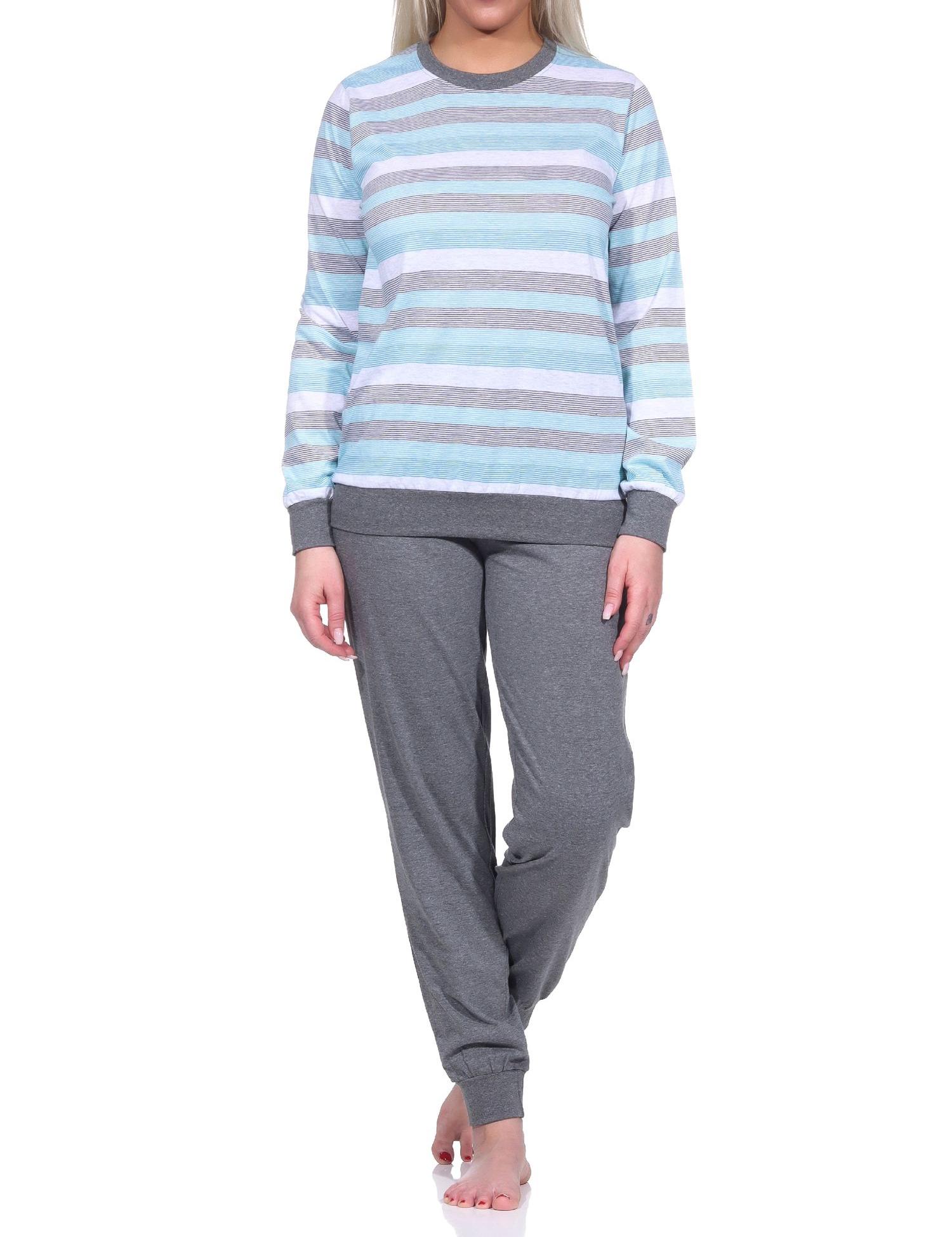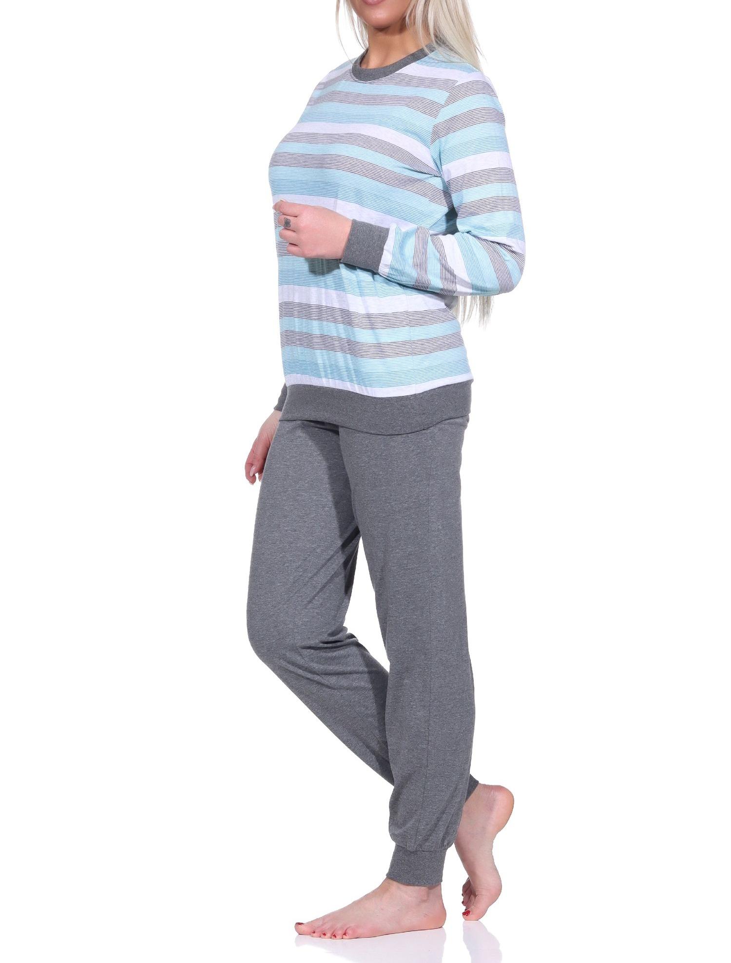 Damen Schlafanzug langarm mit Bündchen Pyjama in Blockstreifenoptik - auch in Übergrössen
