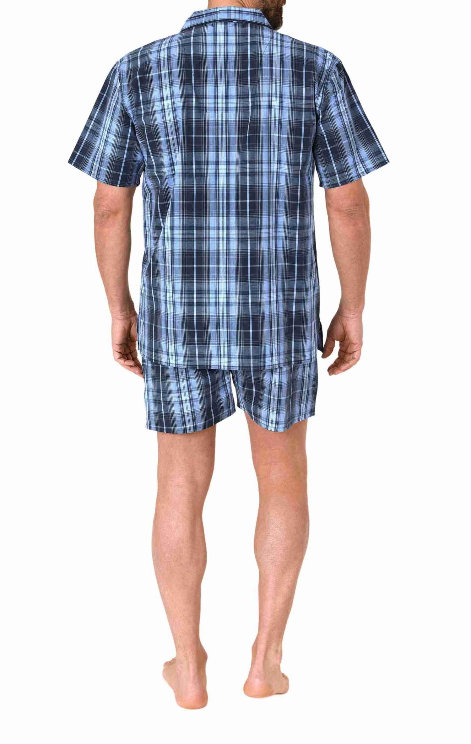 - KLASSISCHES DESIGN: Hochwertiger kurzarm Herren Schlafanzug Shorty aus gewebten Stoff zum durchknöpfen, mit Reverskragen, 3 Taschen am Oberteil und 2 Hosentaschen