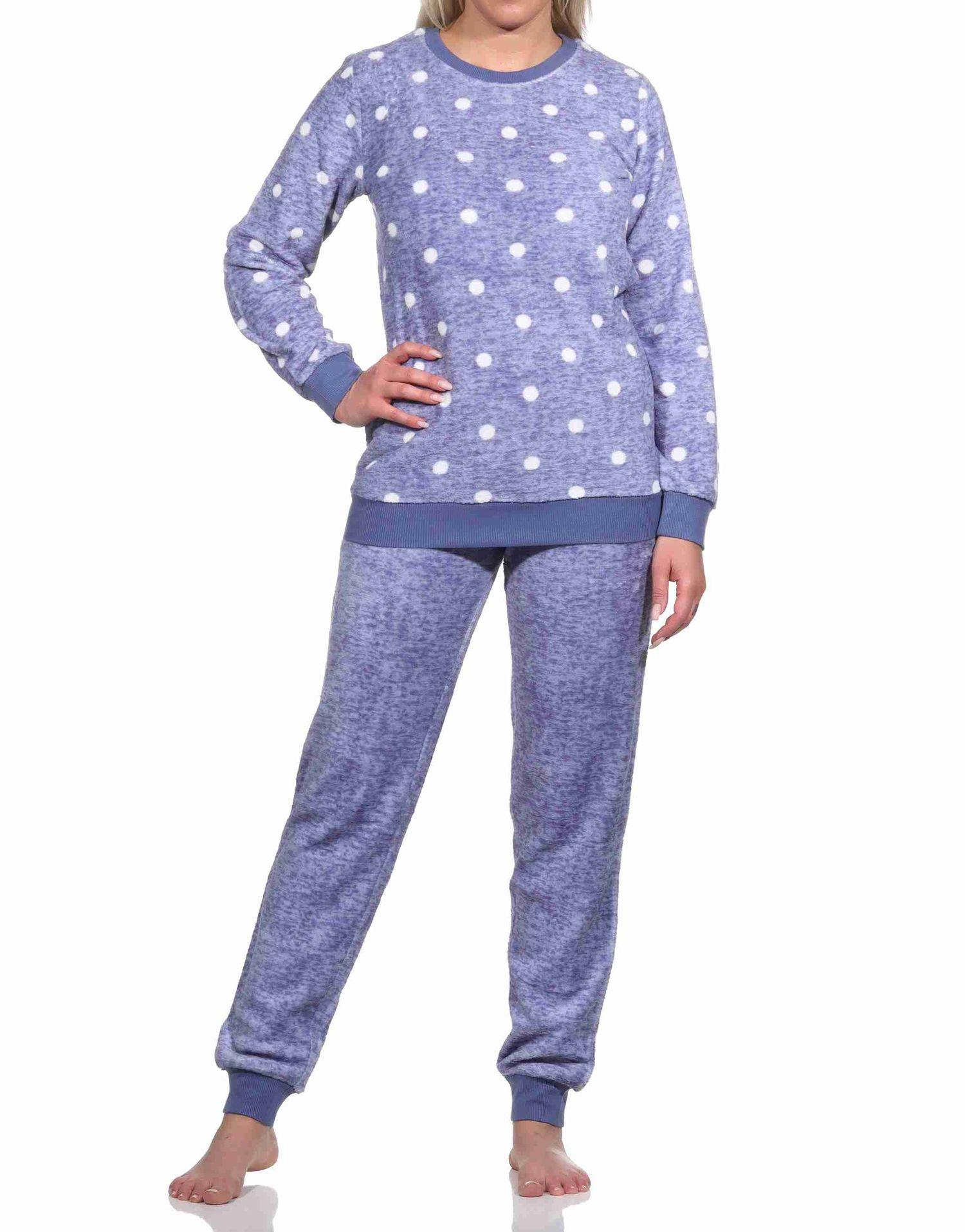 Kuschelig warmer Damen langarm Schlafanzug mit Bündchen aus Coralfleece in Tupfen Optik