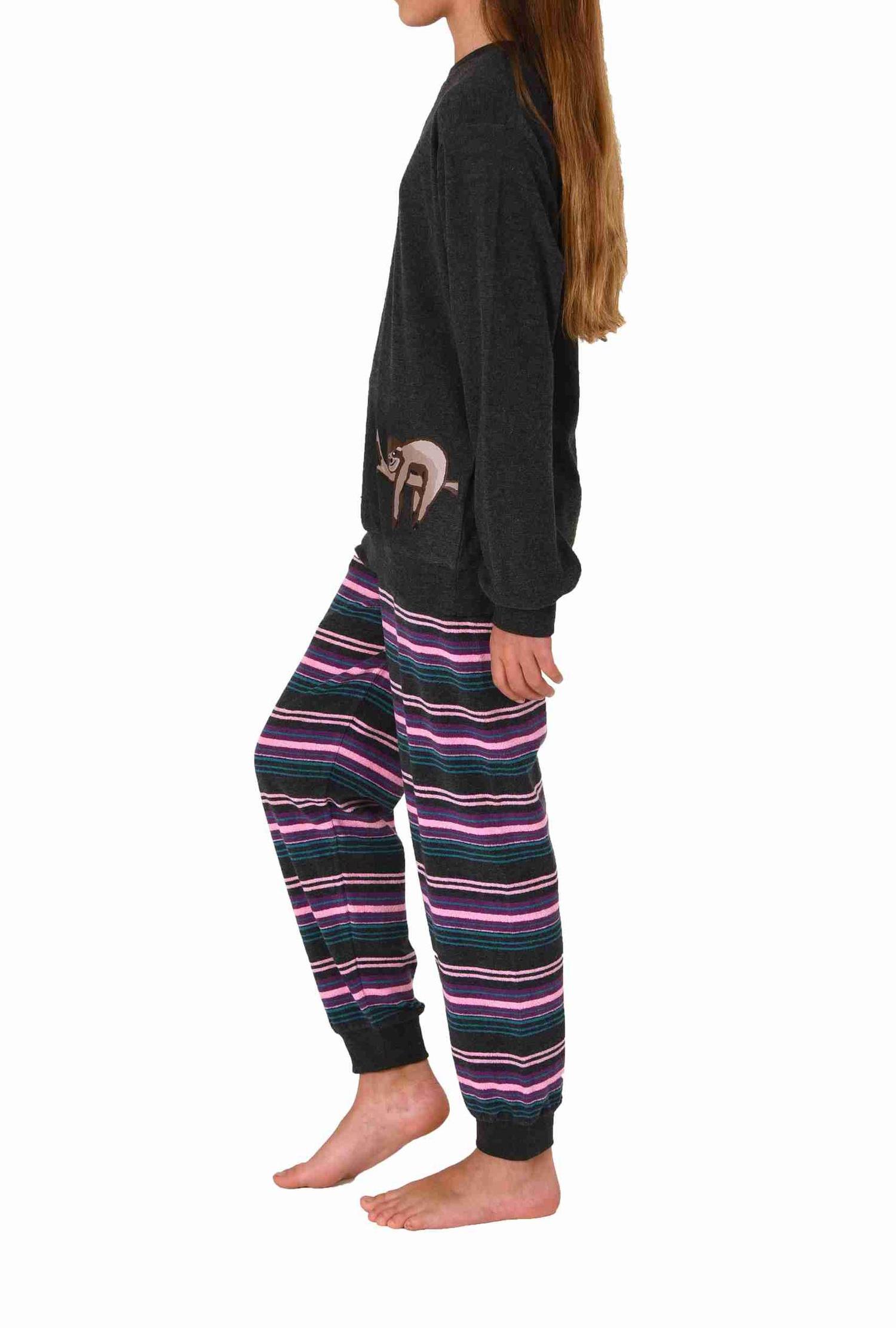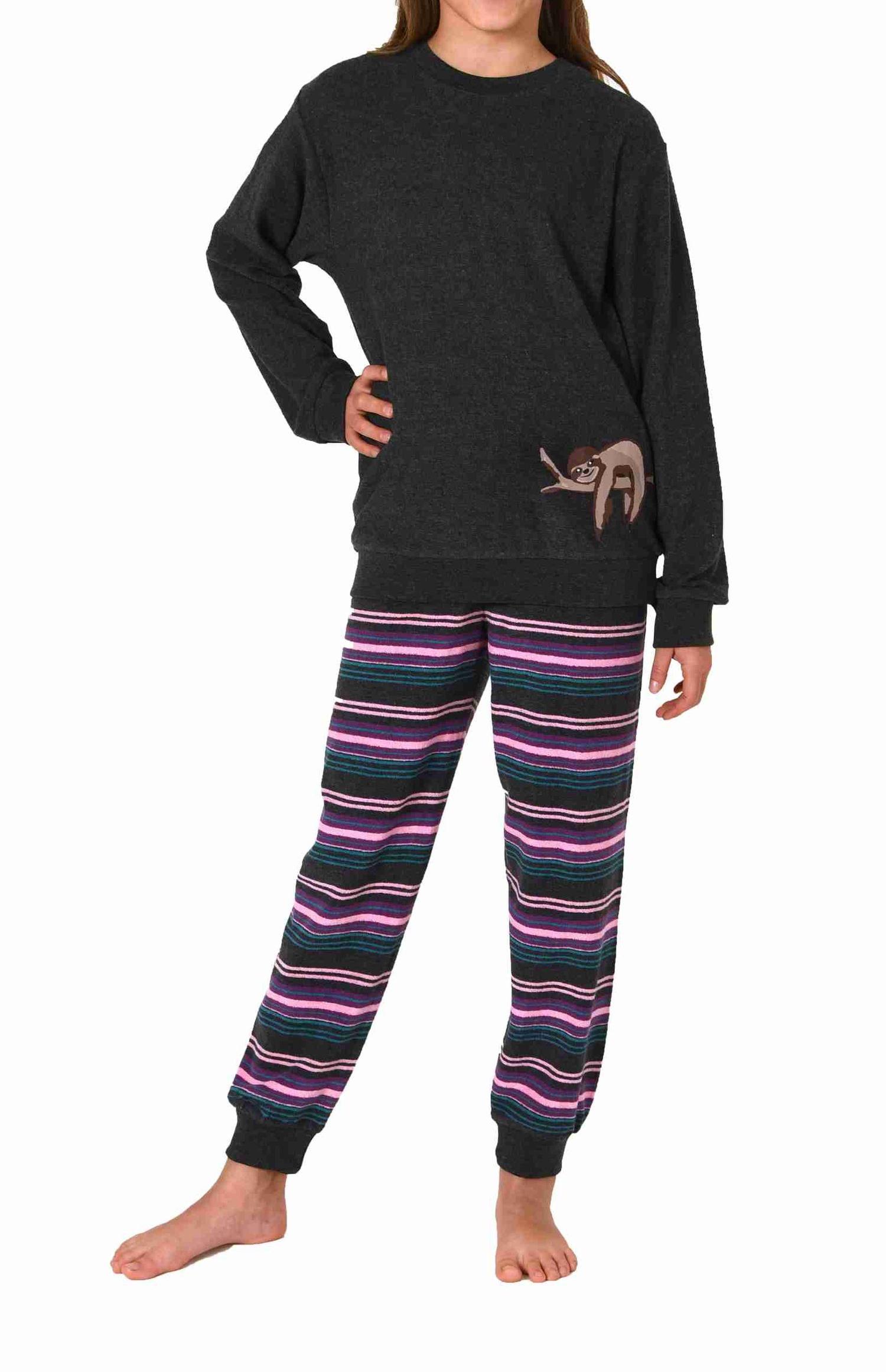 Kuscheliger Mädchen Frottee Schlafanzug langarm mit Bündchen und süssen Faultier Tiermotiv