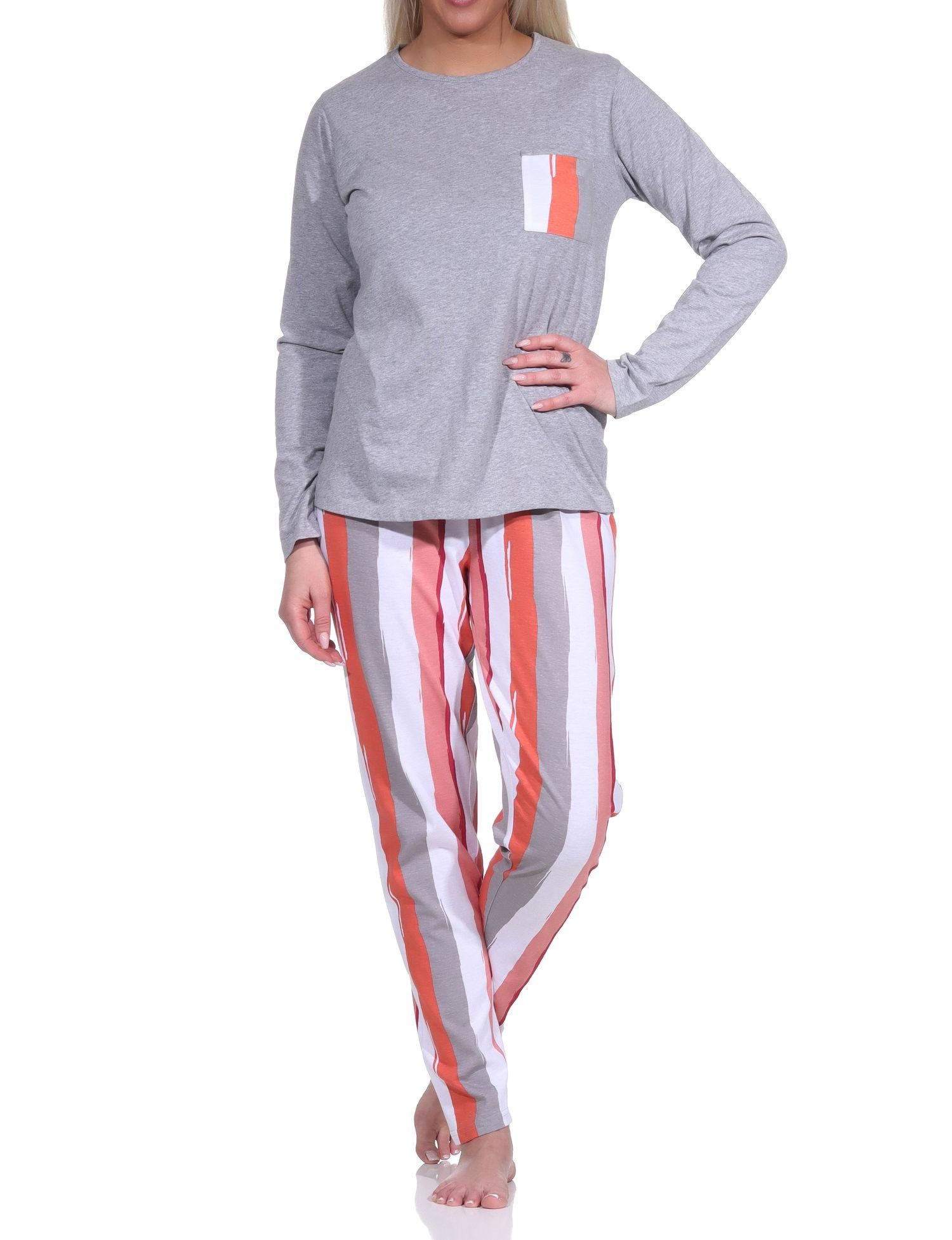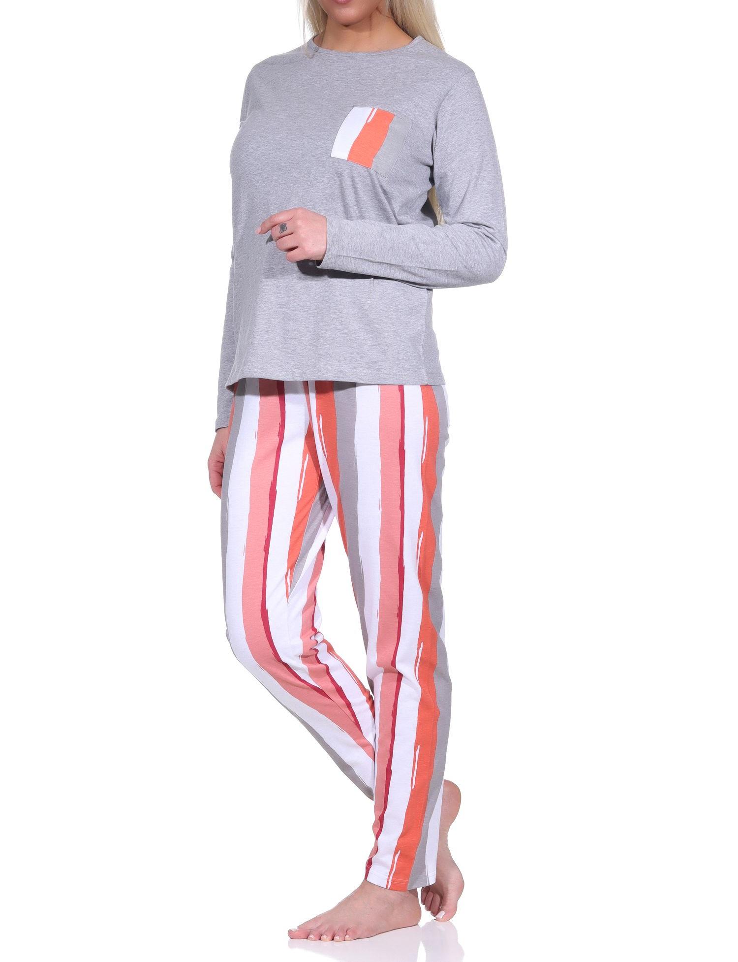 Lässiger Damen Schlafanzug lang mit tollem Farbzusammenspiel - Blumen / Streifen-Optik