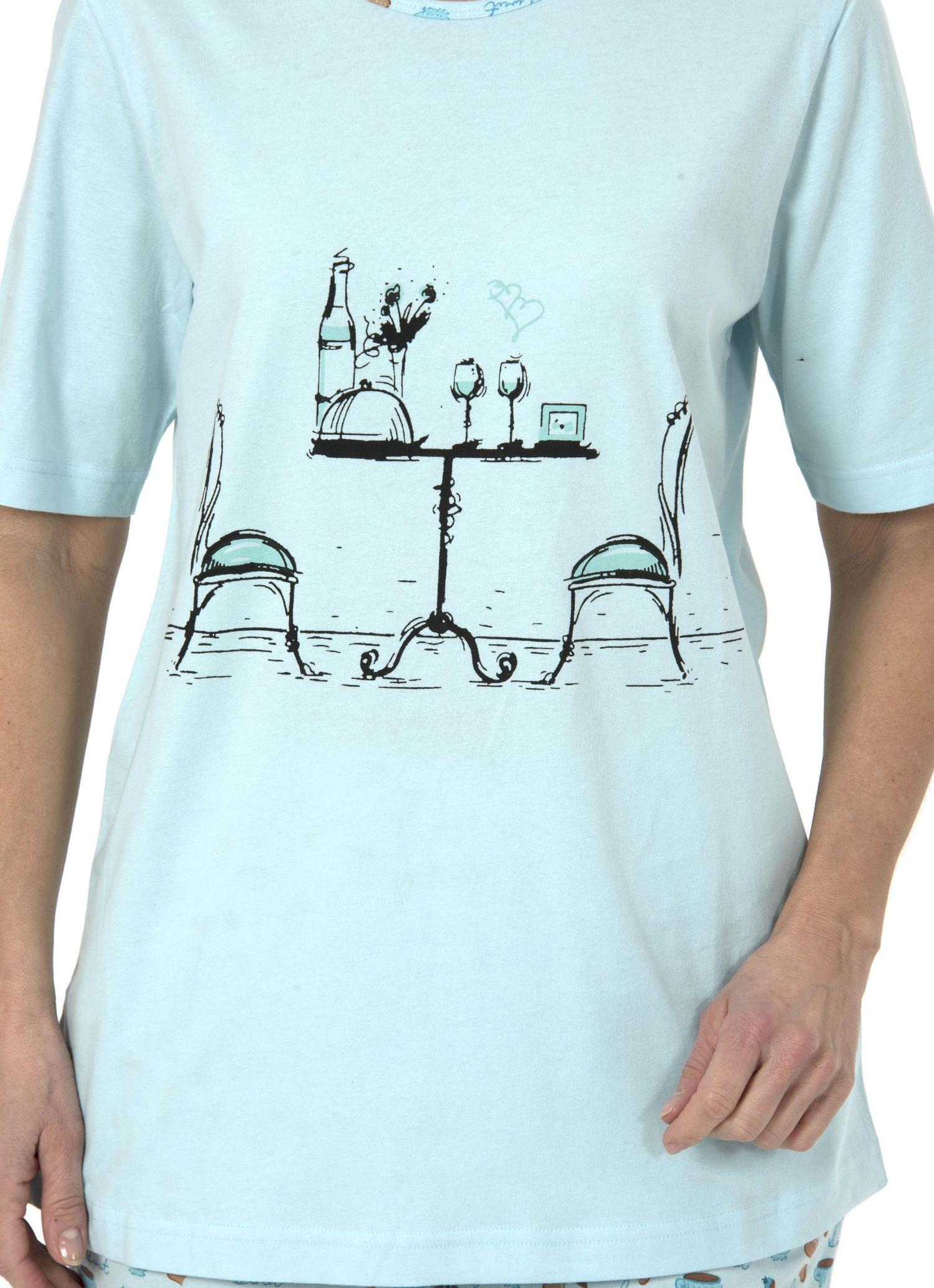 Lässiger Damen Capri Pyjama Schlafanzug halbarm mit kurzer Shorts Hose, der ein süsses Design hat. Die kurze Shortie Pyjamahose des Damen Schlafanzug ist mit einem romantischen Design alloverbedruckt, das kurzarm T-Shirt des Pyjama ist unifarben und hat einen Motivdruck als Design