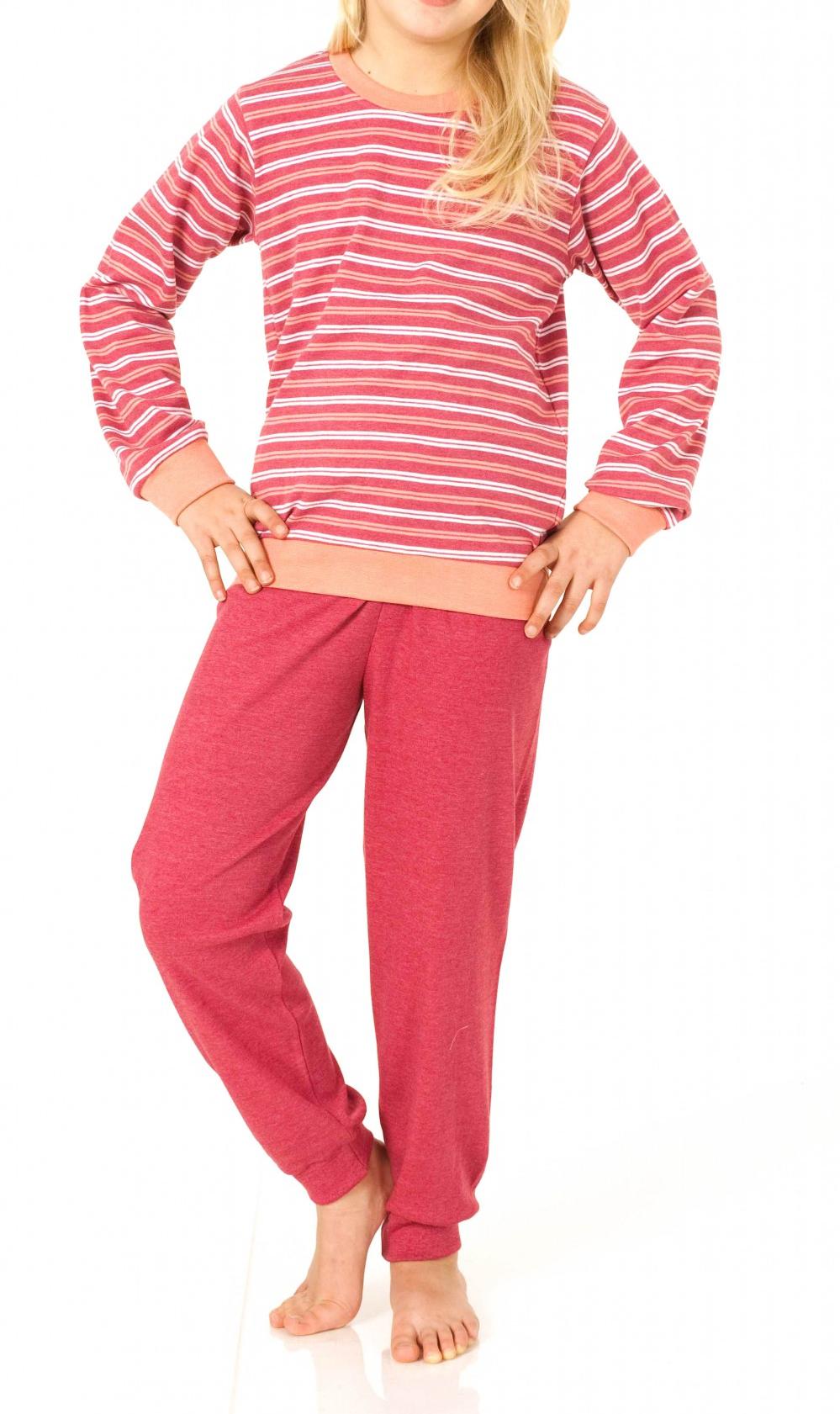 Perfekter Mädchen Kuschel Interlock Pyjama Schlafanzug für kühle Nächte. Dieser kuschelige Pyjama mit Bündchen hat ein geringeltes Oberteil und eine einfarbige Hose. Die Bündchen des Interlock Schlafanzug verhindern, das der Pyjama in der Nacht verrutscht und dadurch die Pyjama Trägerin friert.