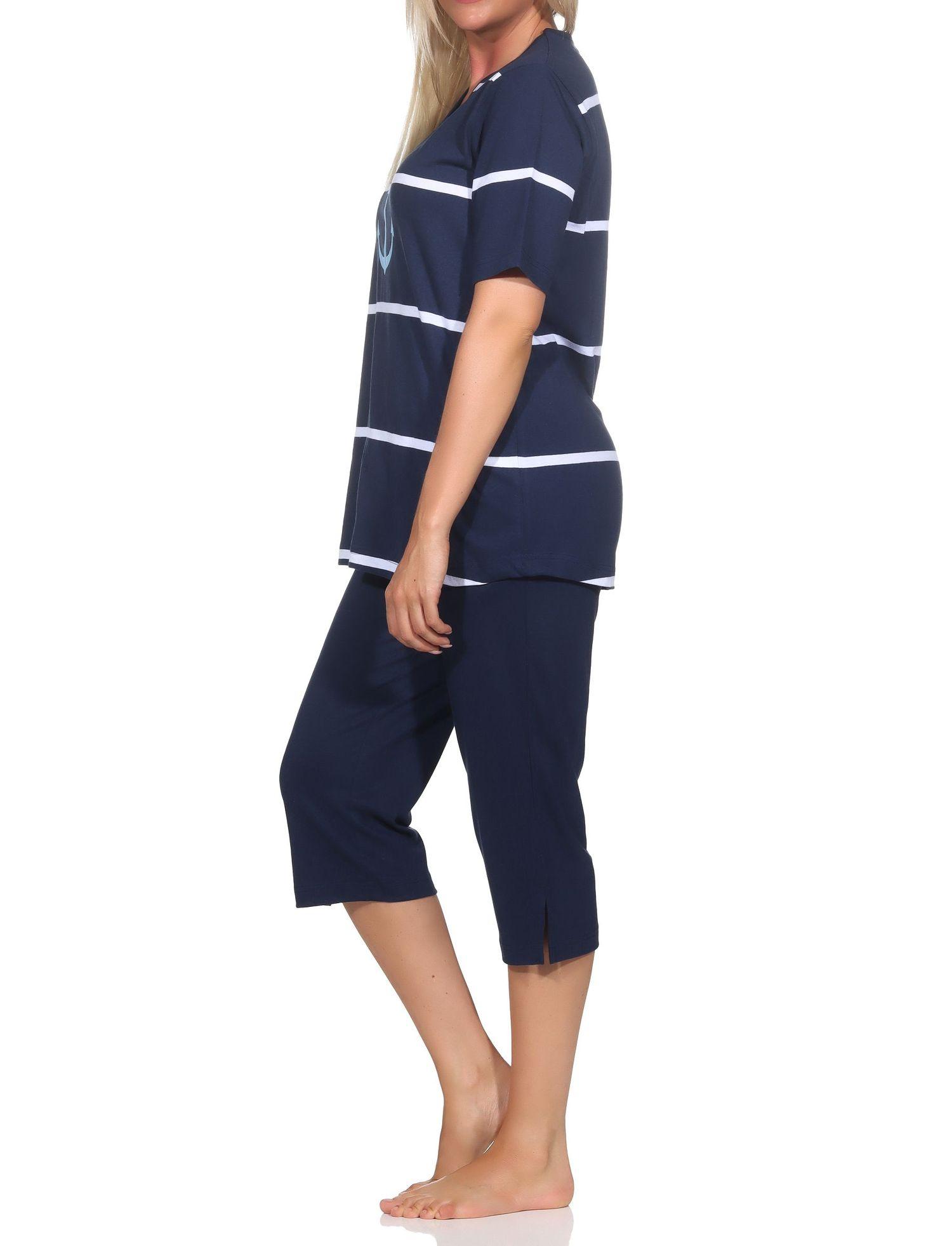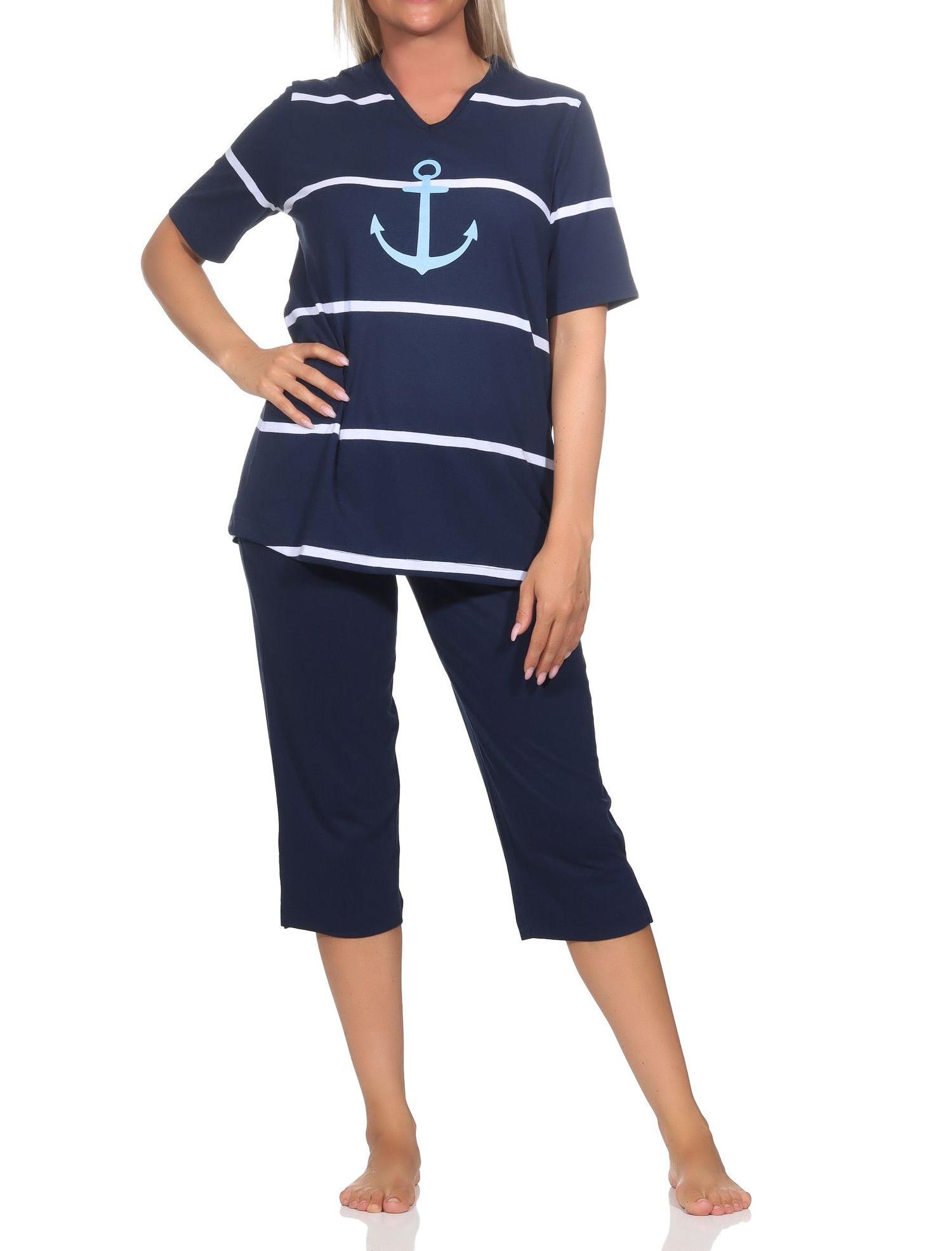 Maritimer Damen kurzarm Capri Schlafanzug Shorty mit Anker Motiv - auch in Übergröße