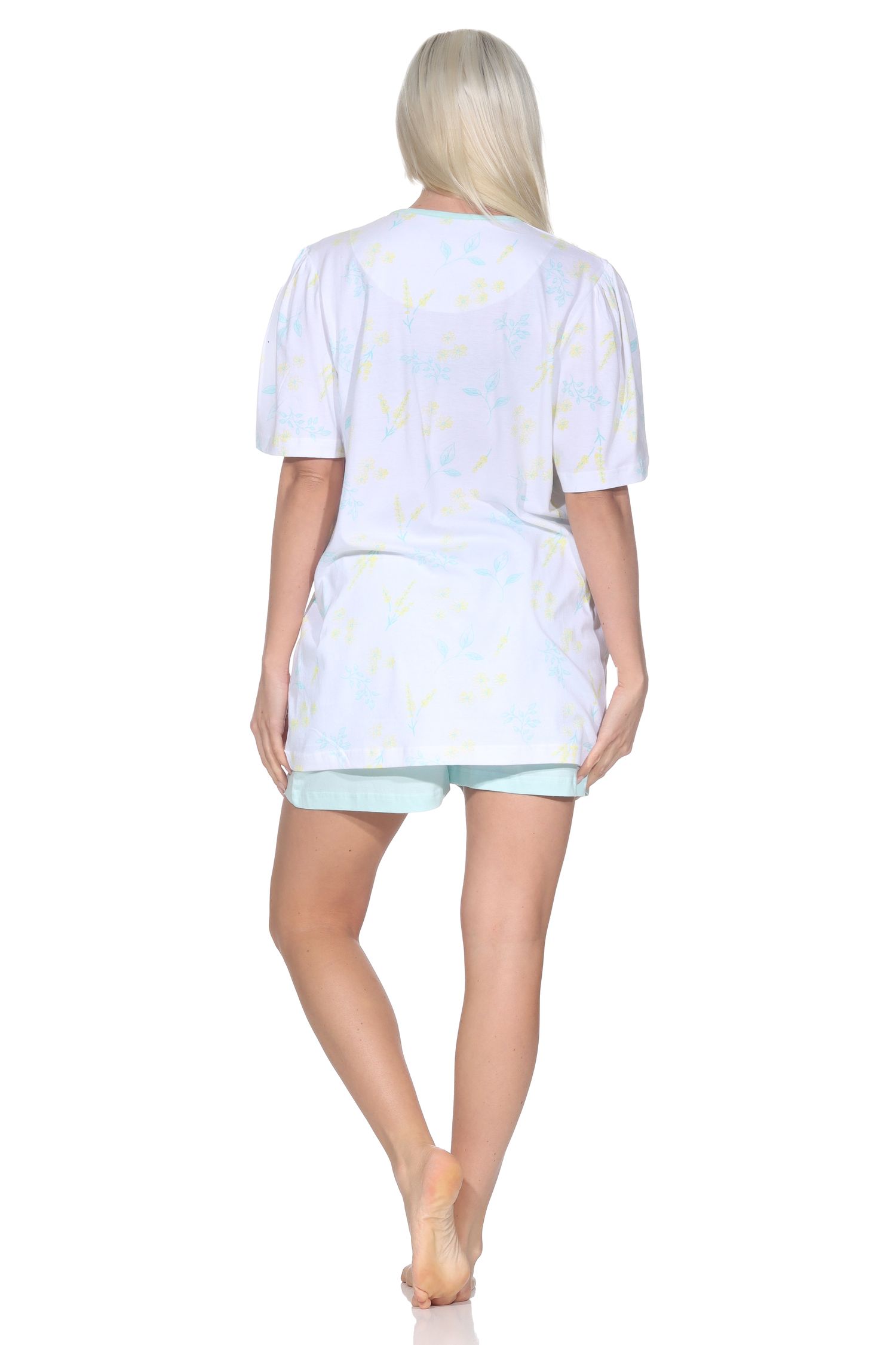 Einfach nur klassisch elegant und zeitlos ist dieser Damen kurzarm Shorty Pyjama von Normann! Das kurzärmlige Oberteil des Schlafanzug ist in einem floralen Design und hat eine Knopfleiste am Halsausschnitt, die unifarbene kurze Shorts Pyjamahose aus elastischen Jersey passt farblich hervorragend zum Oberteil des Schlafanzug.