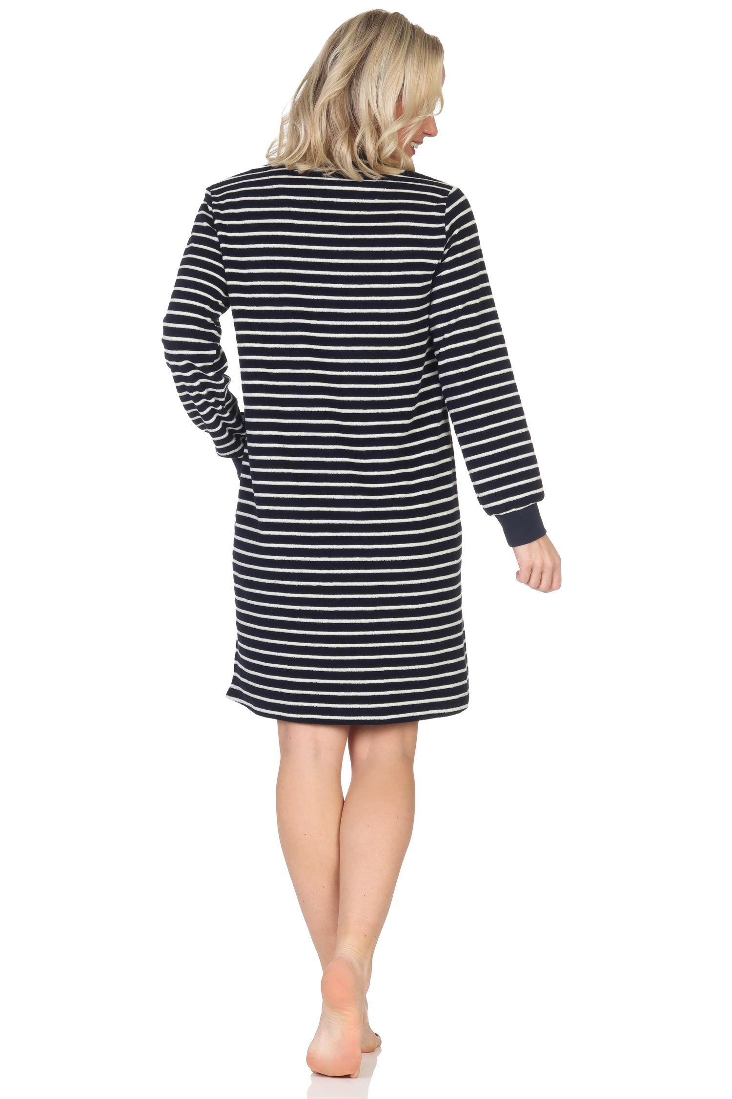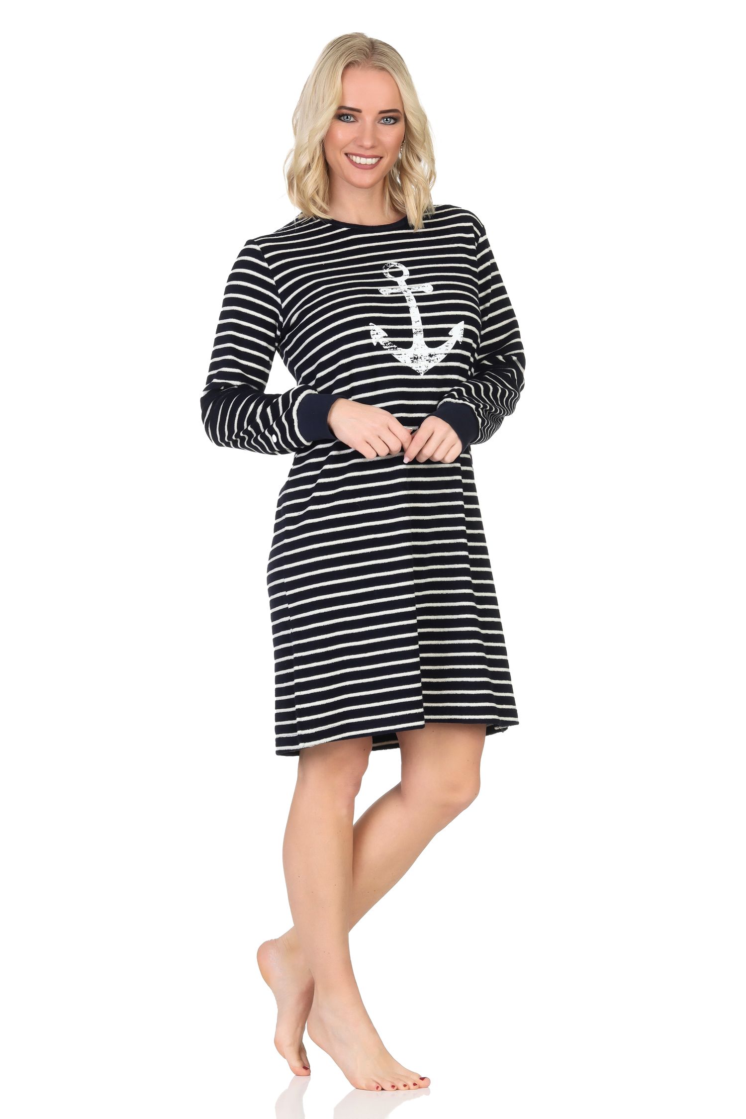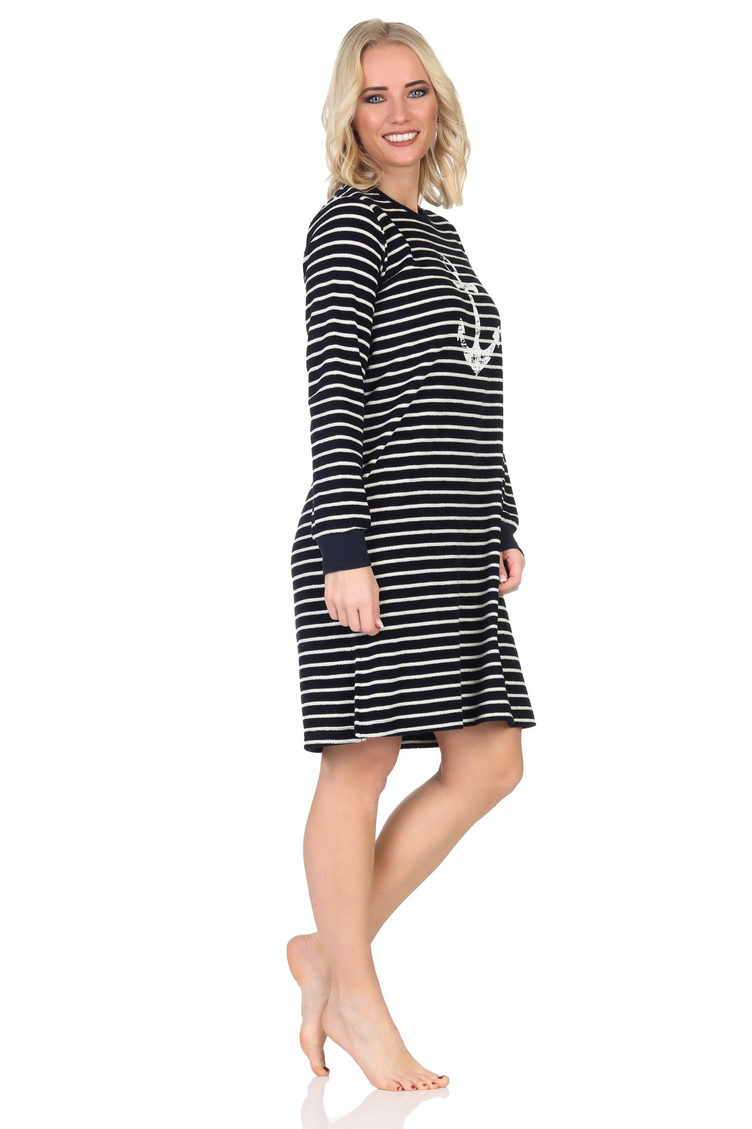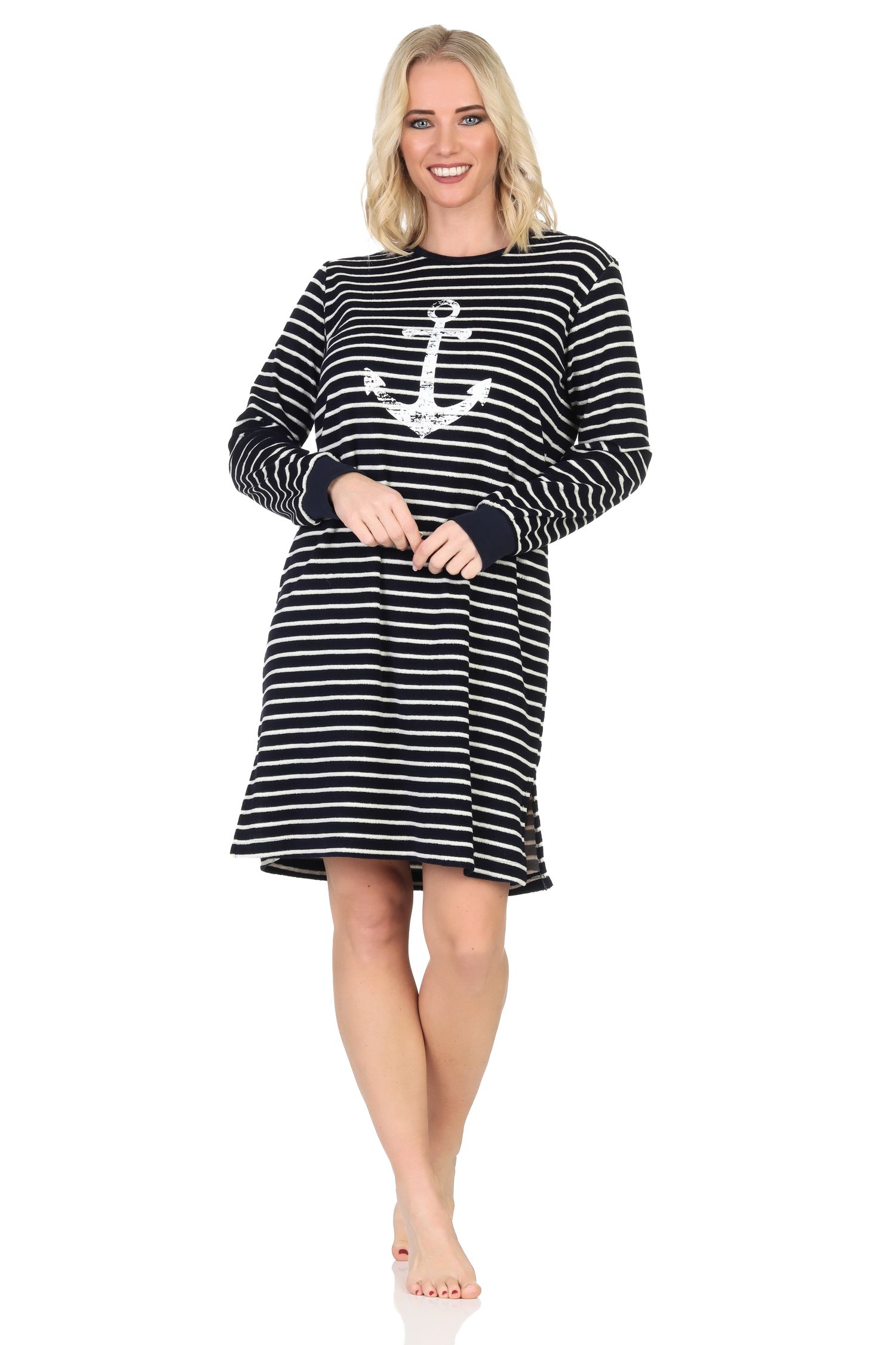- MARITIME OPTIK: Langärmliges Frottee Damen Nachthemd mit Bündchen in wunderschönen maritimen Farben, maritimen Streifen sowie maritimen Motiven wie Anker