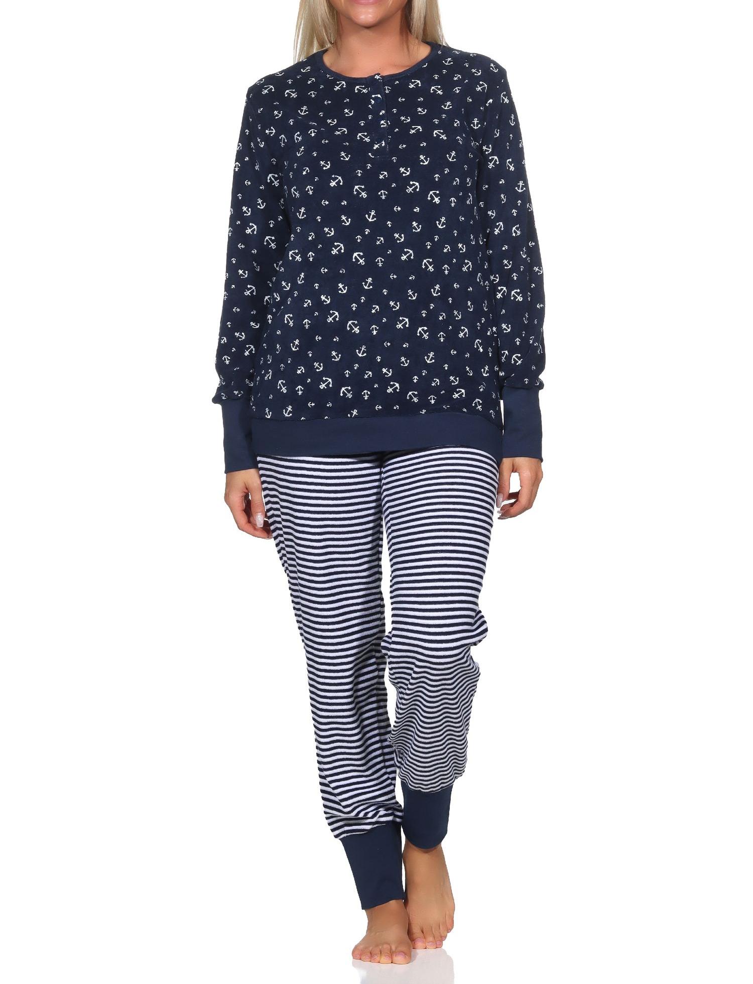 - MARITIME OPTIK: Langärmliger Frottee Damen Pyjama mit Bündchen in wunderschönen maritimen Farben und mit maritimen Streifen sowie Ankern als Alloverdruck