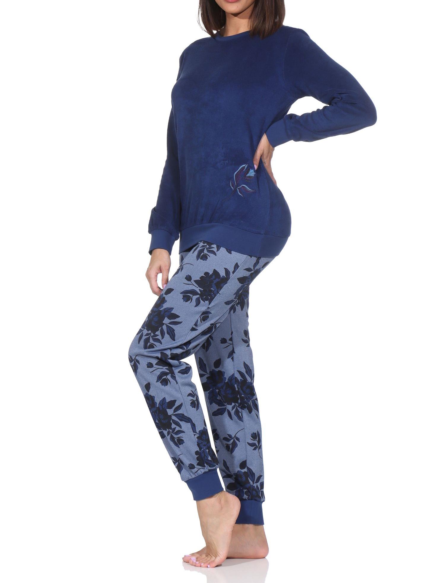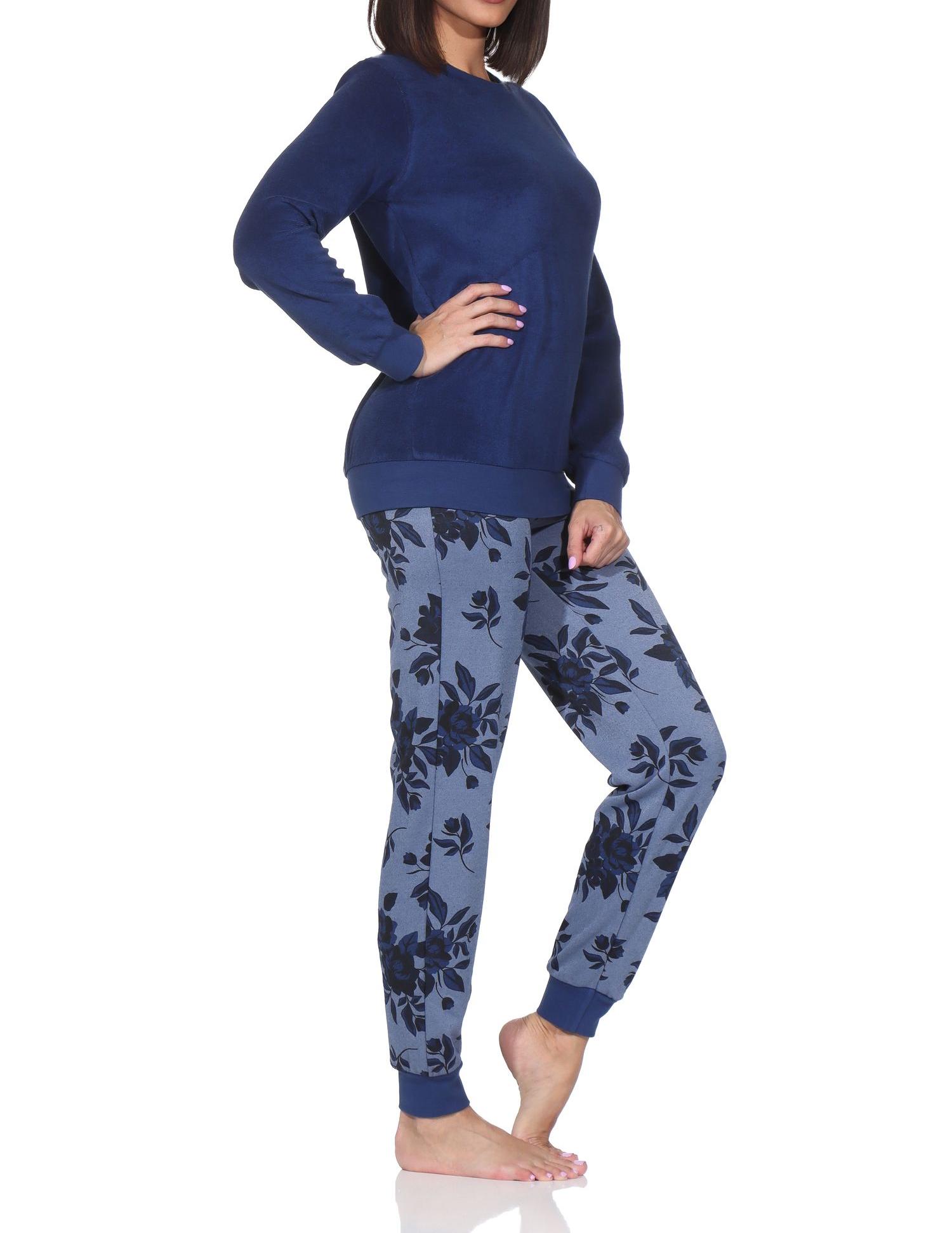 Dieser Damen Frottee Pyjama langarm mit Bündchen ist ein ganz besonderer Style, denn bei diesem Schlafanzug ist der flauschig weiche Frottee Stoff bei der Pyjamahose auf der Innenseite und die Aussenseite ist mit einem floralen Blumenmuster bedruckt. Darüber hinaus hat dieser kuschelig warme Frottee Schlafanzug diese Eigenschaften: