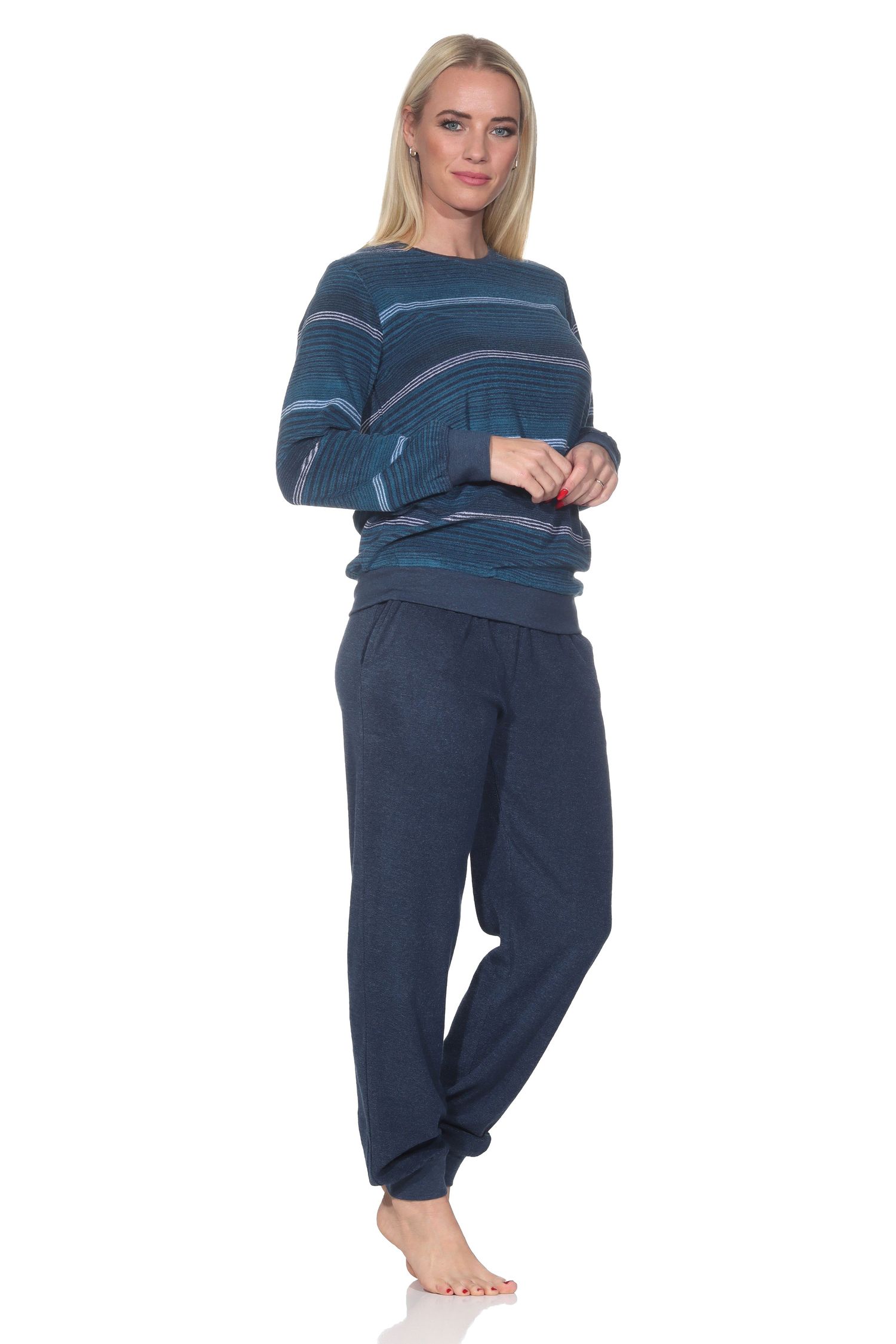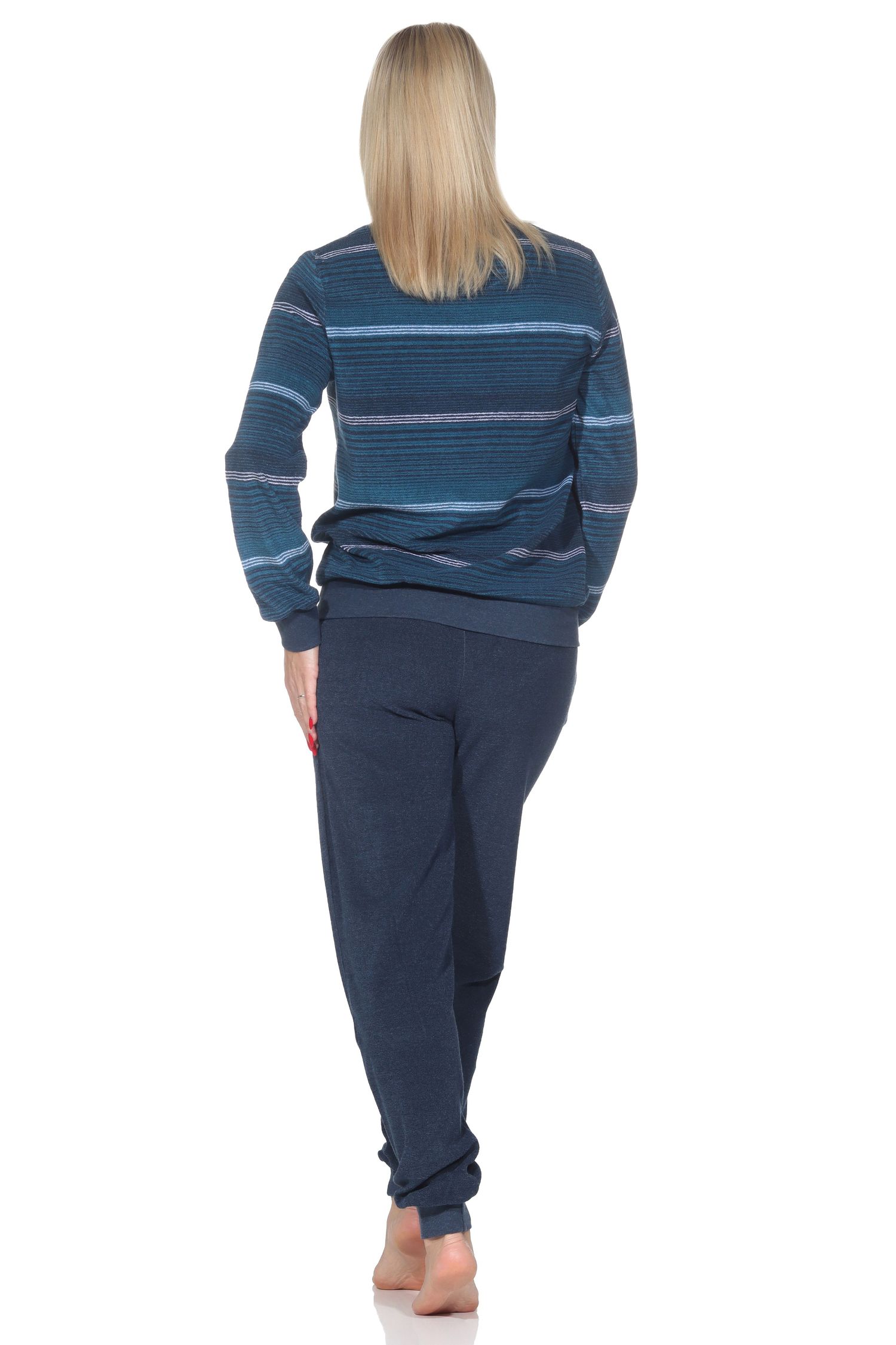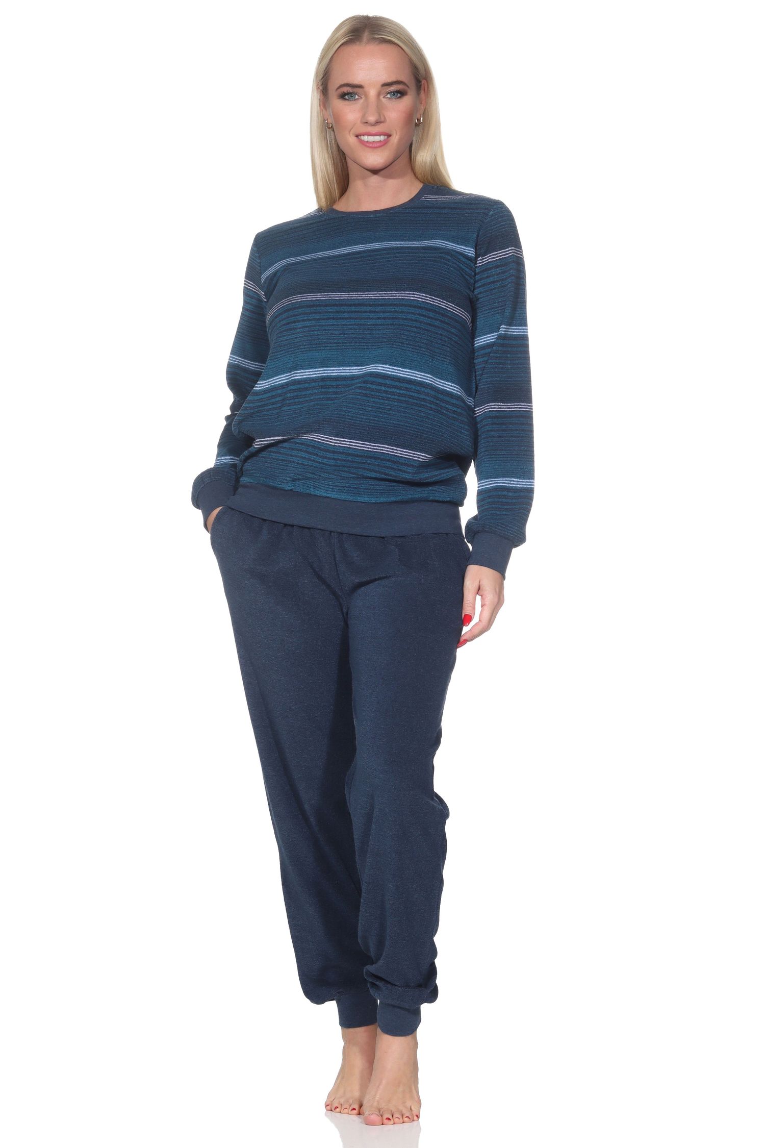 Streifen in zeitlos eleganten Farbigkeiten sind angesagt bei diesem tollen Damen Frottee Pyjama langarm mit Bündchen in einer edlen Optik. Darüber hinaus hat dieser kuschelig warme Frottee Schlafanzug diese Eigenschaften: