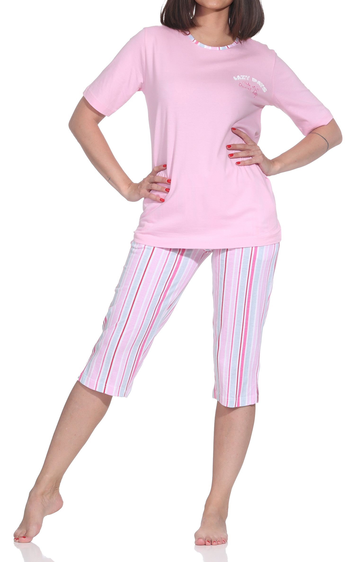 Normann Damen kurzarm Capri Pyjama Shorty – Edle Streifenoptik & Wohlfühl-Komfortschnitt