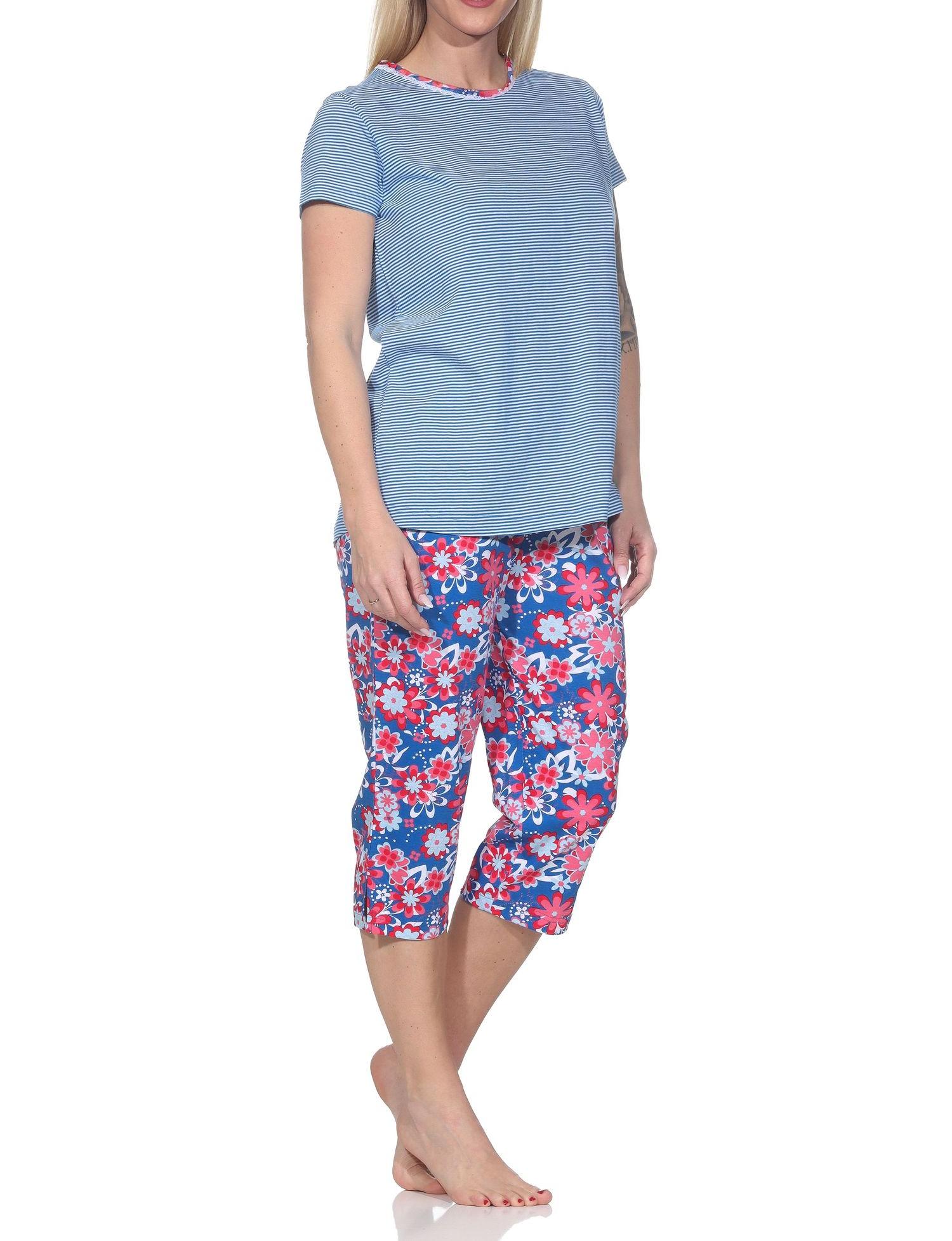 - WUNDERSCHÖNE OPTIK: Kurzarm Damen Capri Pyjama Shorty in toller Optik, Oberteil in garngefärbter Streifenoptik, 3/4-lange Capri-Hose mit floralen Alloverdruck