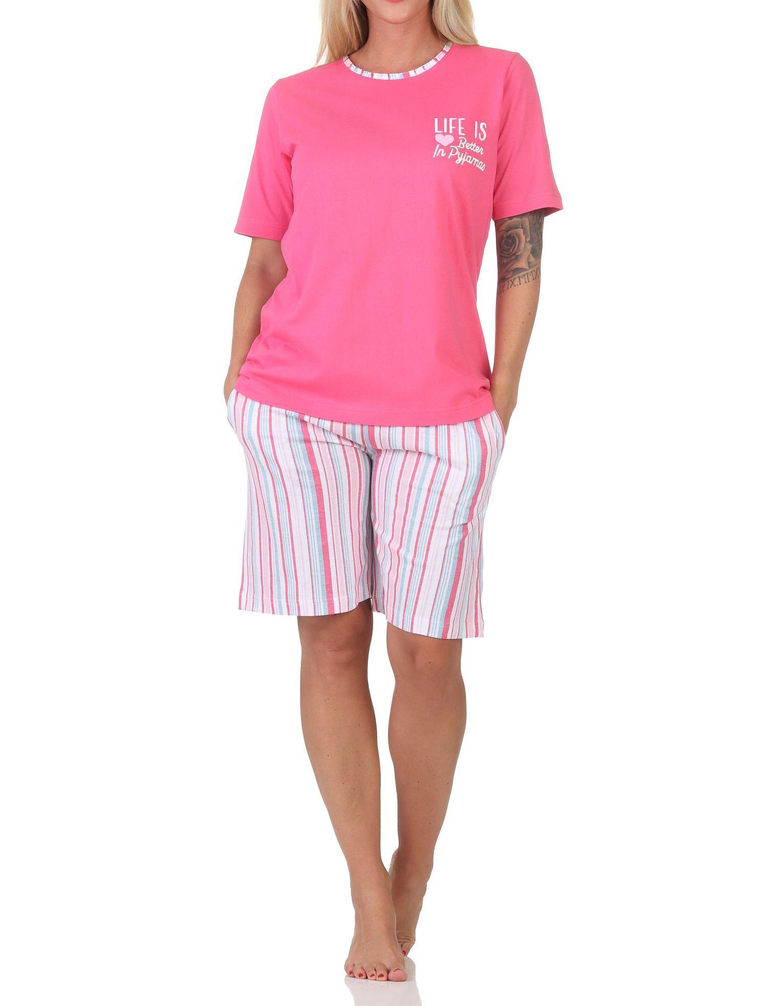 - TOLLE STREIFENOPTIK: Kurzarm Damen Schlafanzug Shorty mit kurzer Shorts Pyjamahose in wunderschönen Streifenoptik, Oberteil mit kleinen Frontprint
