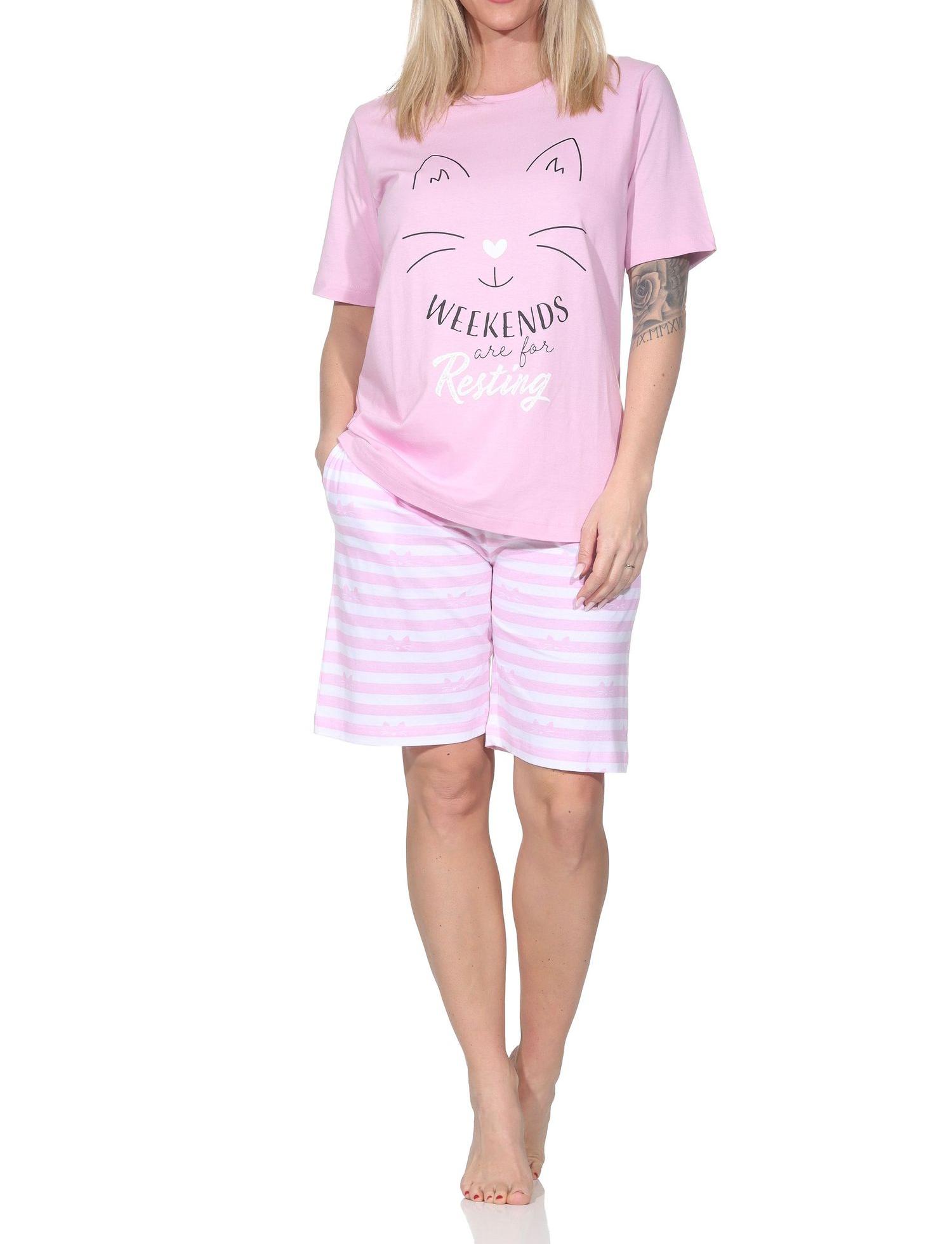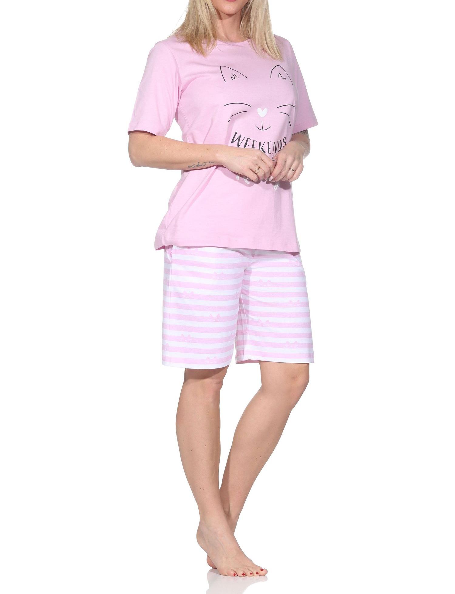 Normann Damen kurzarm Schlafanzug Shorty Pyjama in Katzen Optik – auch in Übergrößen