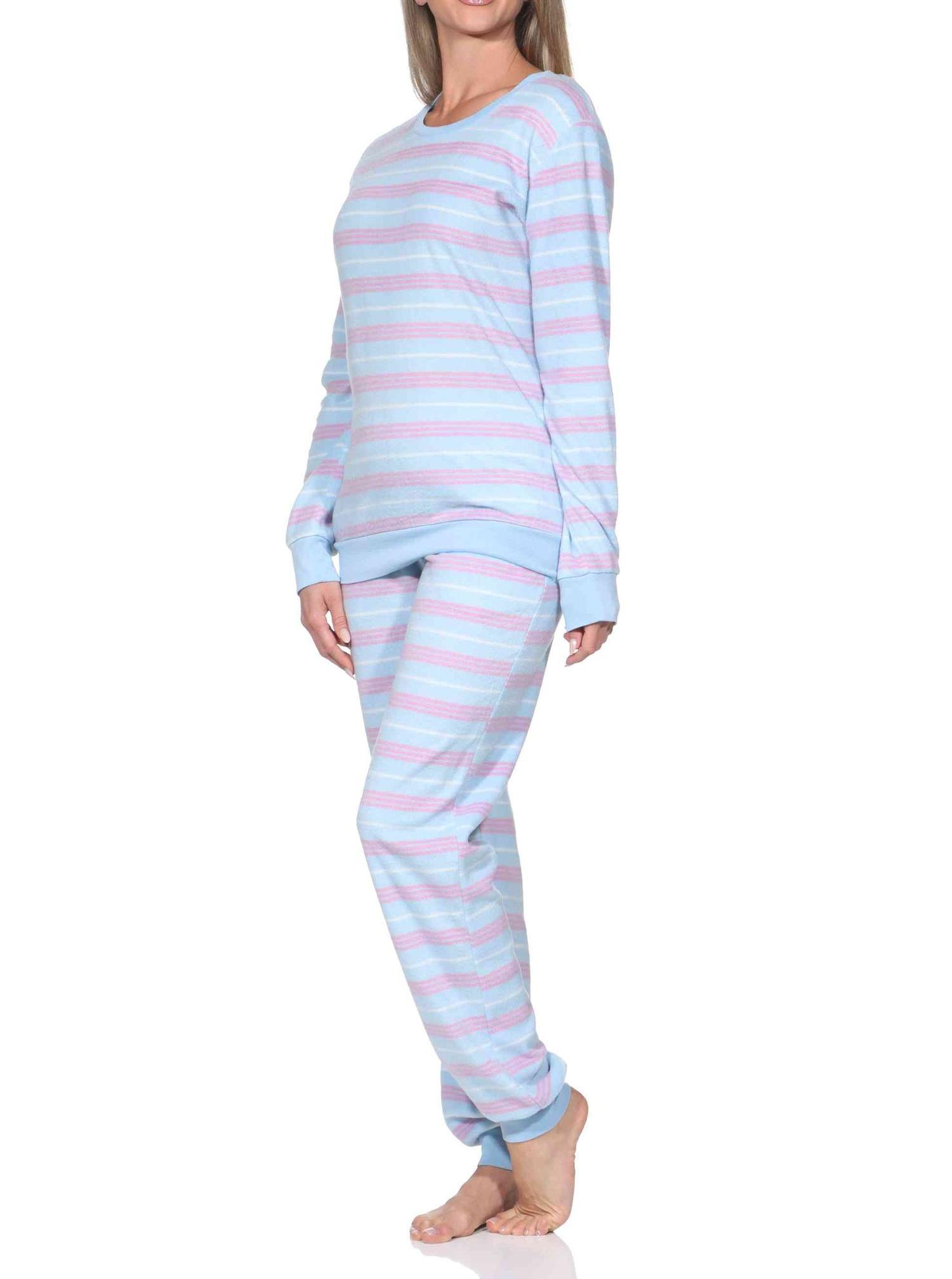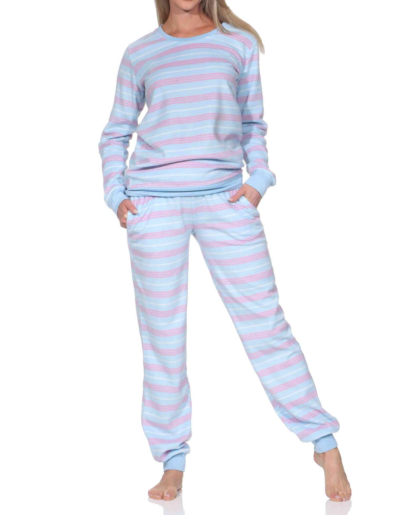 Normann Damen langarm Fleece Schlafanzug mit Bündchen in Streifen Optik