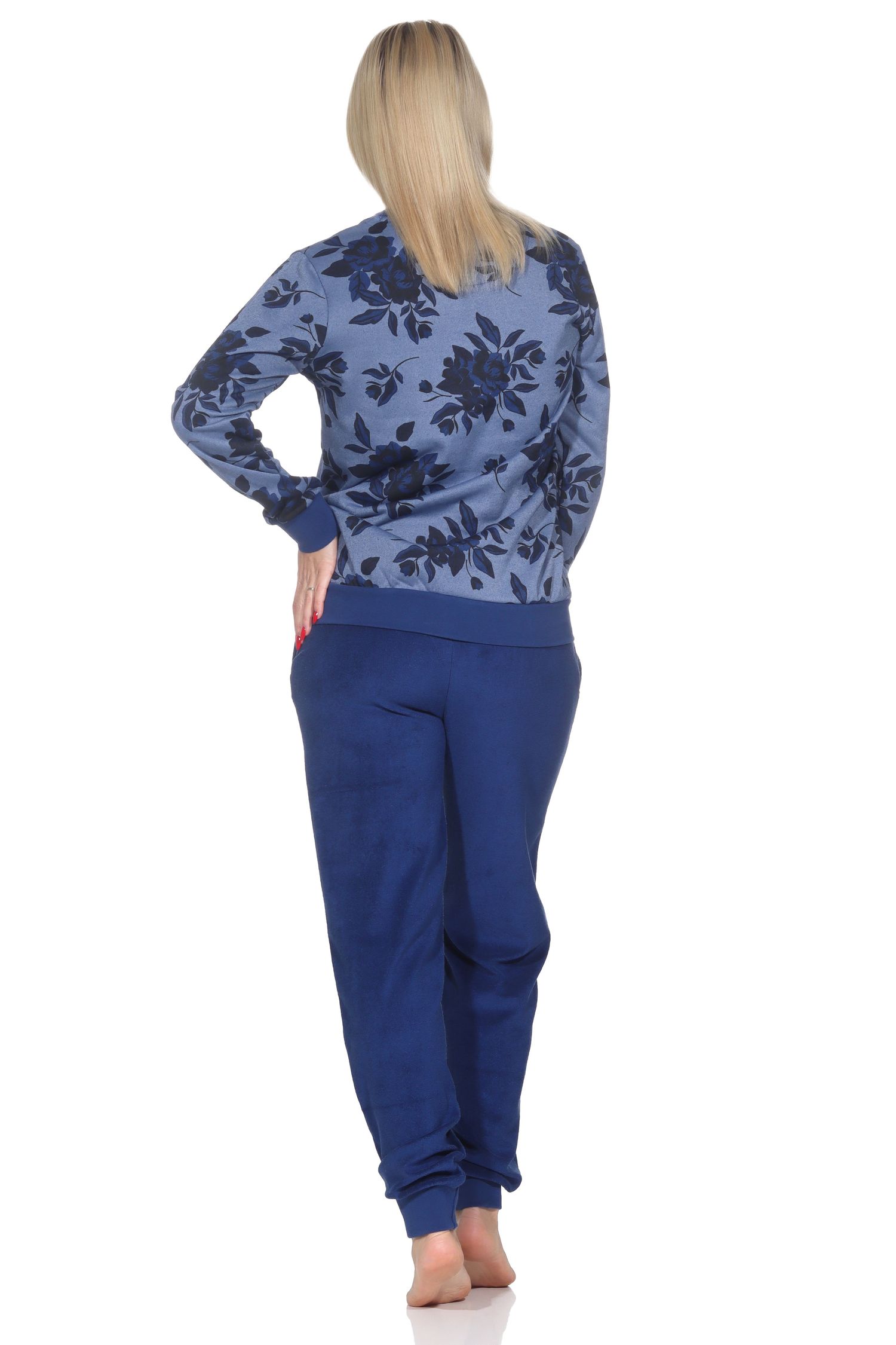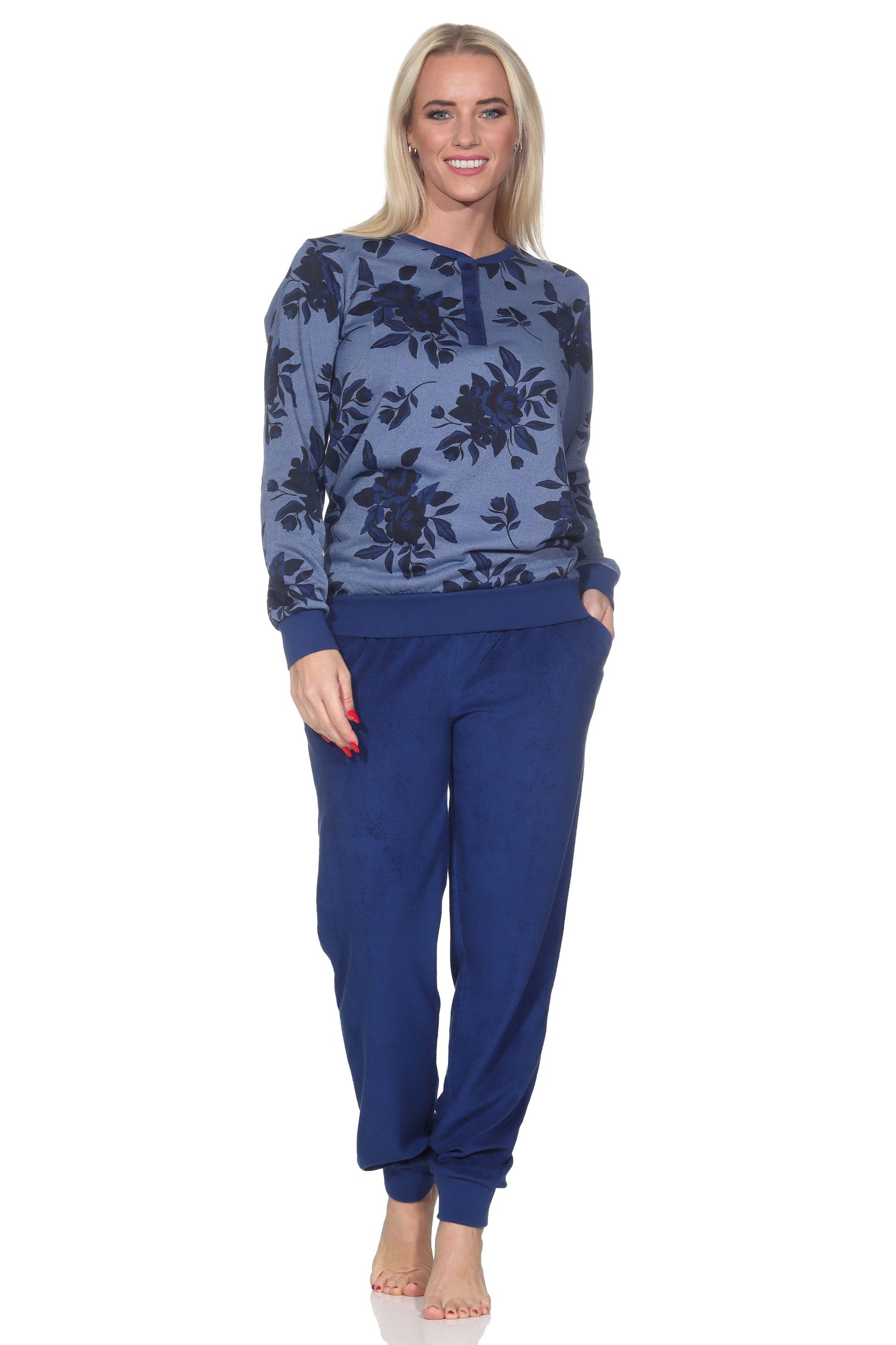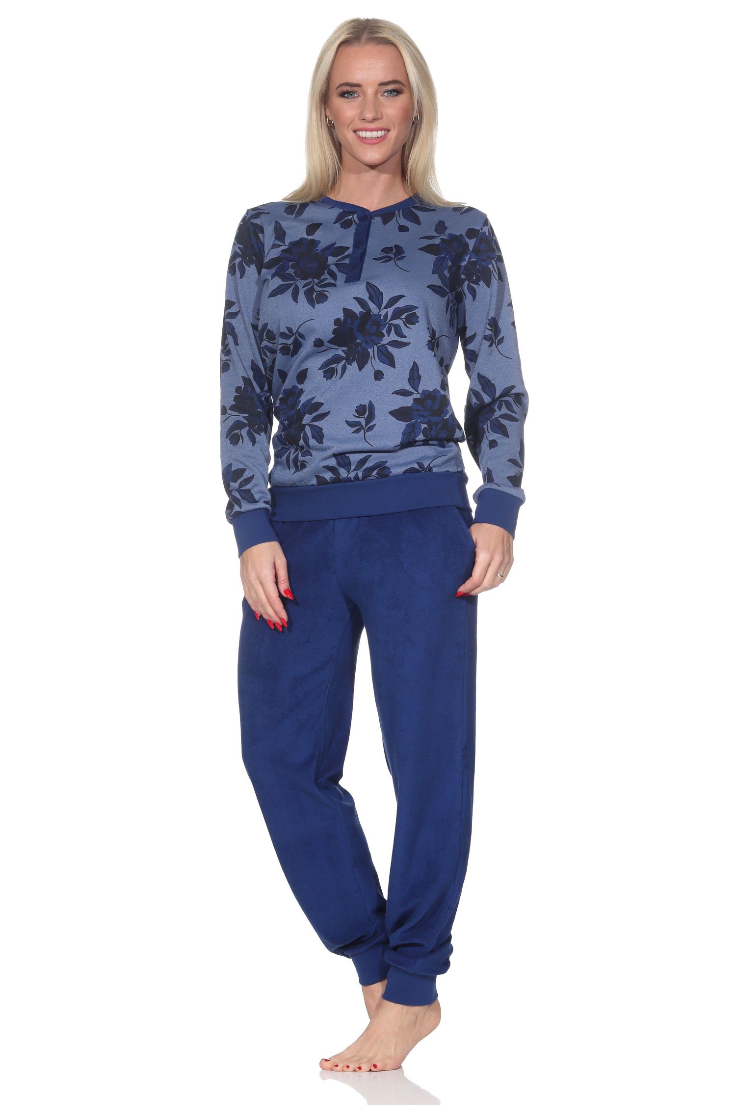 Wenn Sie kuschelig warme Nachtwäsche mögen, dann ist dieser Damen langarm Frottee Pyjama die ideale Wahl, denn dieser Schlafanzug hat ein besonderes Merkmal: Bei diesem Schlafanzug ist der flauschig weiche Frottee Stoff bei dem Pyjama-Oberteil auf der Innenseite und die Aussenseite ist mit einem floralen Blumenmuster bedruckt. Darüber hinaus hat dieser kuschelig warme Frottee Schlafanzug diese Eigenschaften: