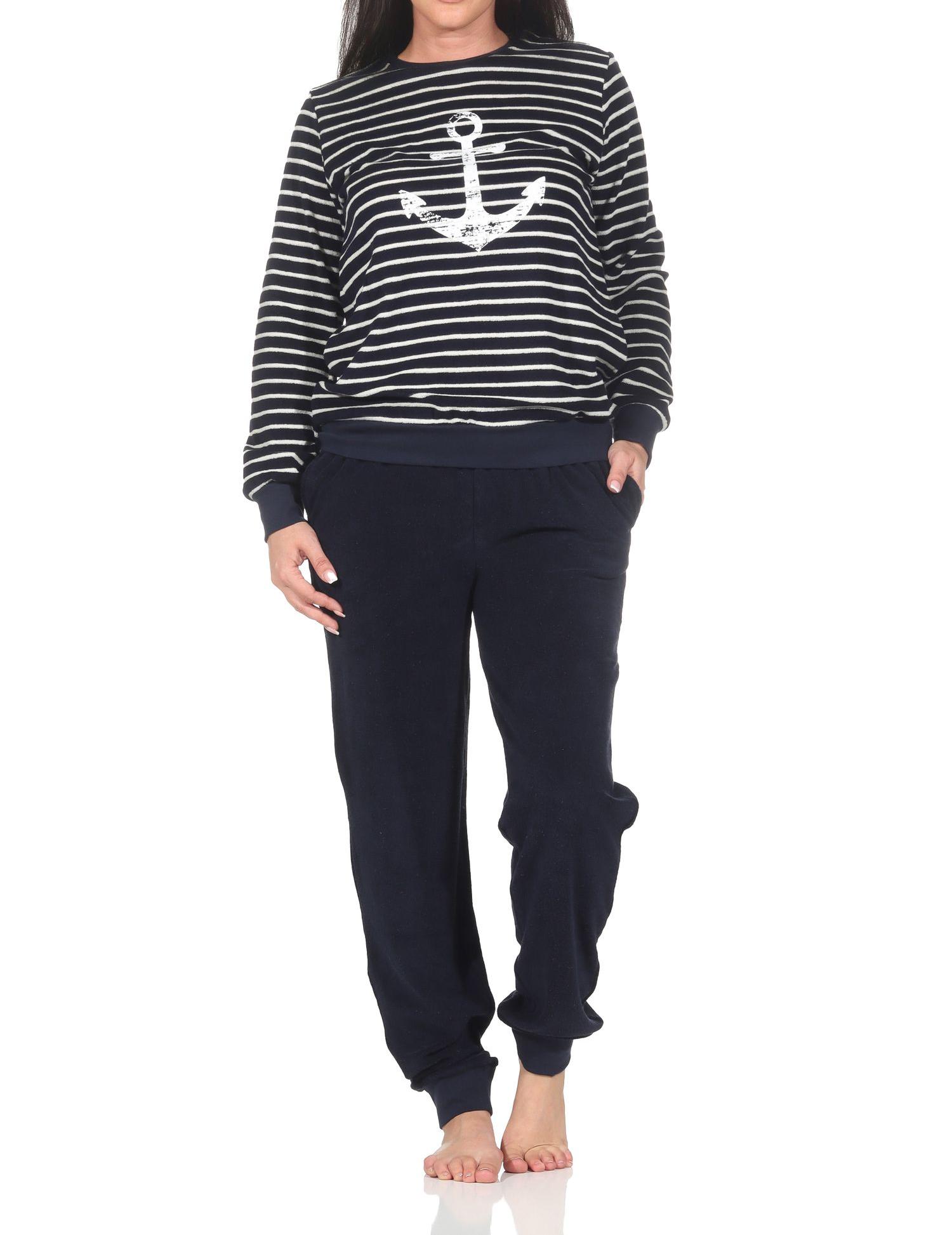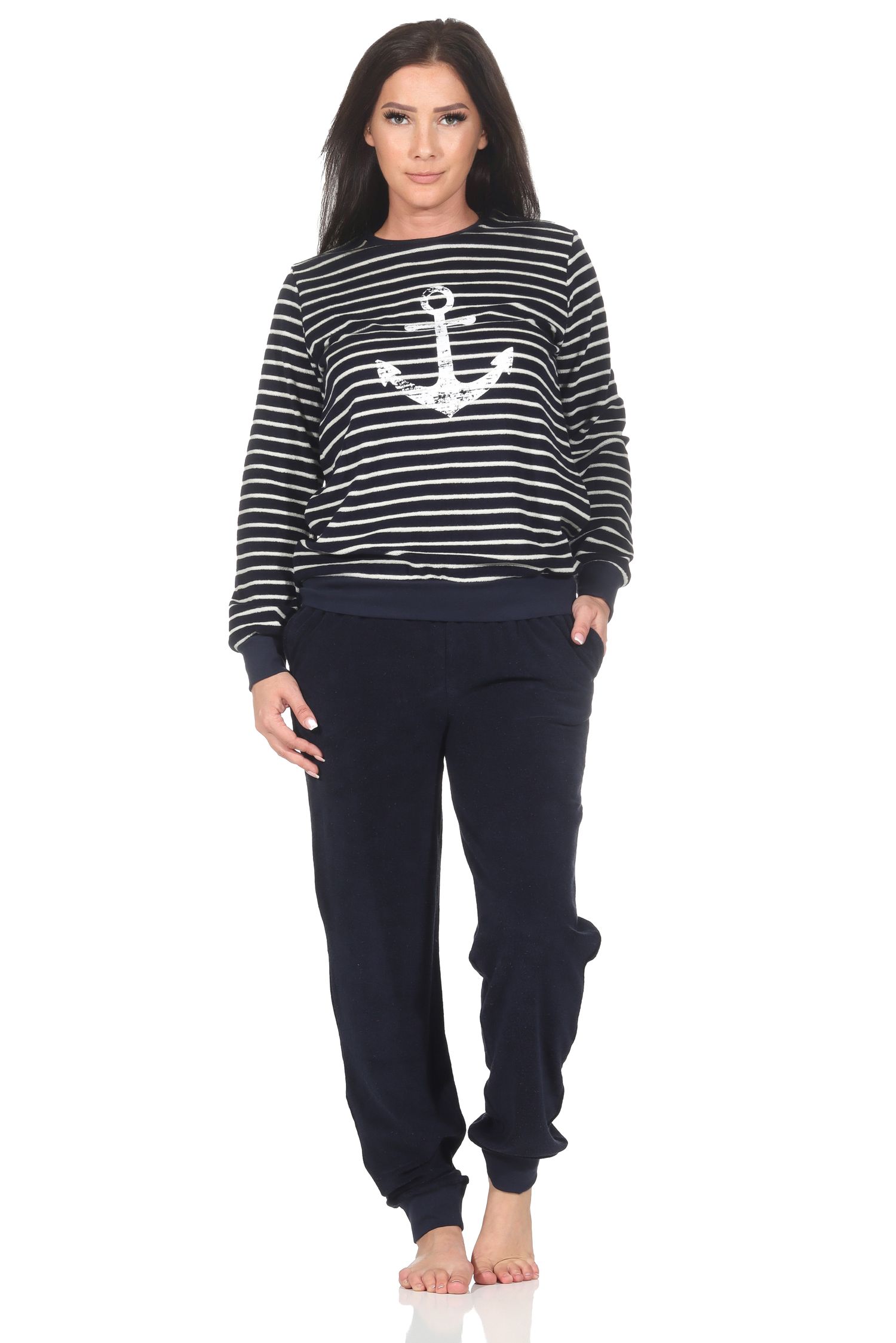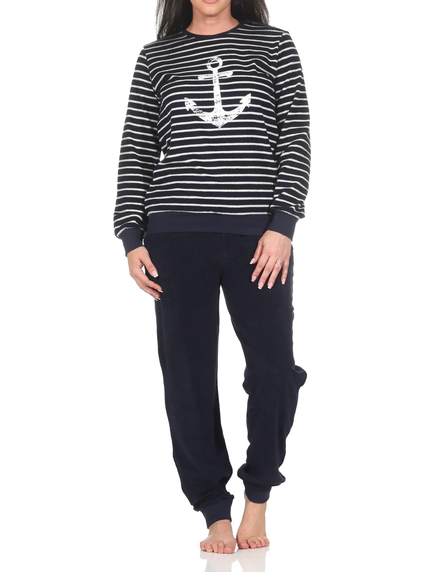Normann Damen langarm Frottee Schlafanzug mit Bündchen in maritimer Optik und Anker Motiv