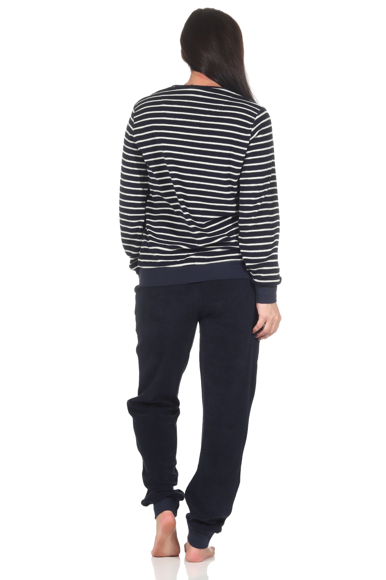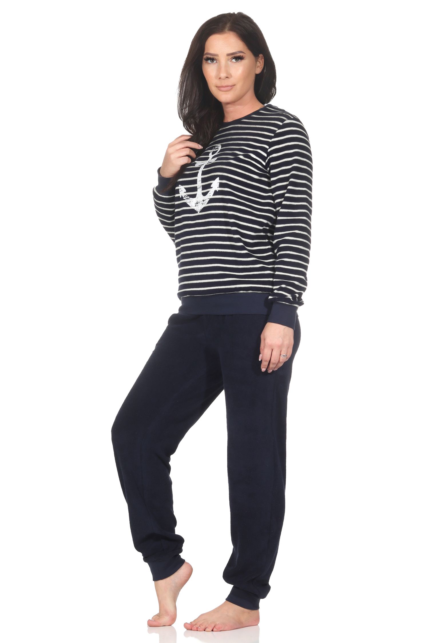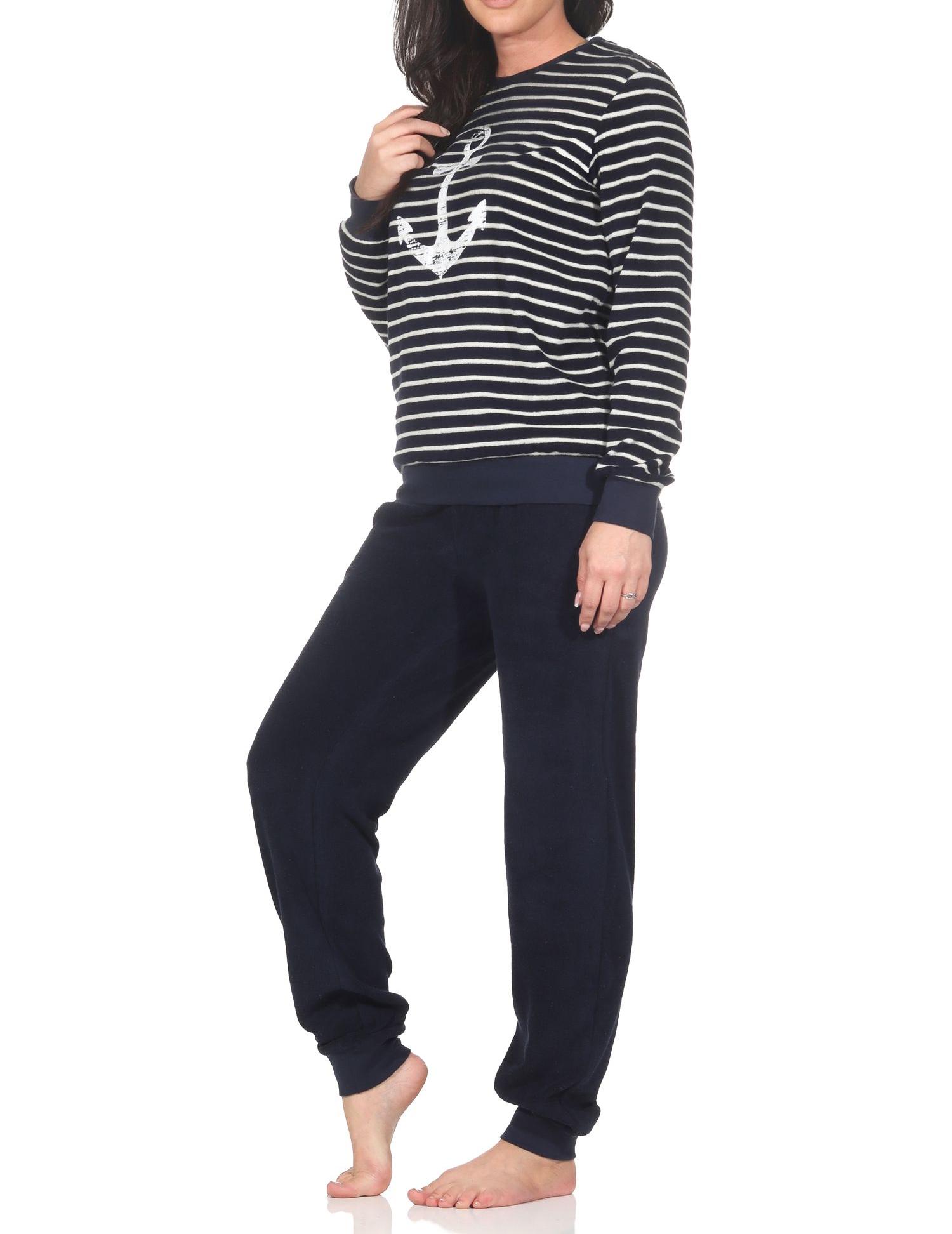Normann Damen langarm Frottee Schlafanzug mit Bündchen in maritimer Optik und Anker Motiv