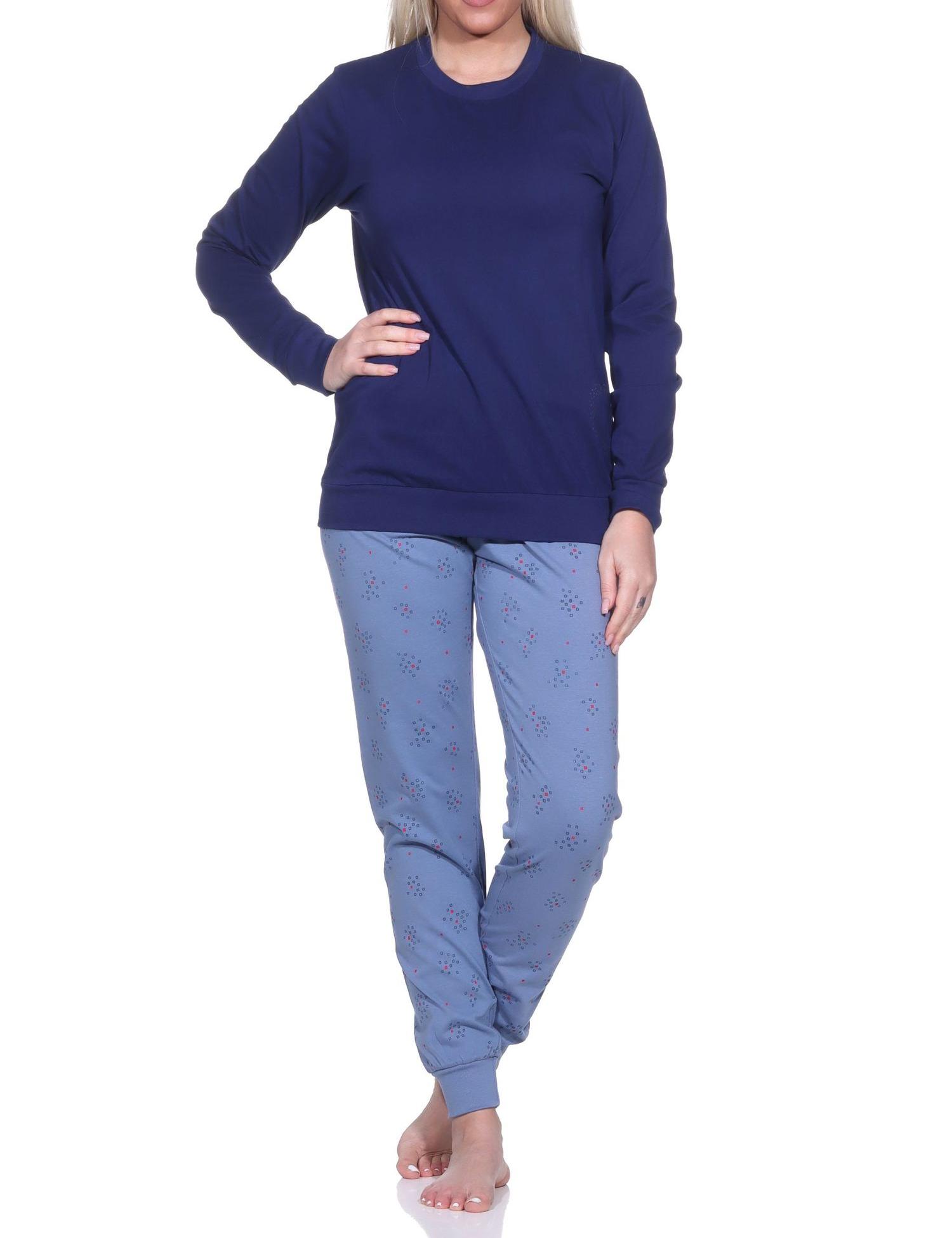 Klassische Eleganz, so lässt sich dieser Damen langarm Schlafanzug mit Bündchen am besten umschreiben. Das Oberteil des Schlafanzug ist unifarben und hat ein Herz Motiv, die Hose ist allover bedruckt.