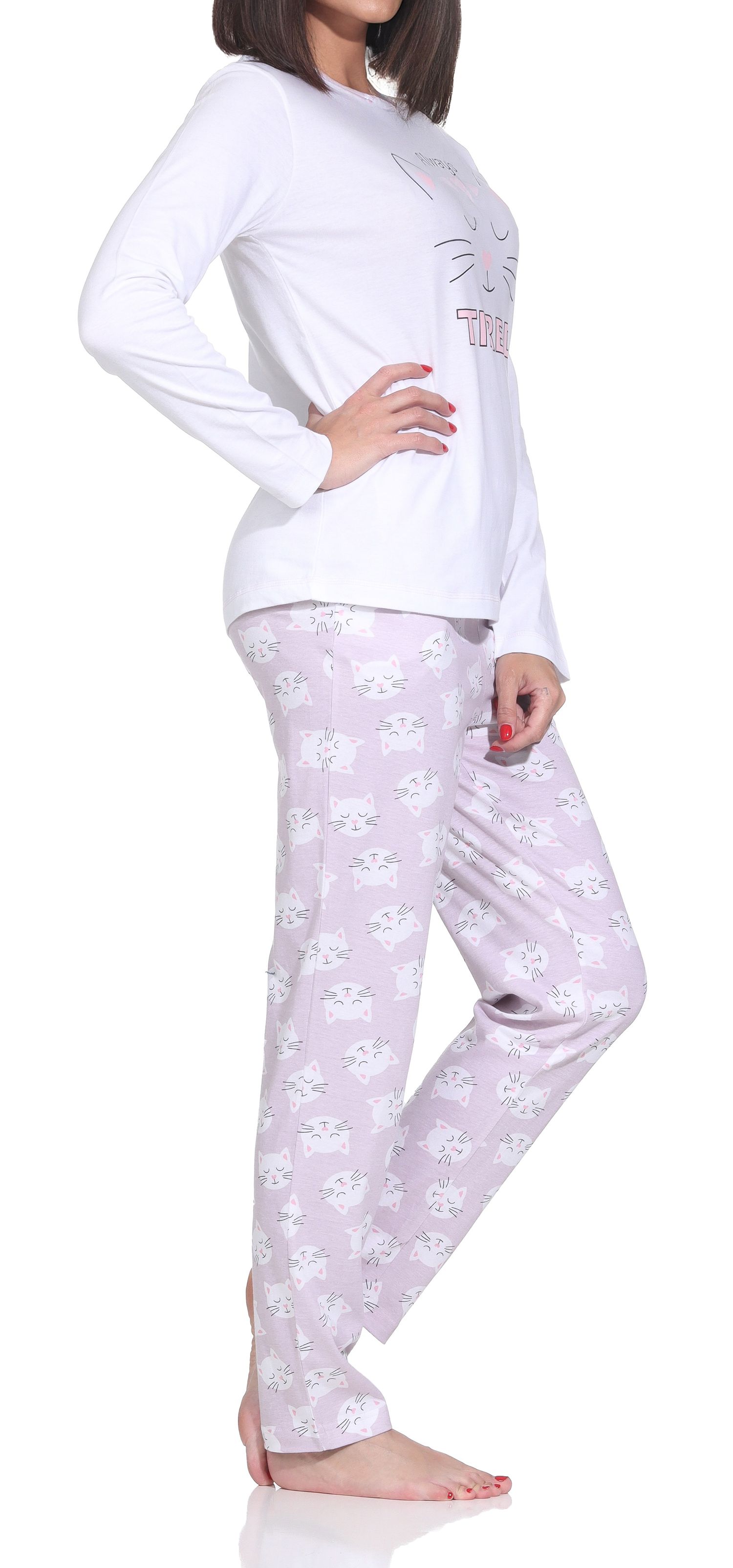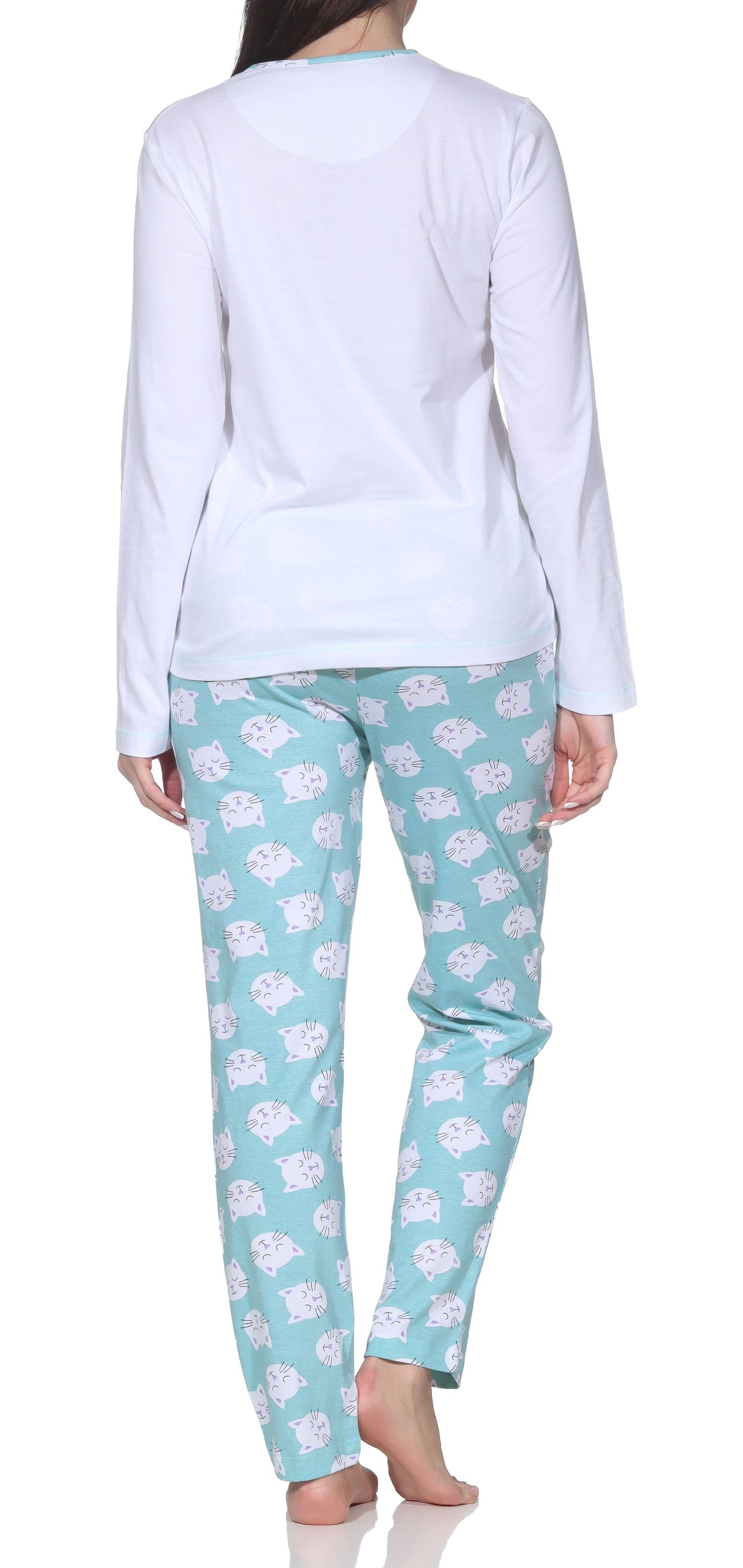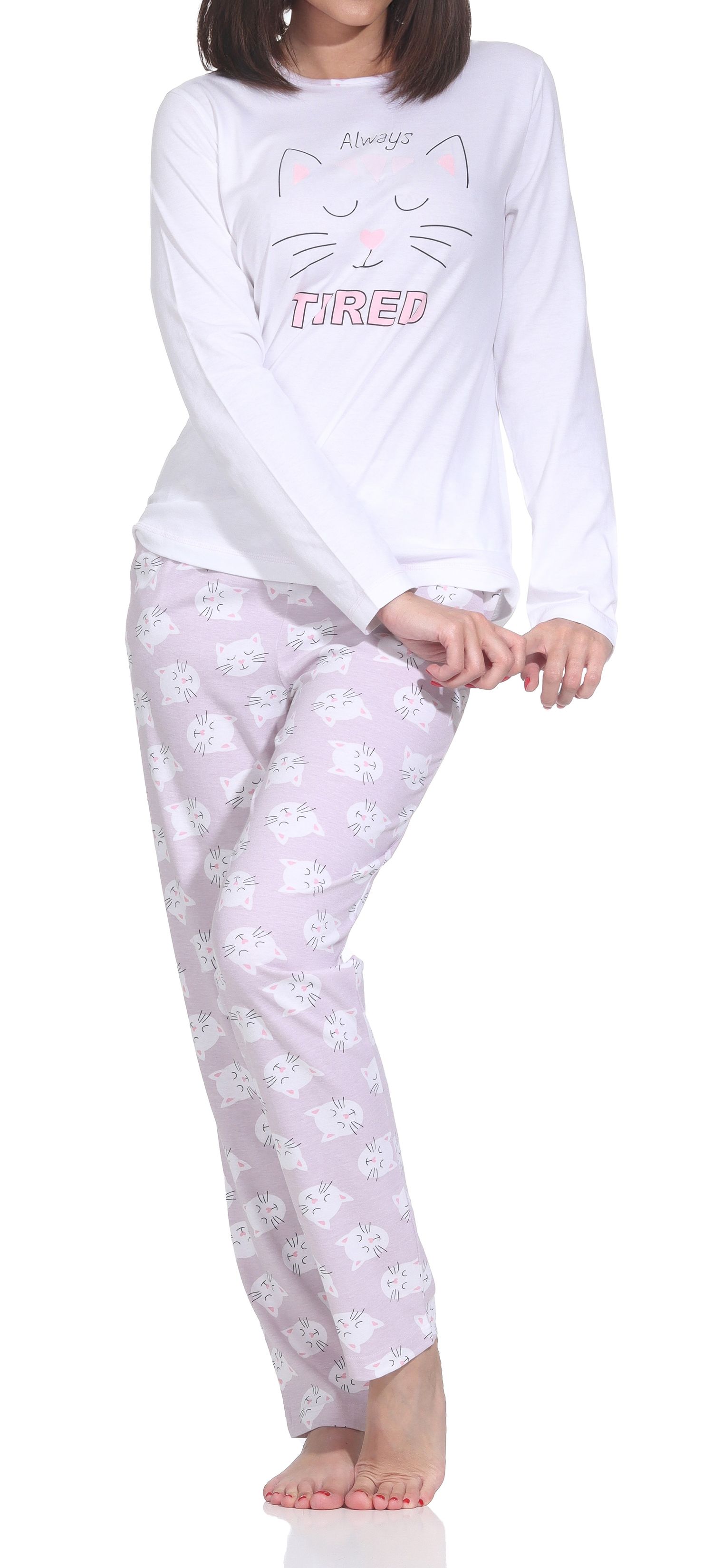 Normann Damen langarm Schlafanzug Pyjama mit niedlichen Katzenmotiv – auch in Übergröße