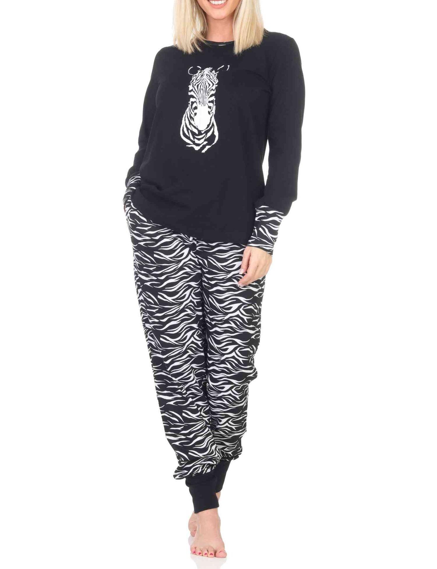 Süsser Damen Pyjama Schlafanzug mit Bündchen und Zebra Tiermotiv, Hose im Animal-Print-Look