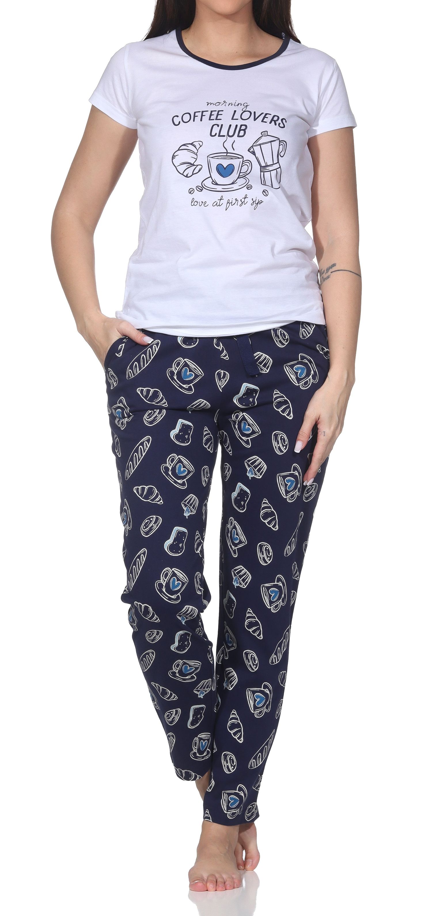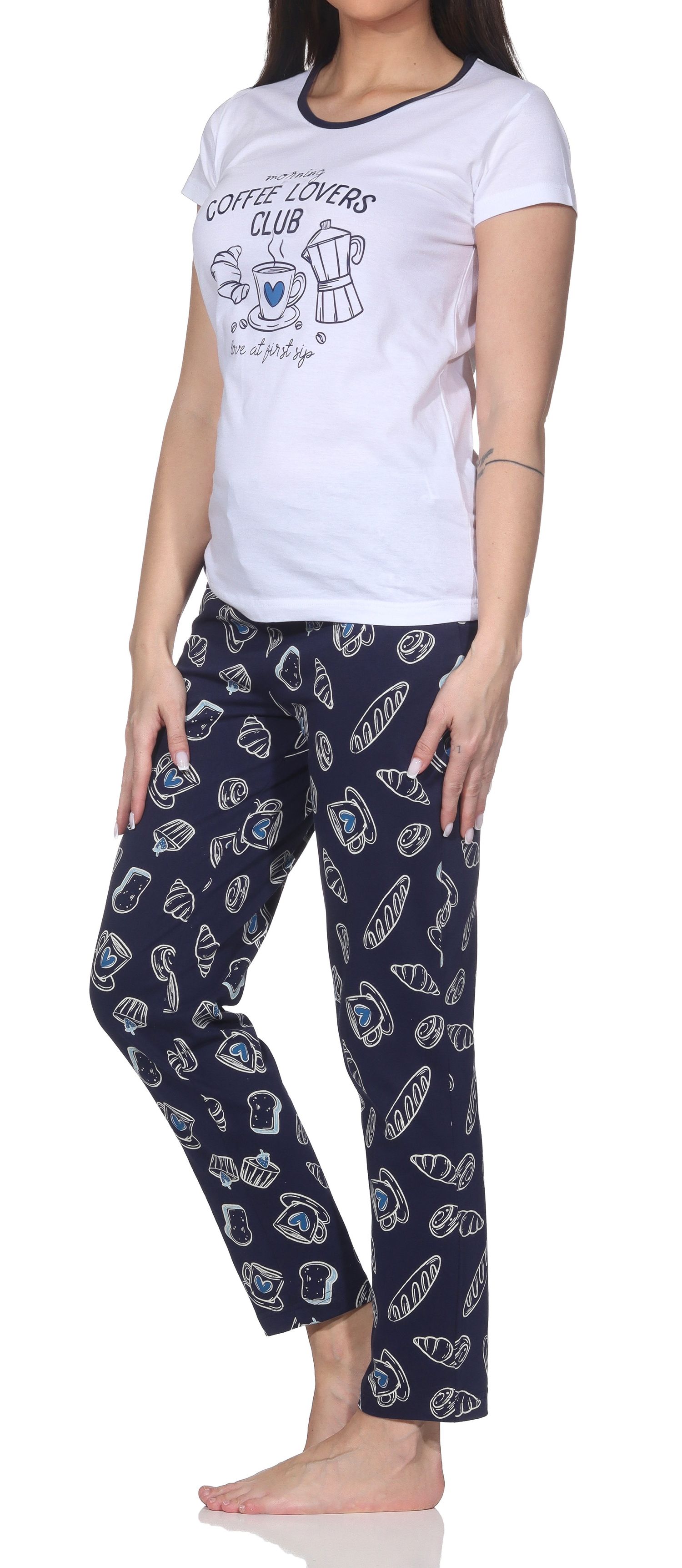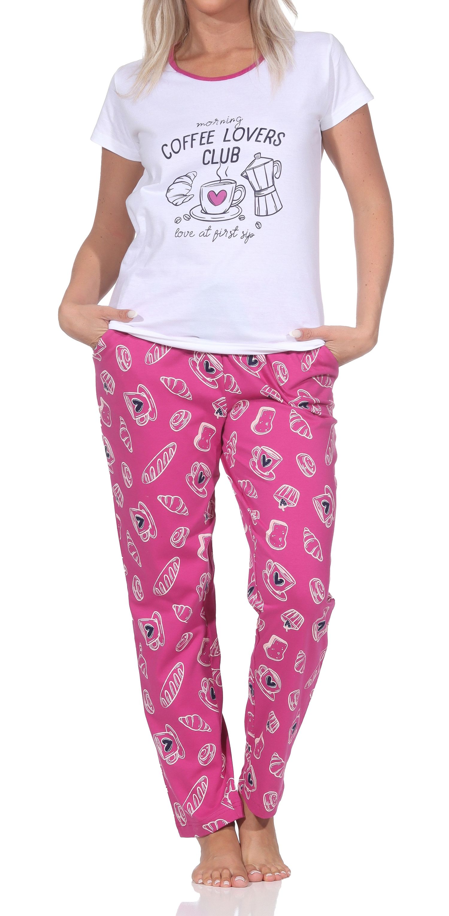 Normann Damen Schlafanzug kurzarm – „Coffee Lovers Club“ & 100% Baumwolle