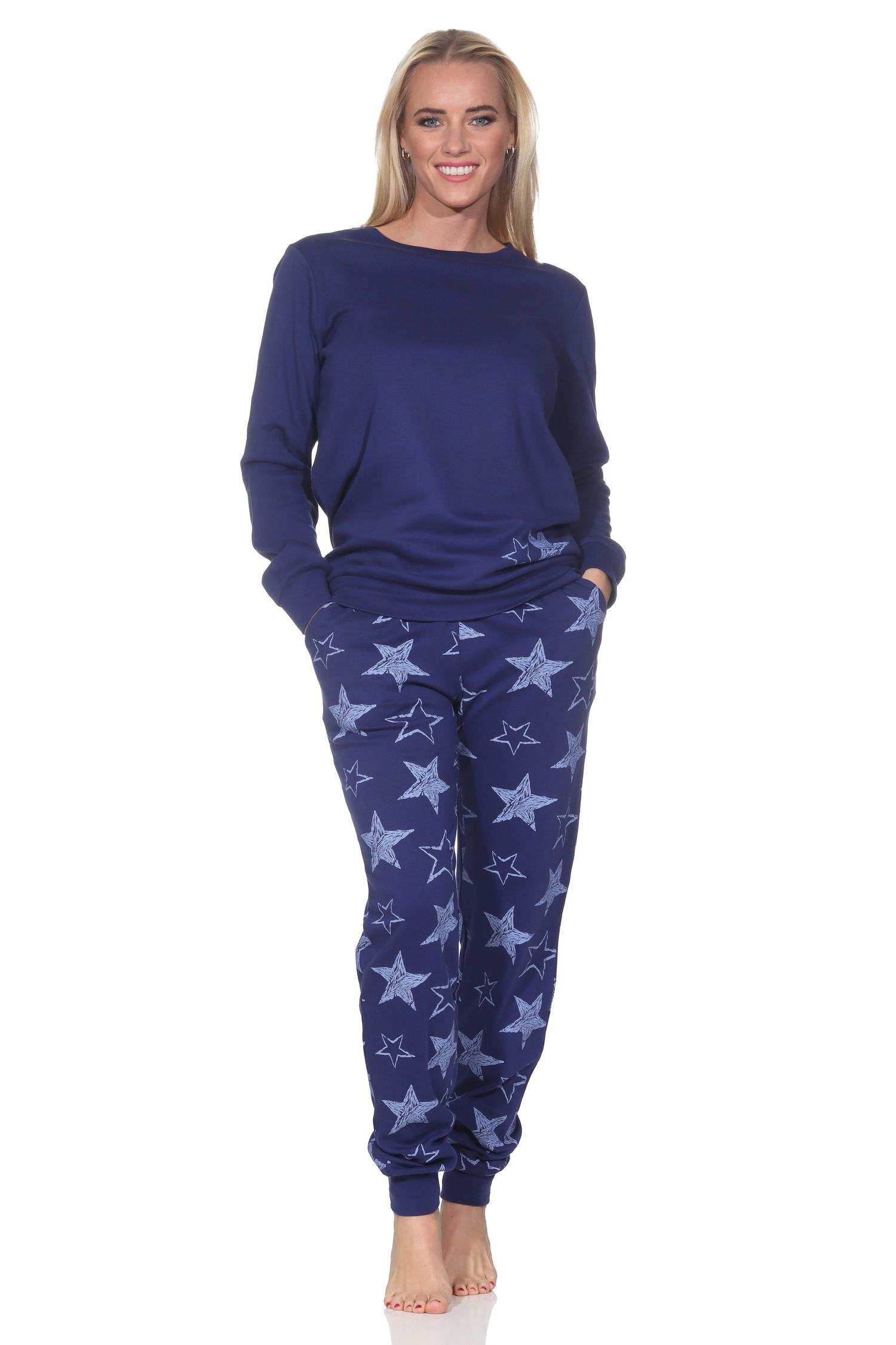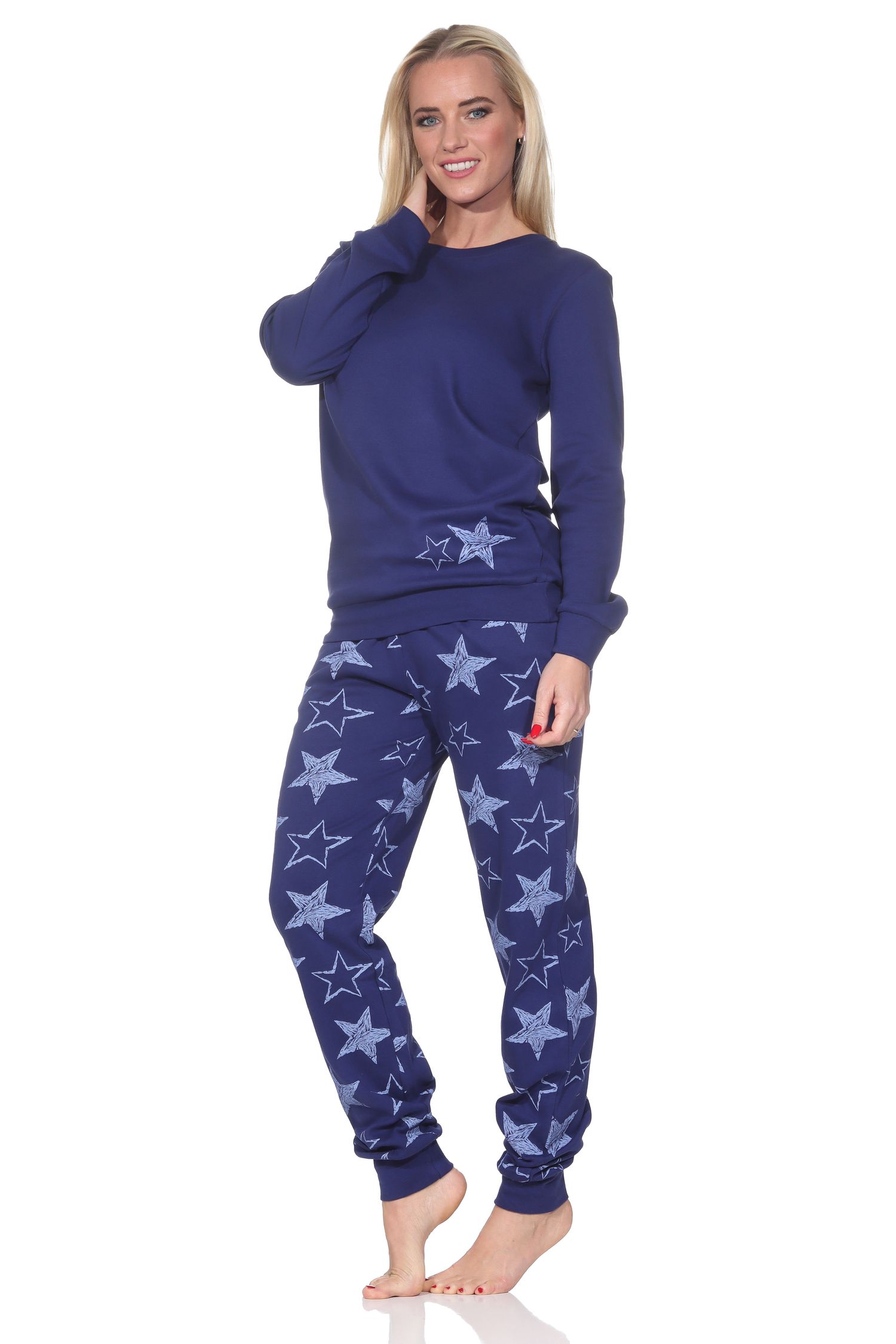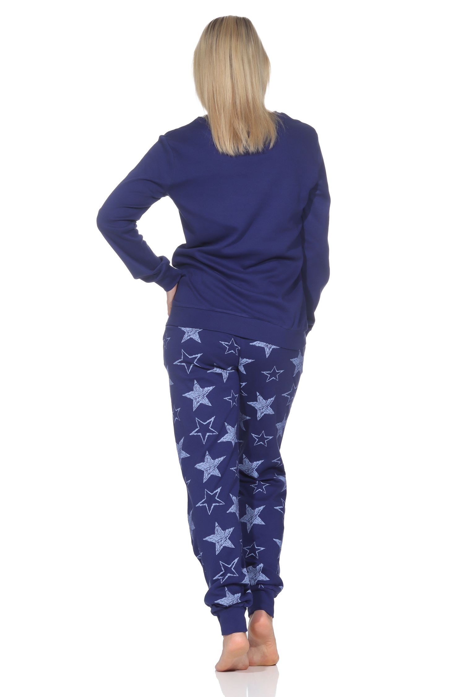 Normann Damen Schlafanzug lang in Kuschel Interlock Qualität mit Bündchen in Sterne Optik