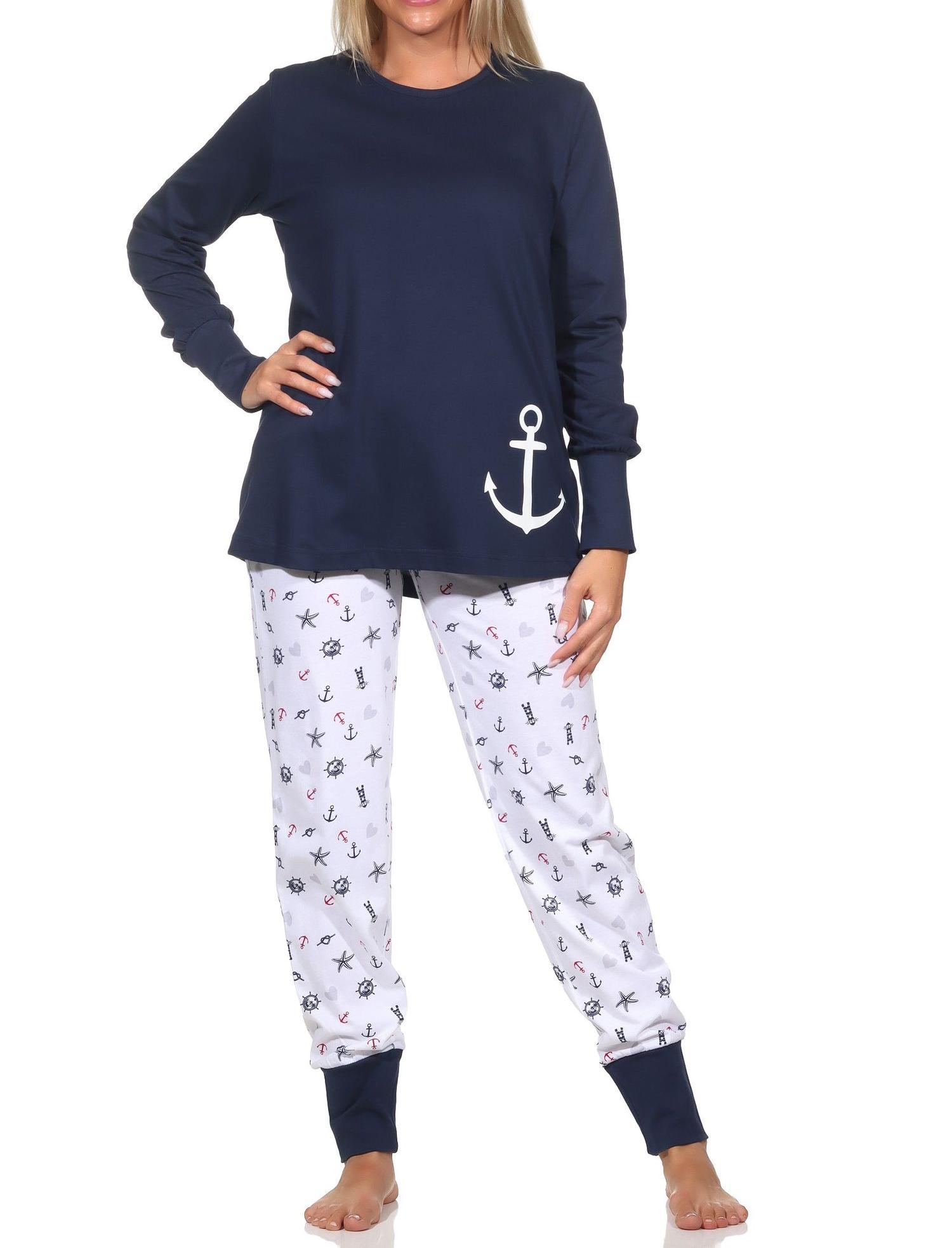 Normann Damen Schlafanzug lang mit Bündchen in maritimer Optik - auch in Übergrössen
