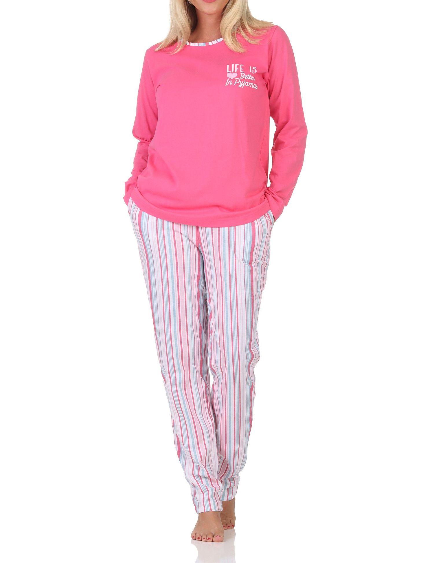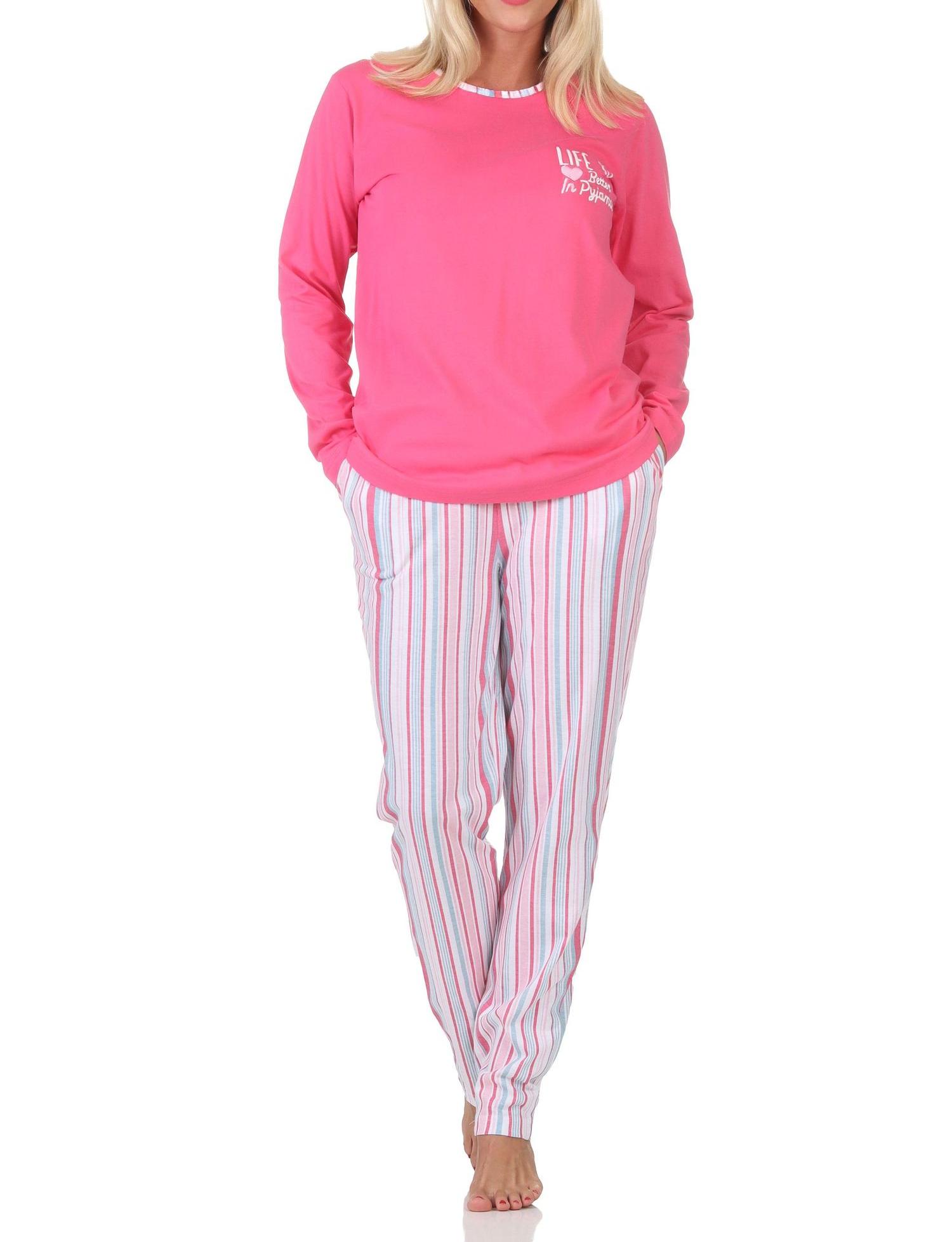 - TOLLE STREIFENOPTIK: Langarm Damen Schlafanzug mit Pyjamahose in wunderschönen Streifenoptik, Oberteil mit kleinen Frontprint