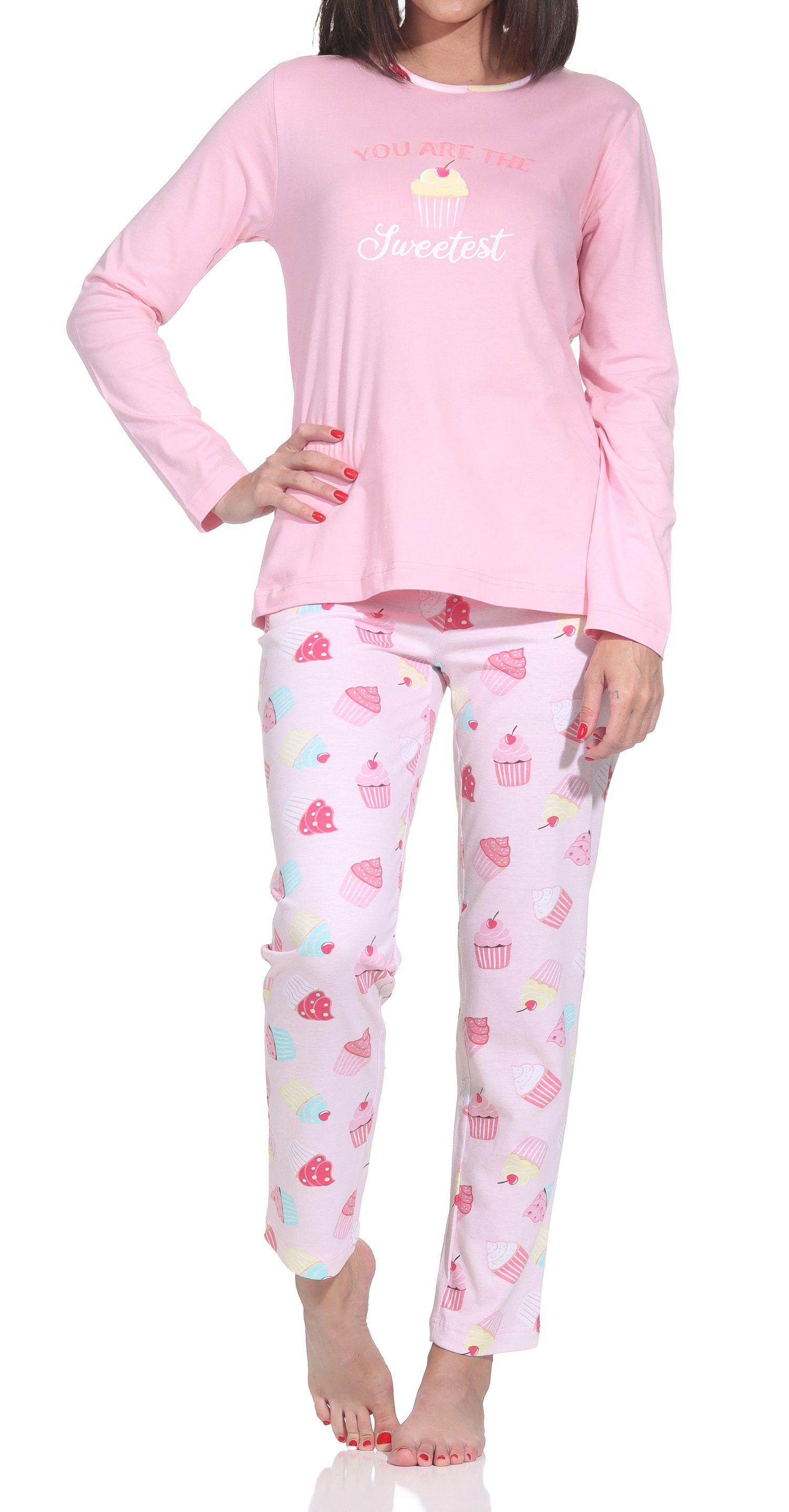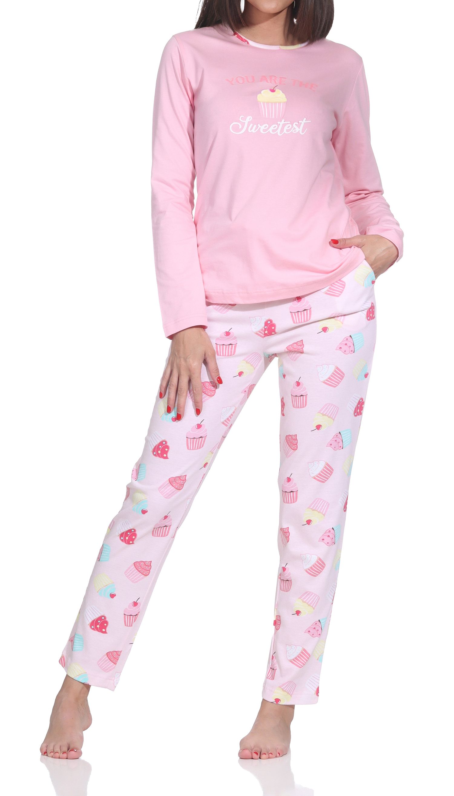 Normann Damen Schlafanzug lang – Süßes Cupcake-Motiv & "Sweetest" Frontprint