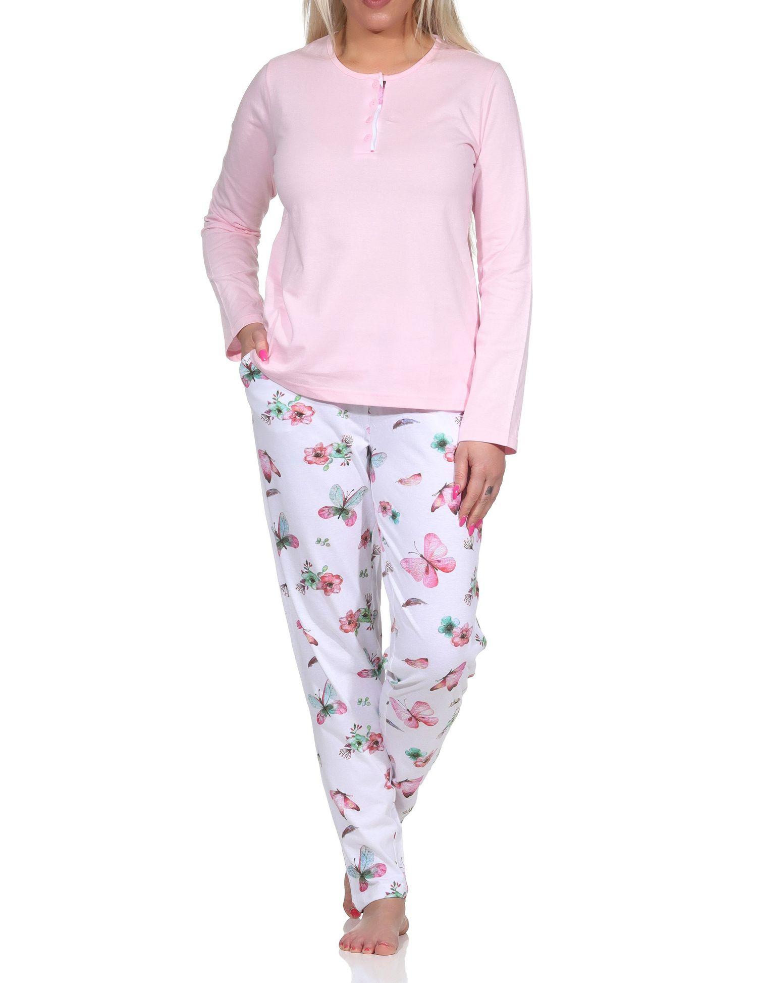 Normann Damen Schlafanzug langarm Pyjama mit Pyjamahose in floralem Schmetterlings Print