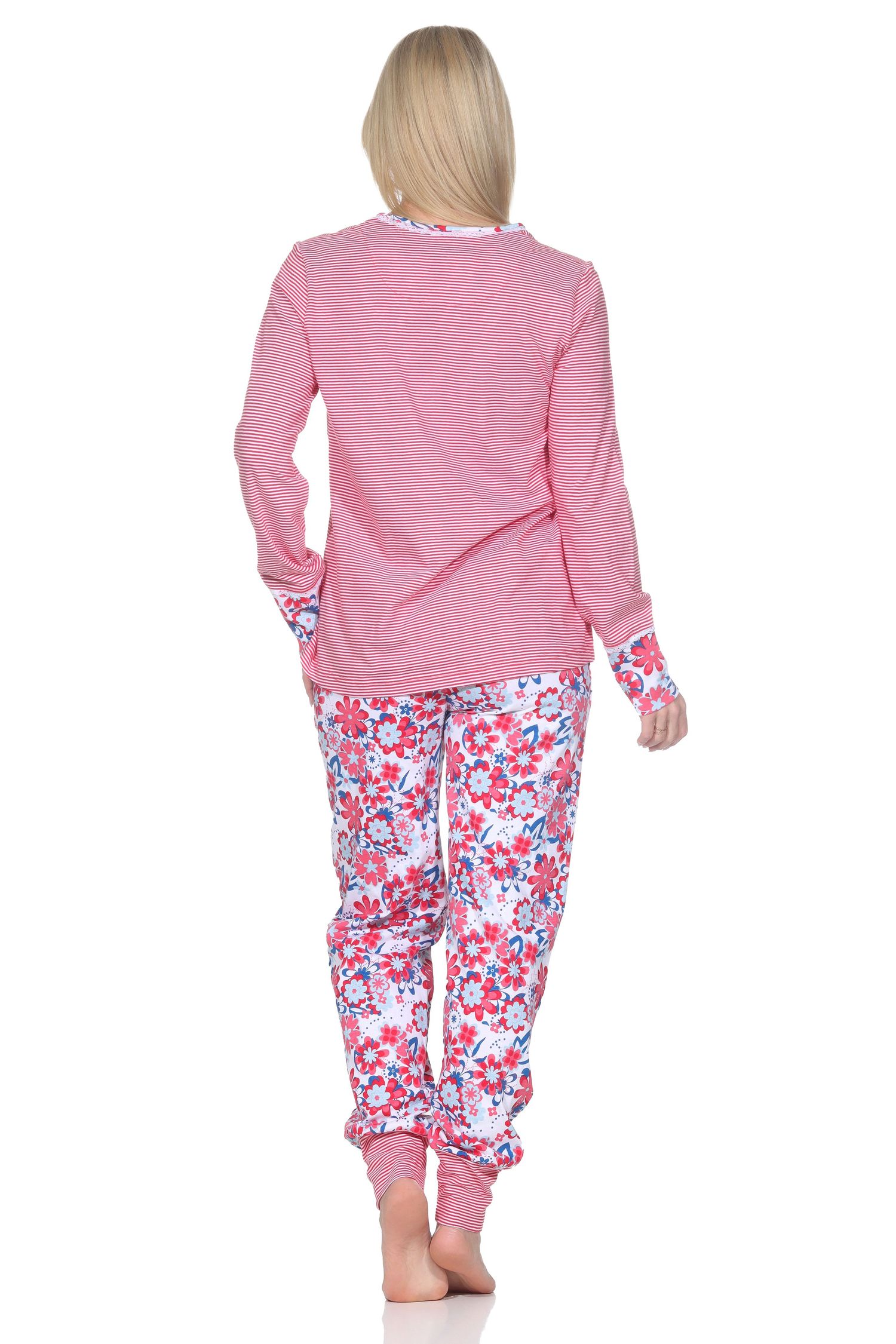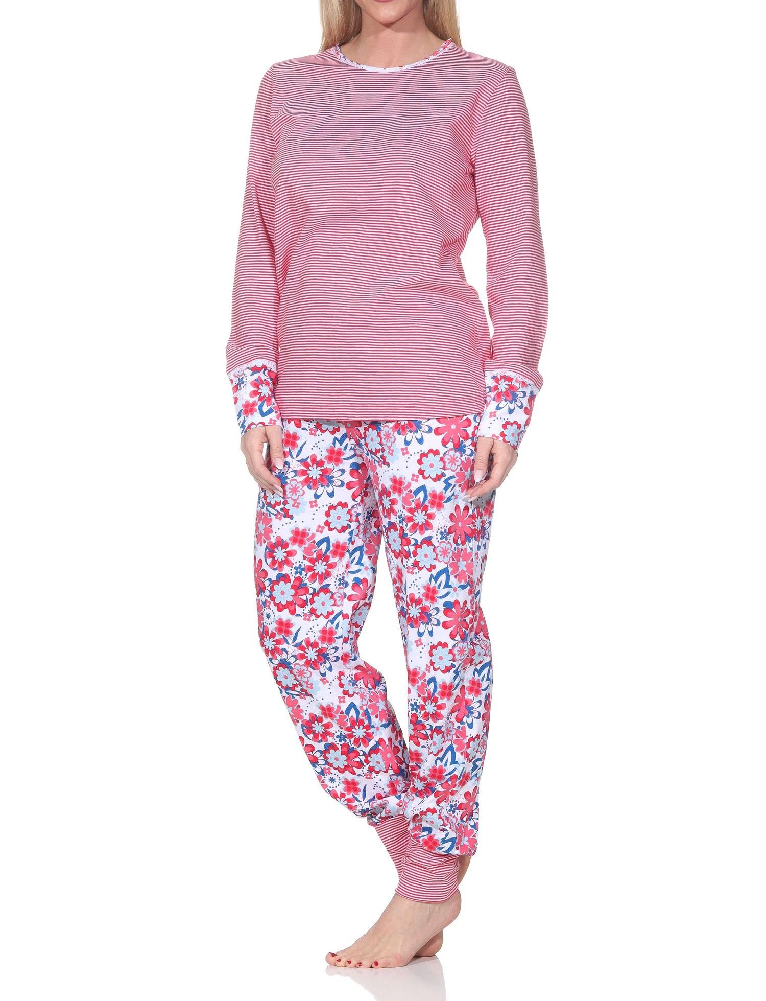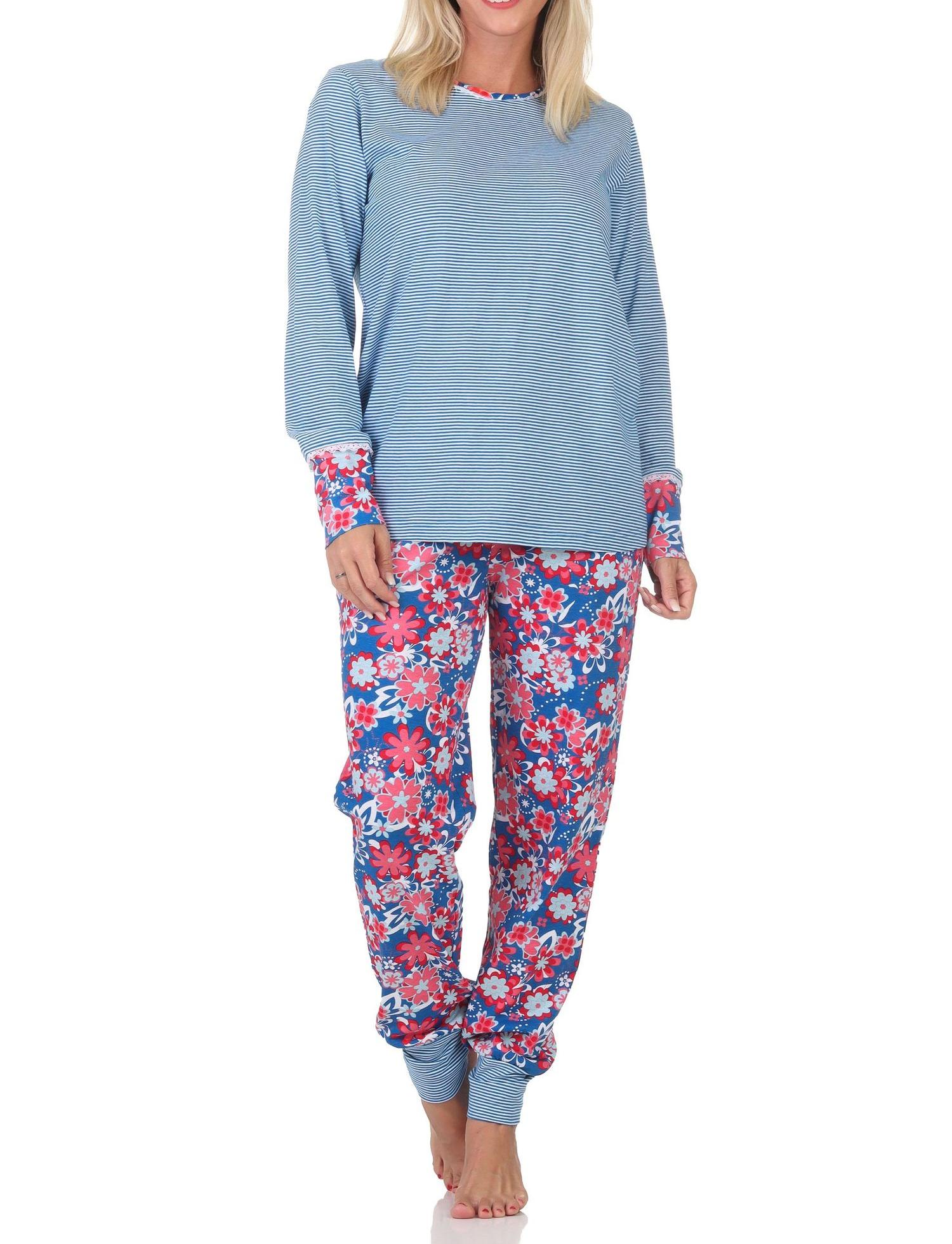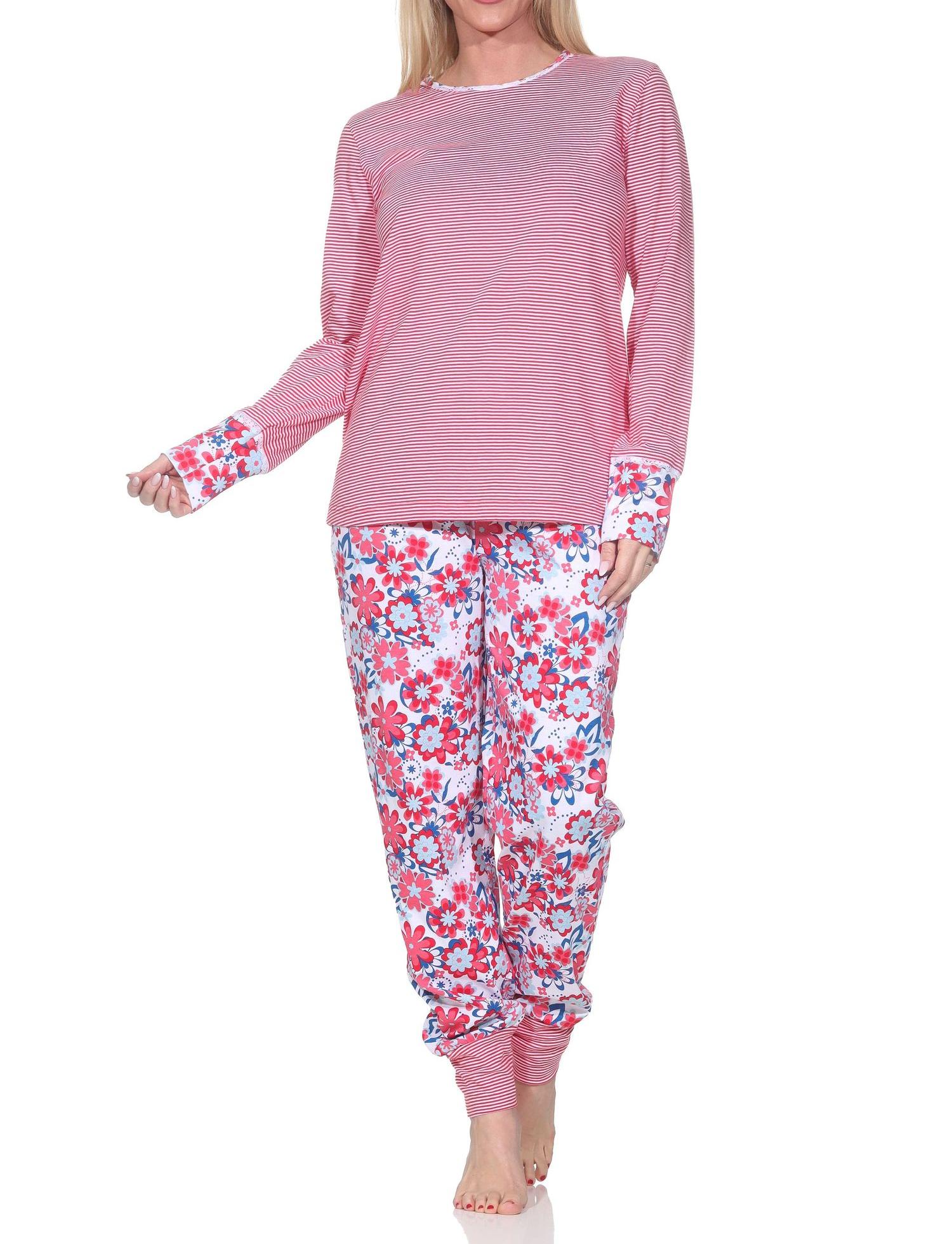 - WUNDERSCHÖNE OPTIK: Langarm Damen Pyjama in toller Optik mit farblich abgesetzten Bündchen, Oberteil in garngefärbter Streifenoptik, Hose mit floralen Alloverdruck