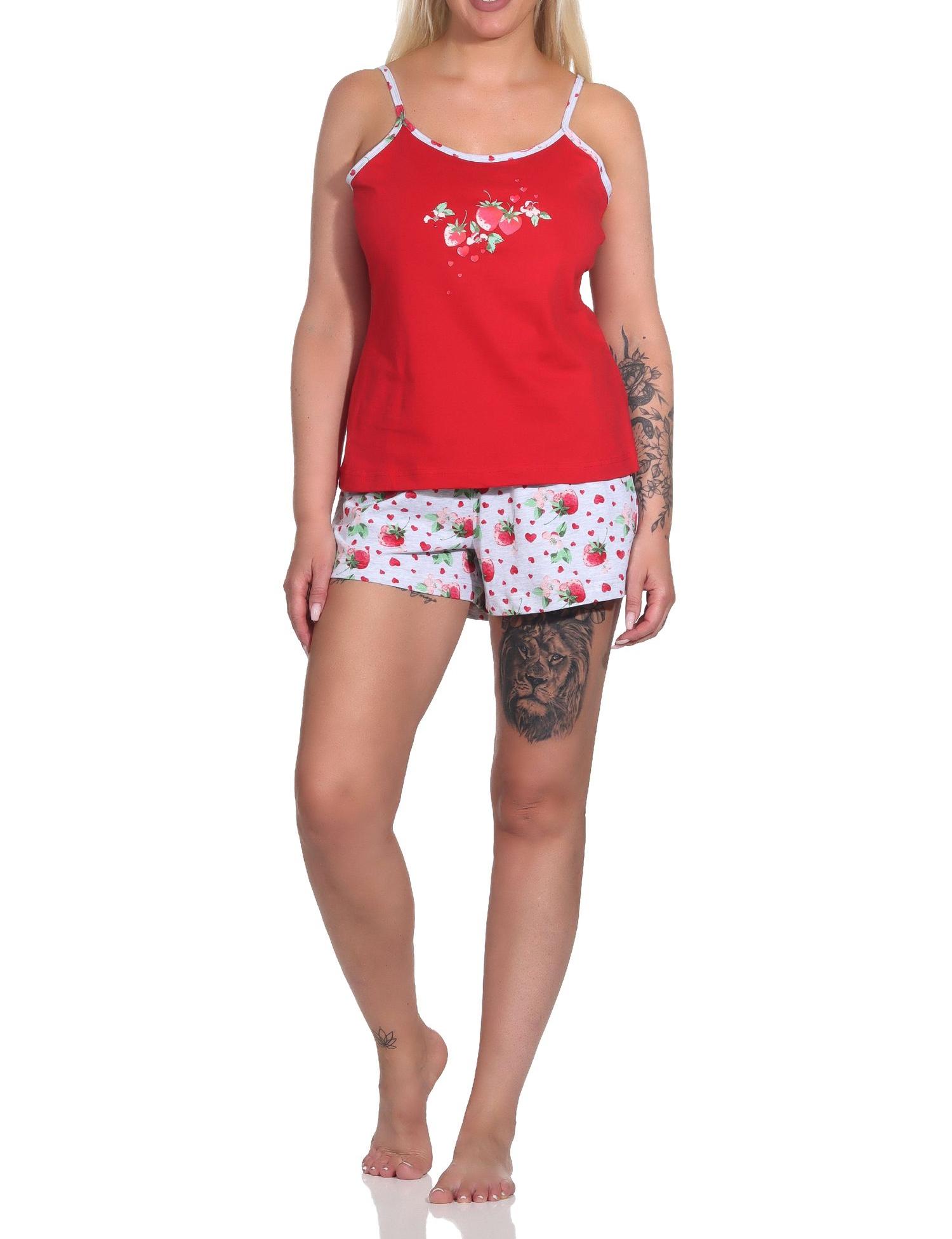 - WUNDERSCHÖNER STYLE IM ERDBEERLOOK: Ärmelloser Damen Shorty Pyjama mit Spaghetti-Trägern in süsser Optik mit bedruckter Pyjamahose und mit süssen Erdbeeren als Motiv