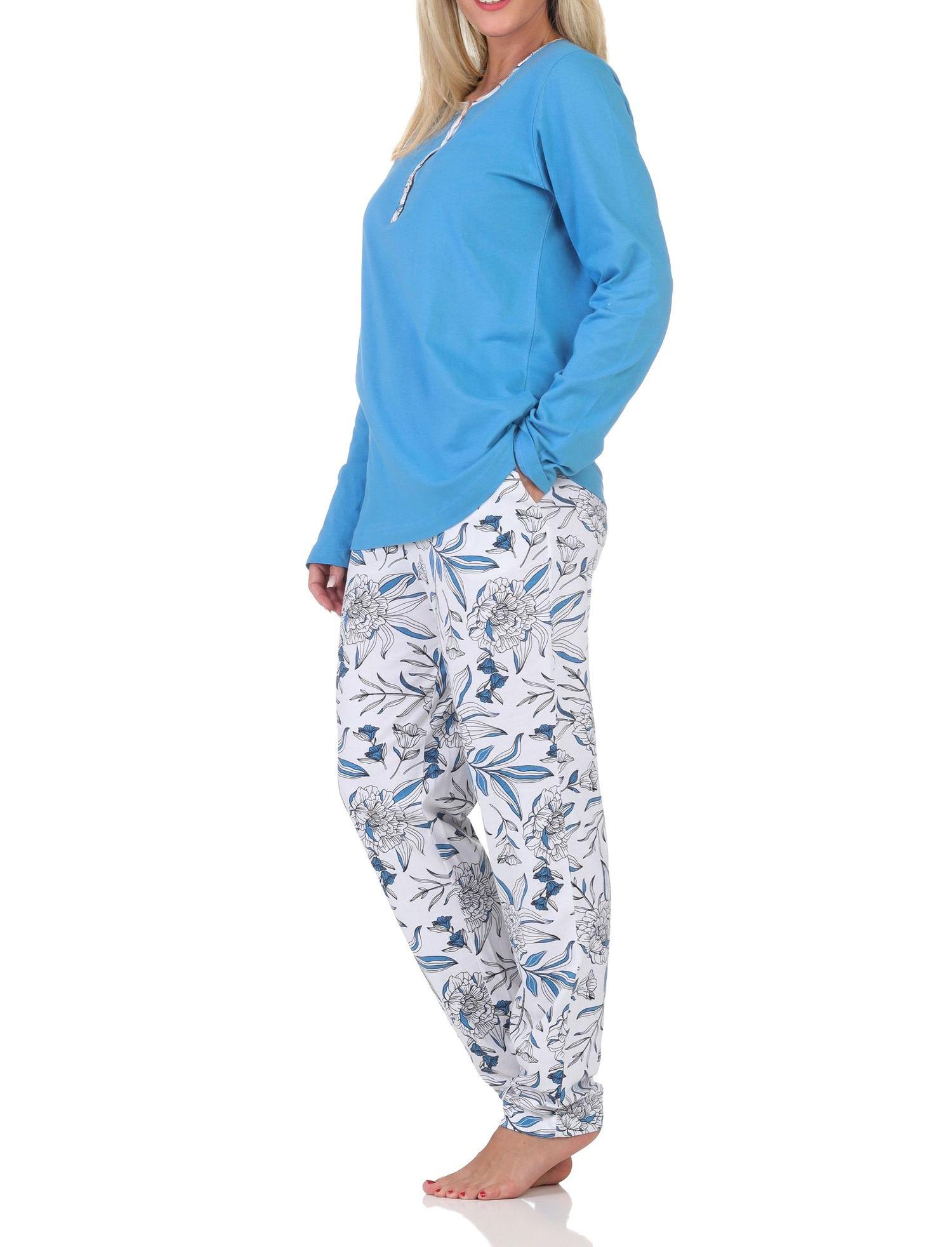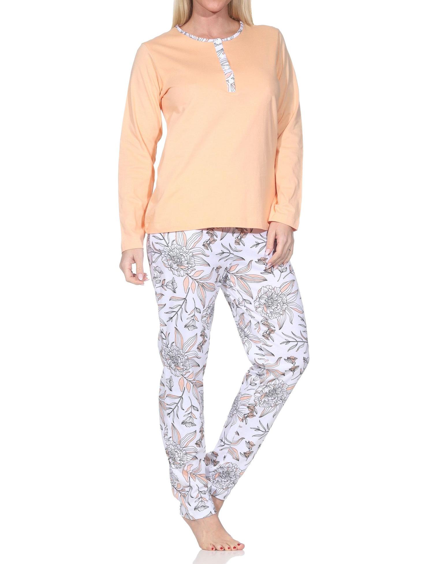 - SOMMERLICHE FARBEN: Langarm Pyjama mit modisch bedruckter Hose in floraler Optik, Oberteil des Schlafanzug in sommerlich aktueller Farbe